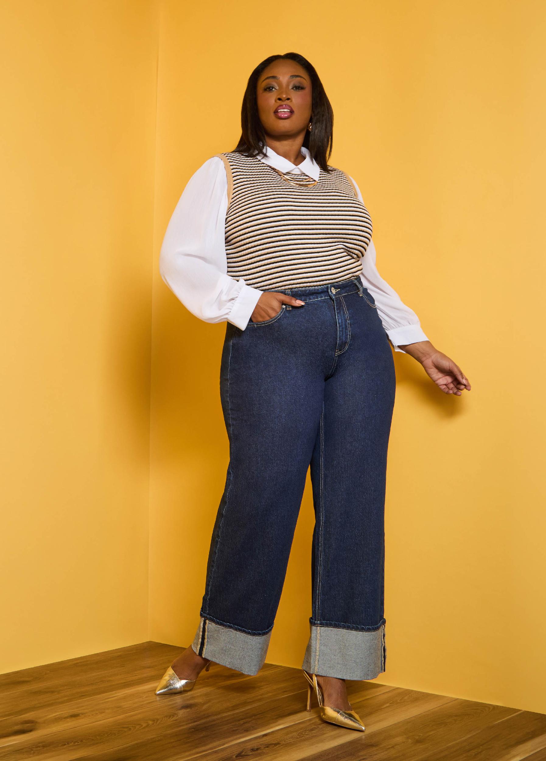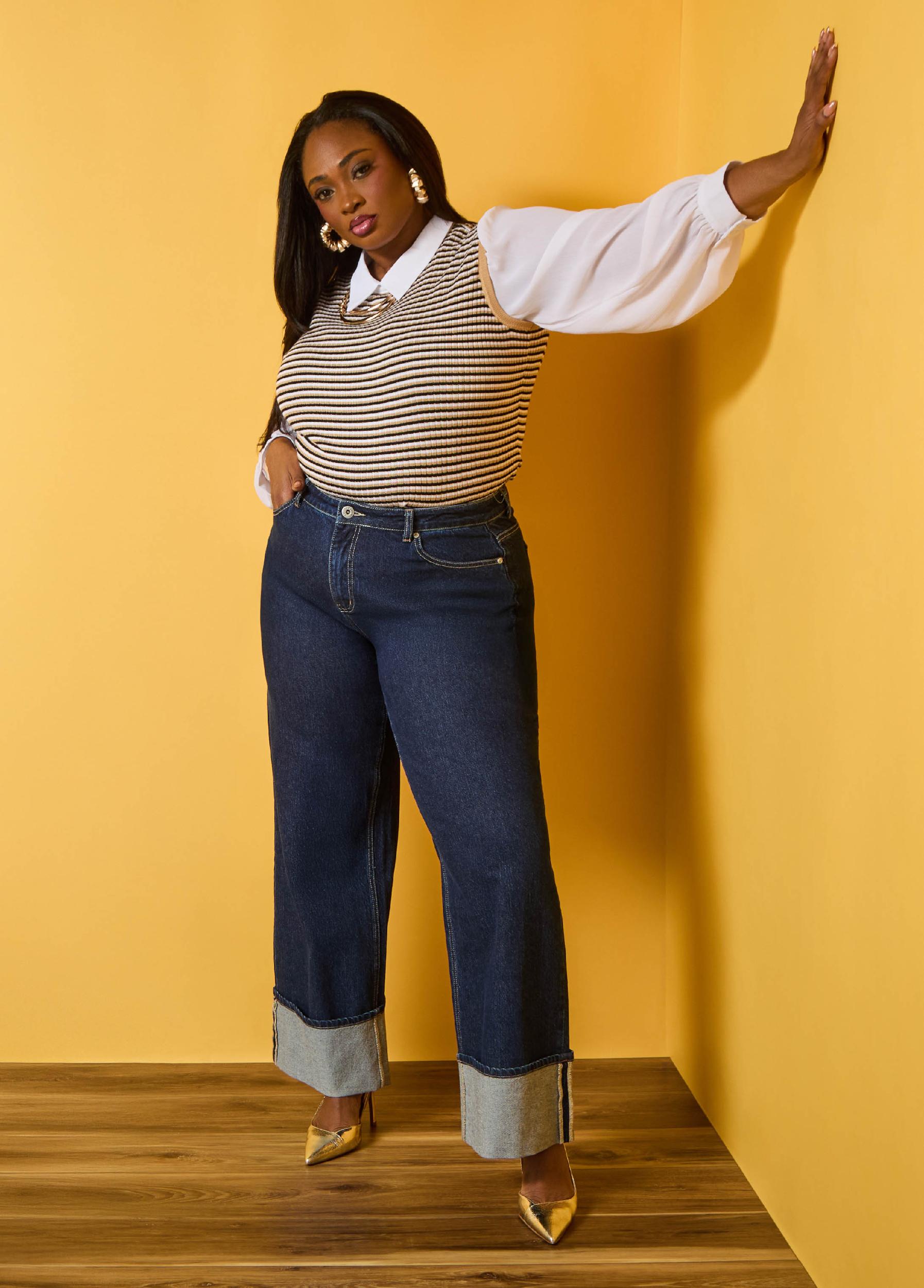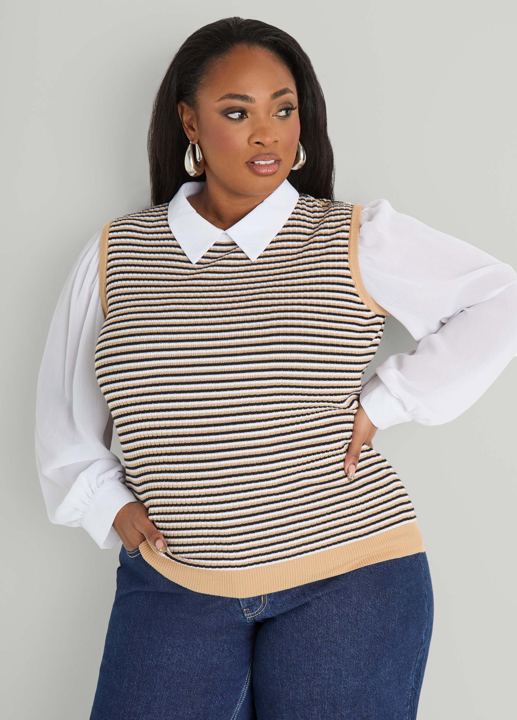 This striped ribbed-knit sweater is designed to give the look of a layered outfit in one easy piece. A textured-woven collar and matching sleeve panels create the effect of a sweater vest worn over a collared shirt, finished with button-fastening sleeve cuffs.