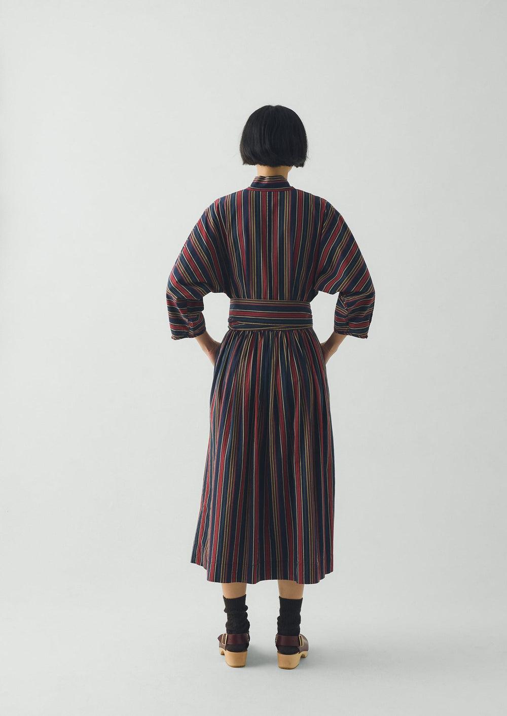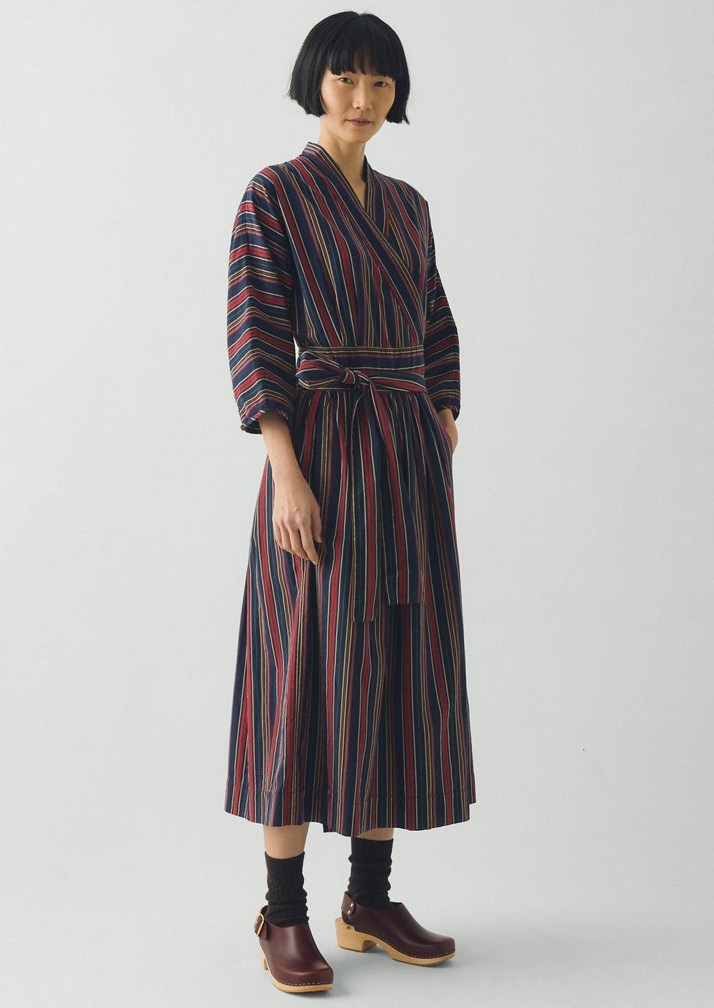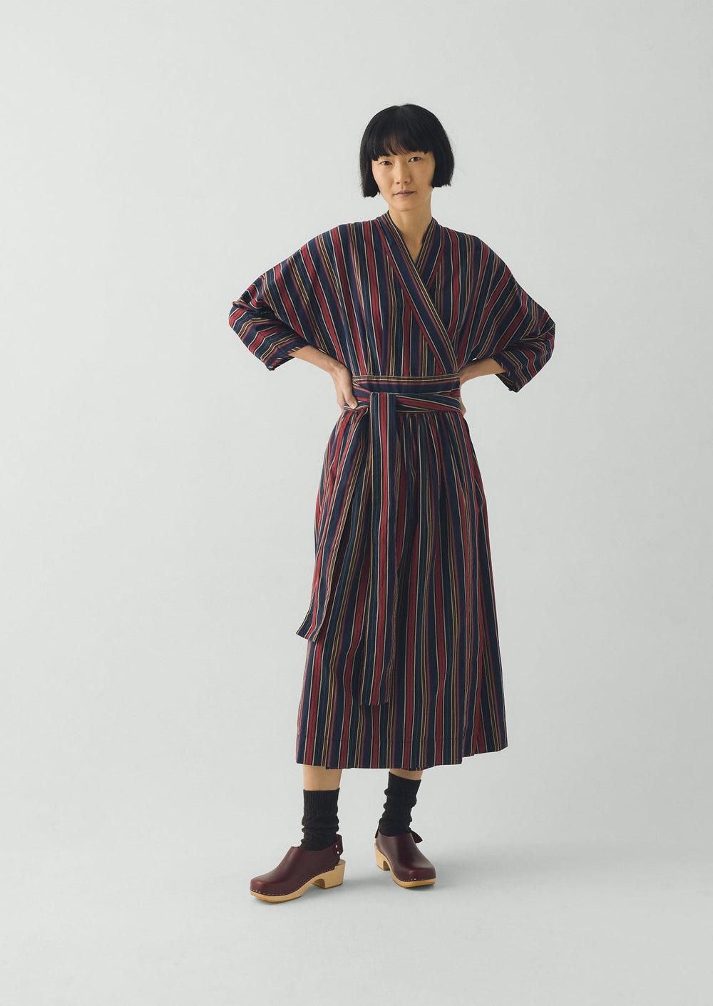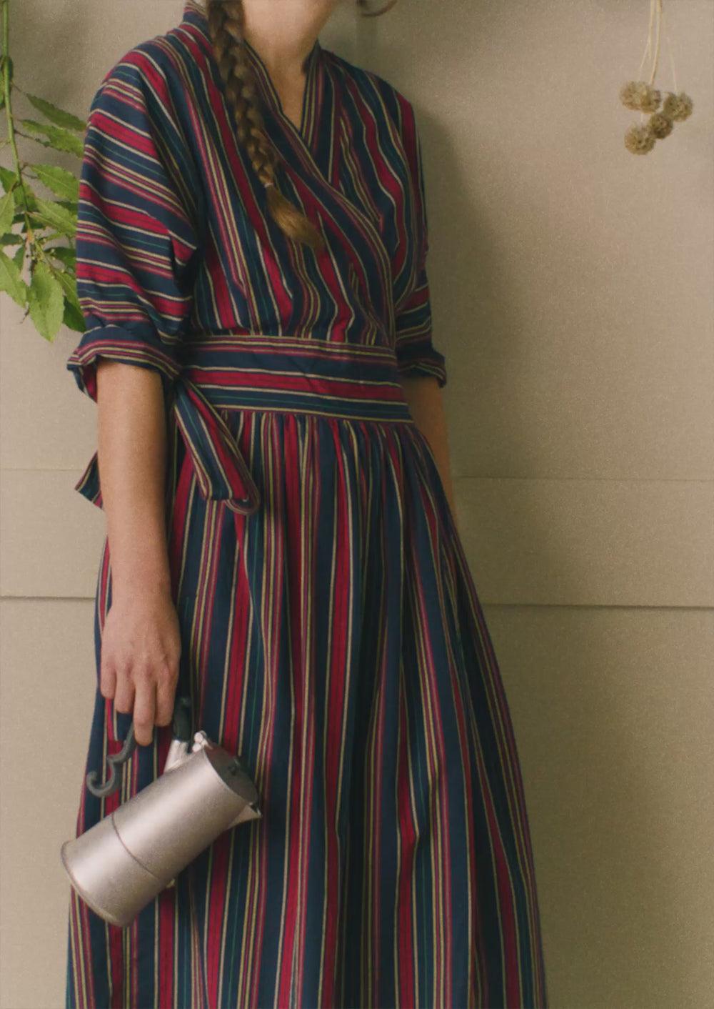 Gathers at the waist bring movement through our wrap dress. Made from striped cotton inspired by textiles that might be found in a pantry. Finished with side pockets and falling to a lower-calf length.