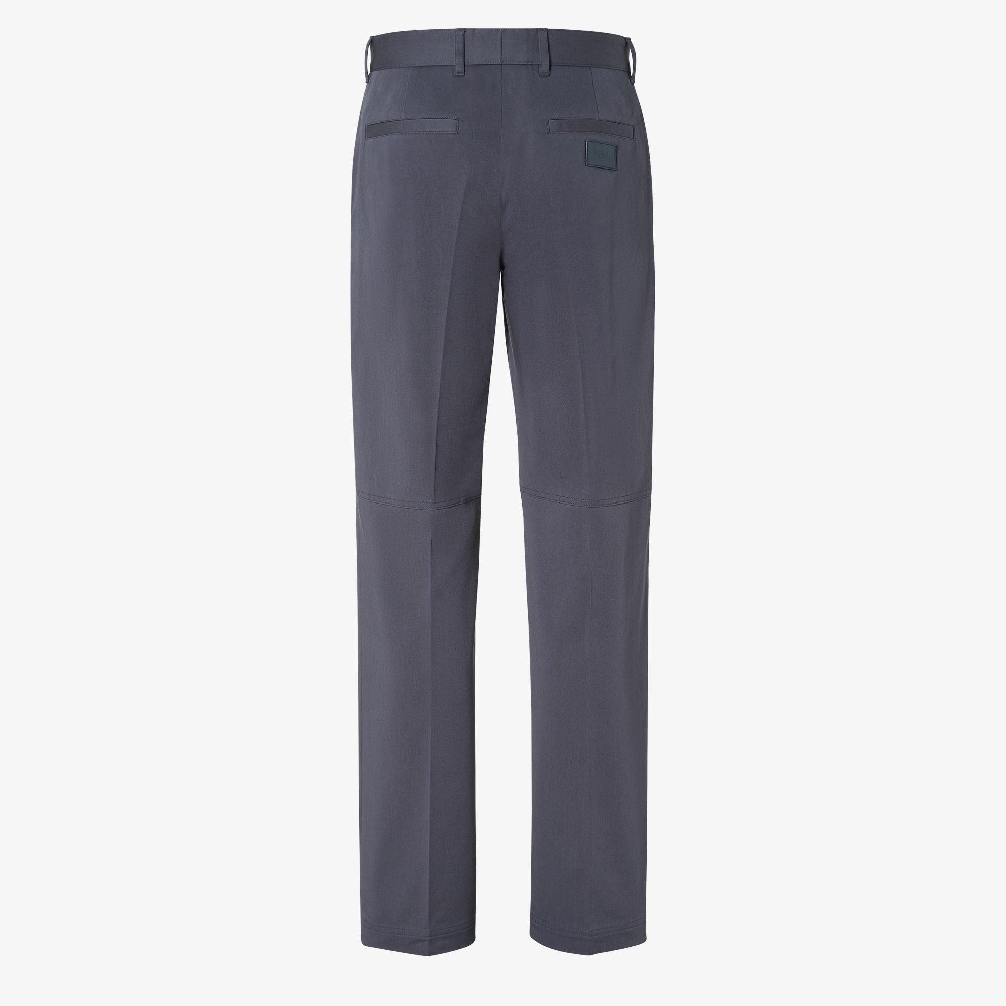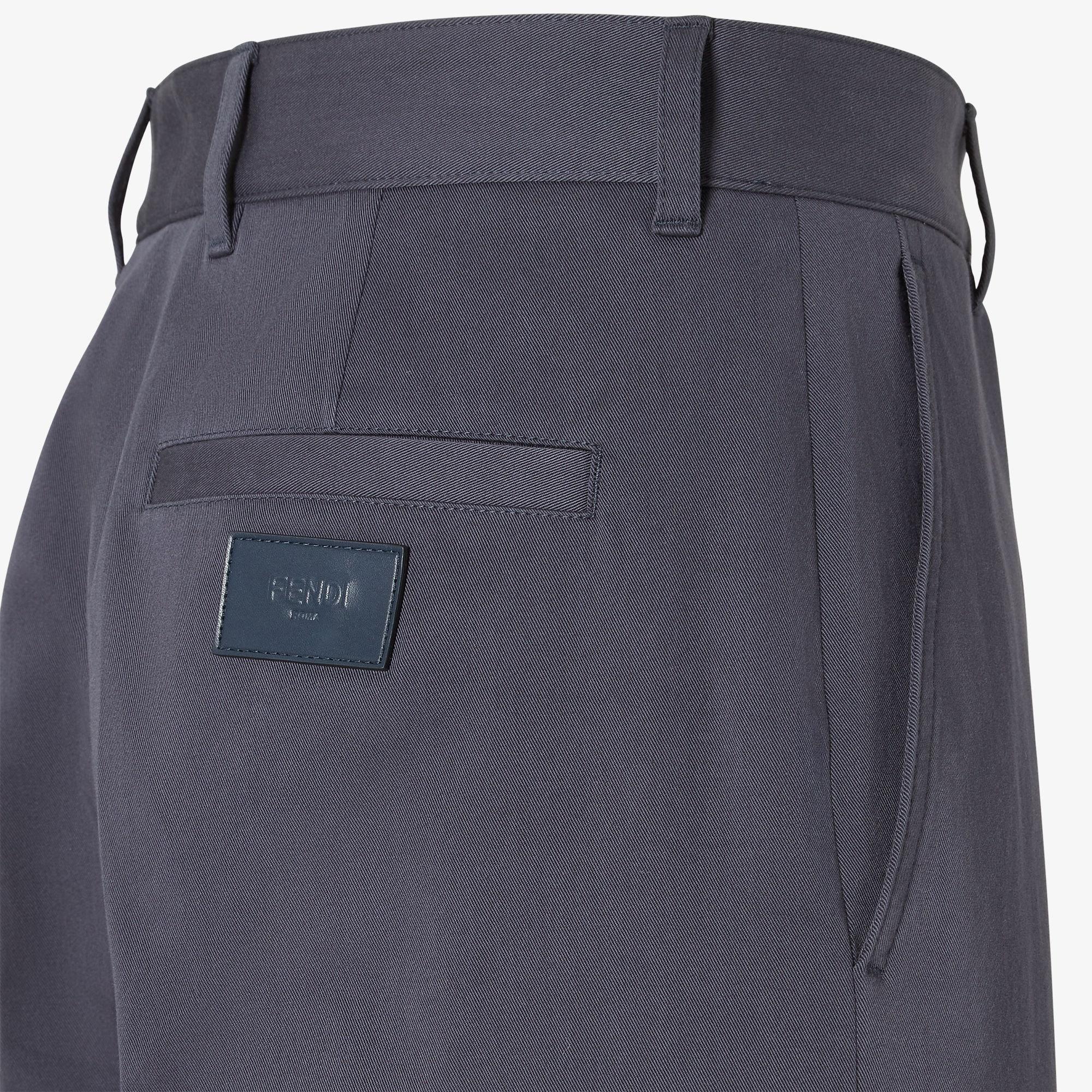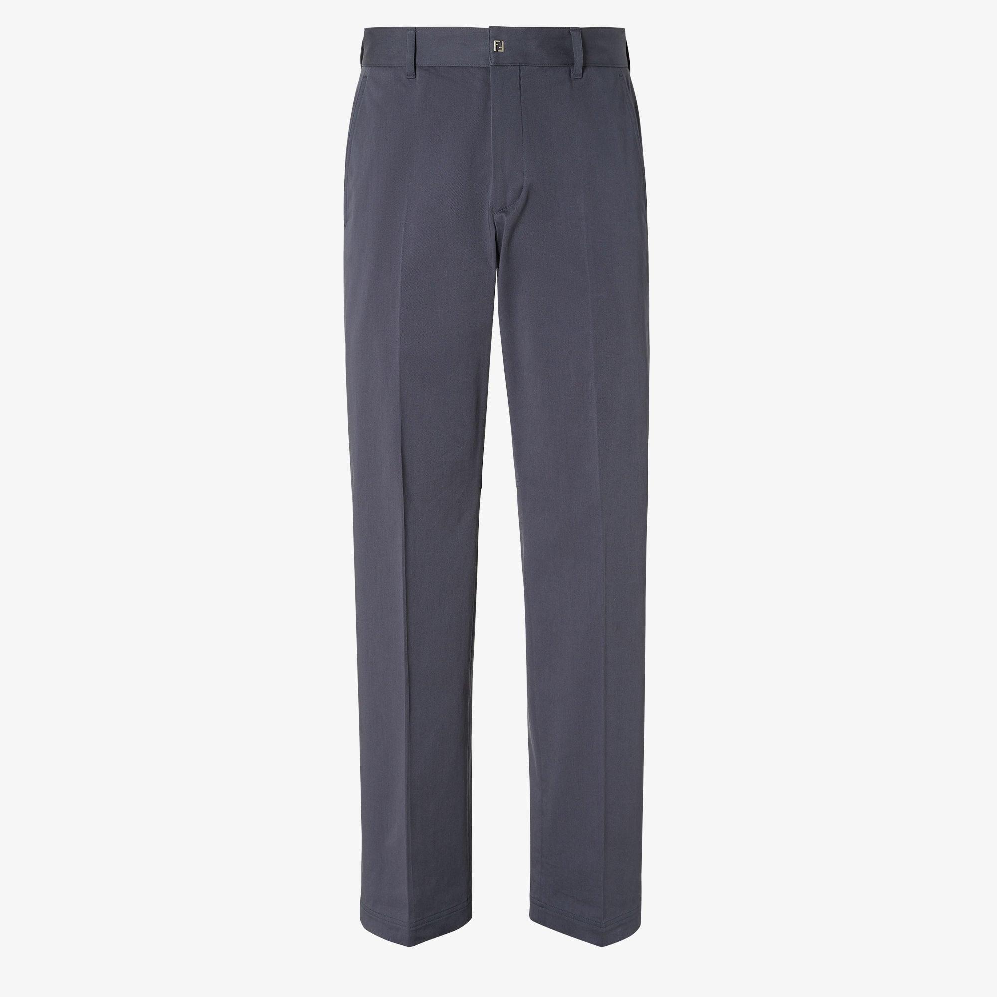 Cigarette pants with side pockets. Belt loops on the waistband and trouser crease. Concealed zipper and hook closure. Made of dark blue stretch gabardine. Customized with a button-effect palladium-finish metal micro FF logo applied at the waist. Made in Italy