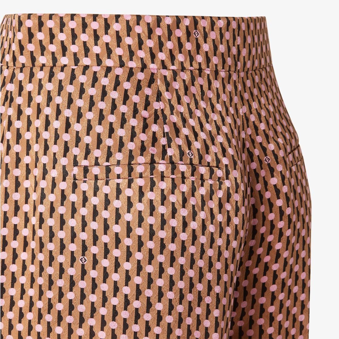 Wide leg pants with trouser crease. Side pockets and welt pockets on the back. Concealed zipper and hook closure. Made of silk jacquard with geometric Fendi Mini Dots motif in pink and camel, inspired by the iconic Fendi Fall/Winter 2000 fashion show. Made in Italy