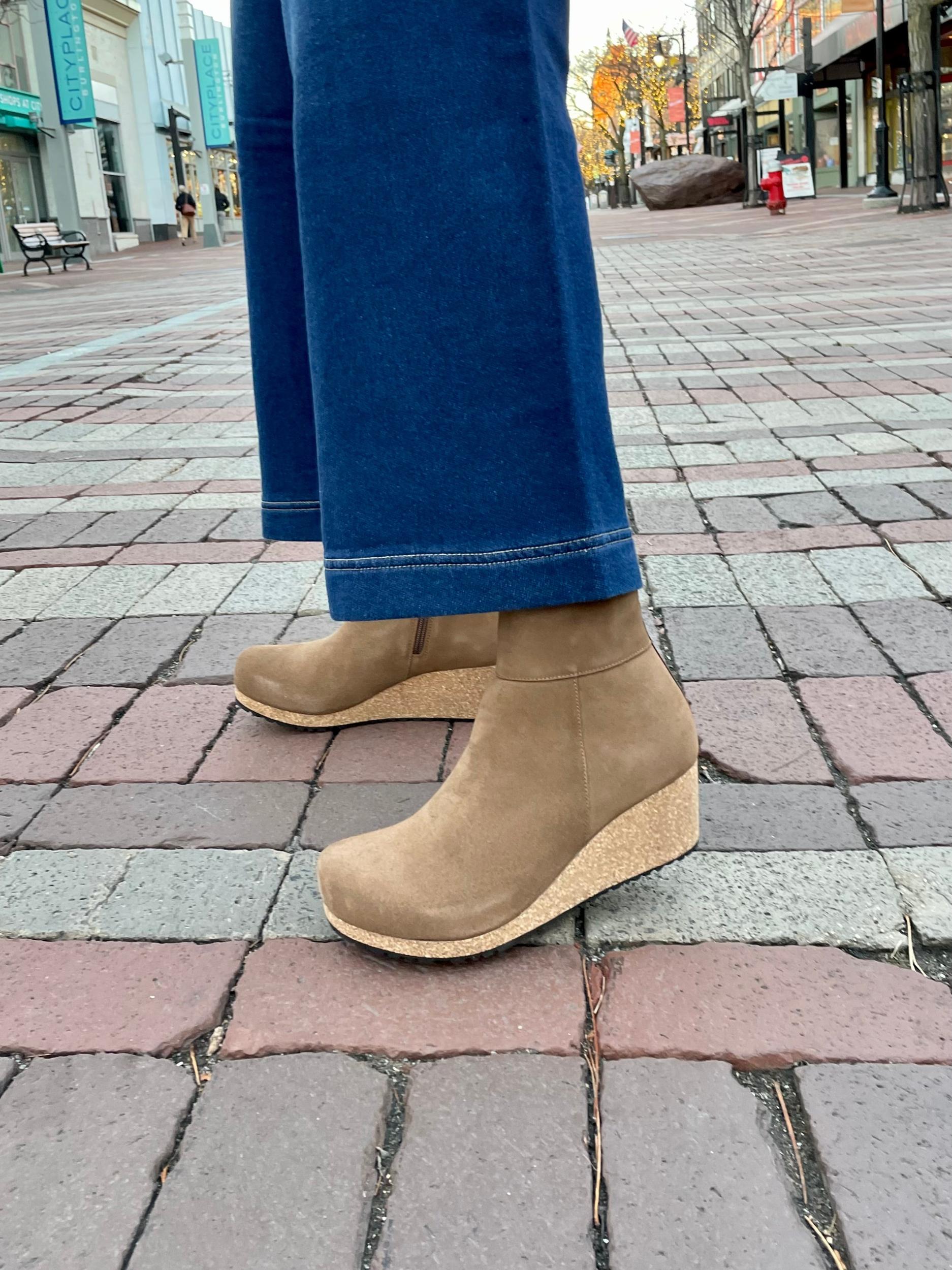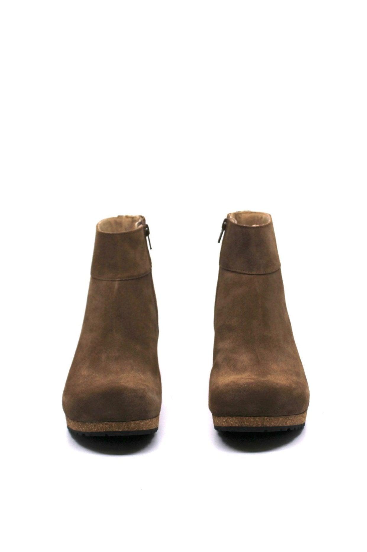 Upgrade your style with the Papillio by Birkenstock Ebba Dark Tea Narrow ankle boot. The contoured BIRKENSTOCK footbed provides comfort, while the cork wedge heel adds a trendy touch. Made with smooth suede, this boot offers both comfort and style without sacrificing pressure on the front of your foot.