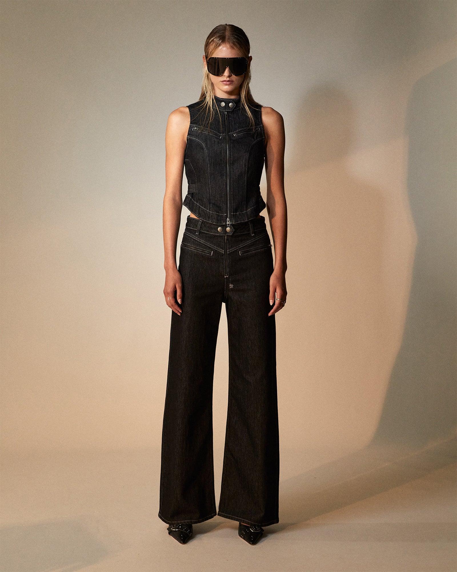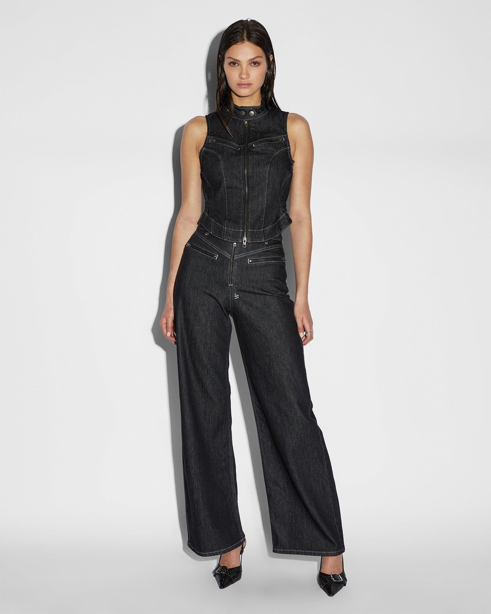 The Paradigm Gilet Midnight is a moto-inspired vest made from a premium comfort stretch denim in a textured black wash with a light-grey topstitch. This vest features an exposed metal two-way zipper down the front and exposed zip pockets. Style back with the matching Paradigm Skirt Midnight.