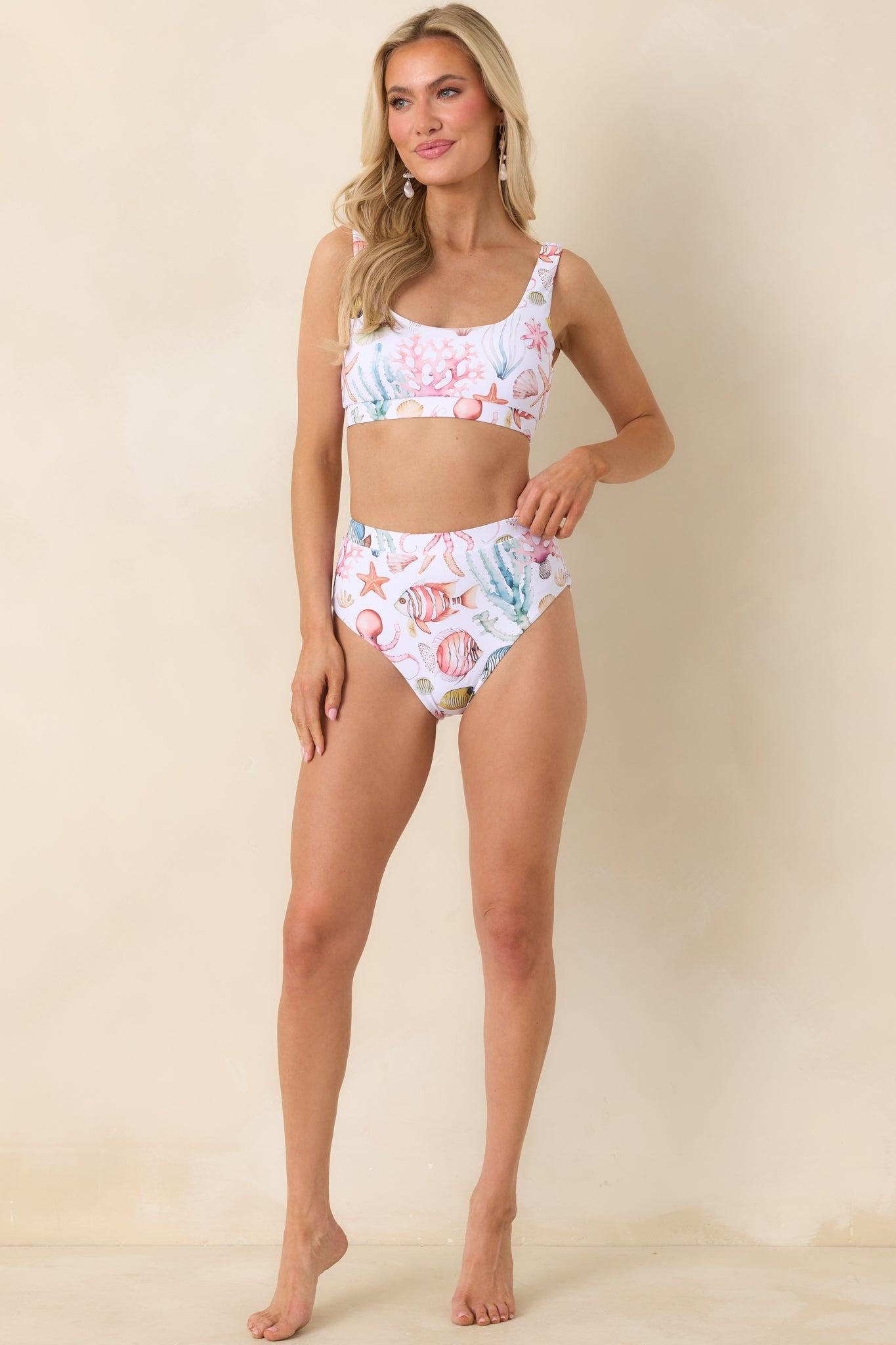 Sun-soaked and effortlessly playful, the Paradisa Delphina Multi Sporty Scoop Bikini Top brings vibrant coastal charm to your swim lineup. Featuring a soft scoop neckline and a whimsical ocean-inspired print in warm corals, seafoam greens, and sandy neutrals, this top feels both fresh and feminine. Designed for carefree beach days and golden-hour dips, it pairs perfectly with matching bottoms or your favorite solid swim separates. This bikini top features a scoop neckline with wide shoulder straps for comfortable support and a secure fit. Designed with built-in cups for added shape and light support, it offers a smooth pull-on construction with a fully lined interior for coverage and durability. 95% Polyester & 15% Spandex Lining: 93% Polyester & 7% Spandex Hand Wash Cold Manufactured in China Designed in The USA Model is 5'8" and Wearing a Size X-Small