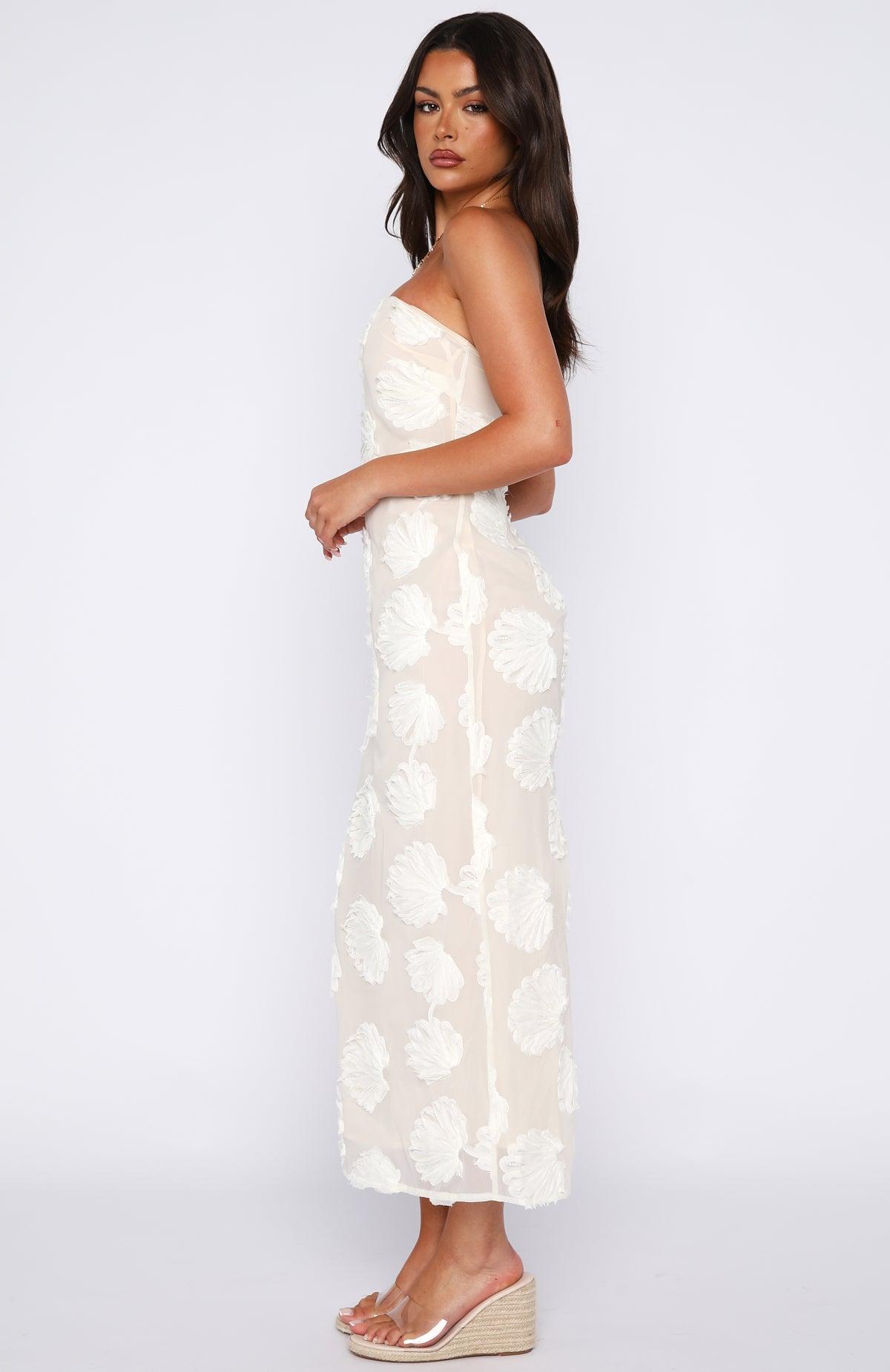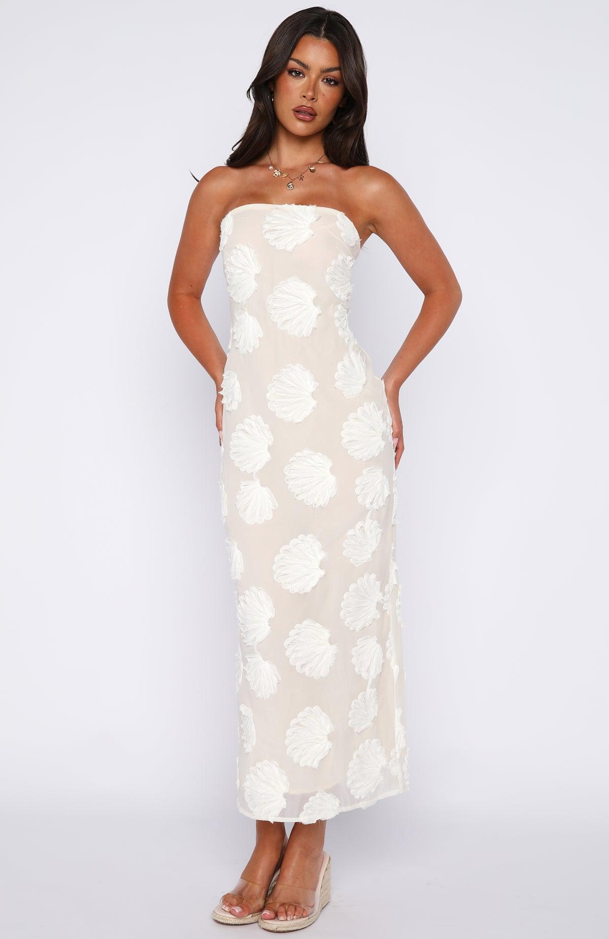 In a sunshine state of mind in the Paradise Cove Strapless Maxi Dress in Cream. Featuring a strapless neckline with secure grip‑tape support, a figure‑skimming silhouette, a back hem split, and a back zipper with hook‑and‑eye closure, it’s fully lined with a textured shell design and sparkling sequin detailing. Pair with kitten heels and layered gold jewellery for a summery look we love.