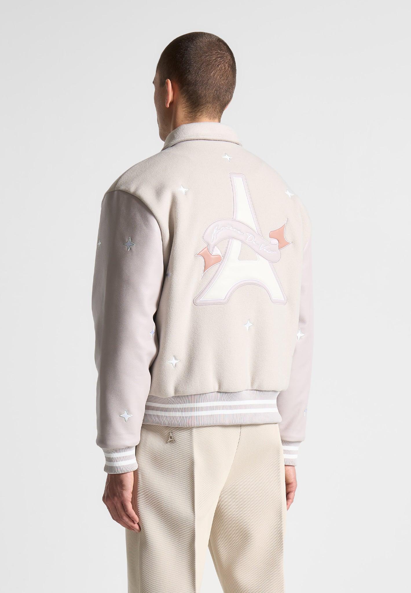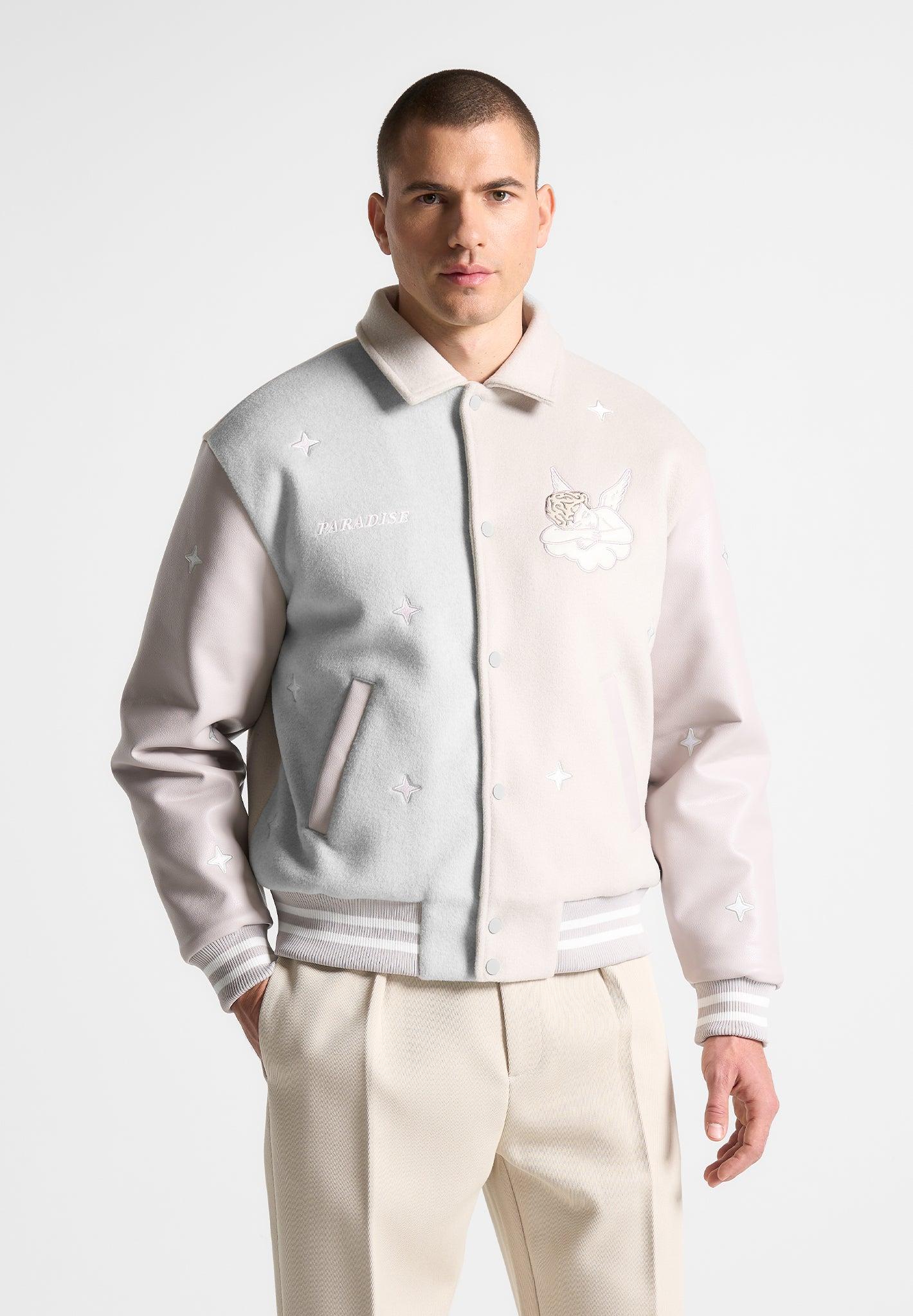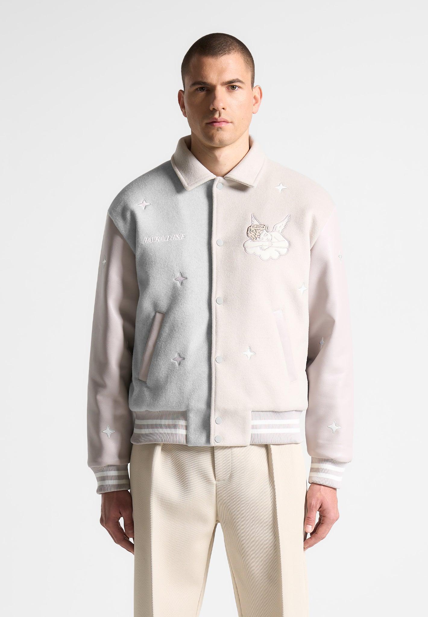 Introducing the Paradise Varsity Jacket, a versatile and stylish addition to your wardrobe. With angel embroidery, this jacket seamlessly transitions from day to night. Its relaxed fit ensures comfort and effortless style. Elevate your look with this must-have piece. Fabric: Always check the care label for wash instructions. Model is 6'0", 40" Chest, 30" Waist and Wears Size Medium Based On Size M - Front Length cm/in, Chest cm/in, Sleeve Length cm/in Stretch Factor - /3