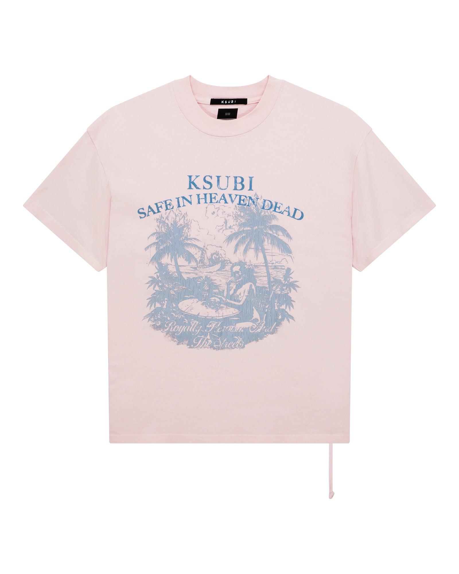 The Paradiso Ekcess Ss Tee Ice Quartz is a boxy oversized short sleeve t-shirt with a dropped shoulder and raw cut back hem. Made from premium heavyweight cotton jersey garment dyed in Ice Quartz, it features seasonal flocked artwork at the front, reversed overlocked side seams, signature rats tail, and is finished with T-box and 4x4 embroidery branding.