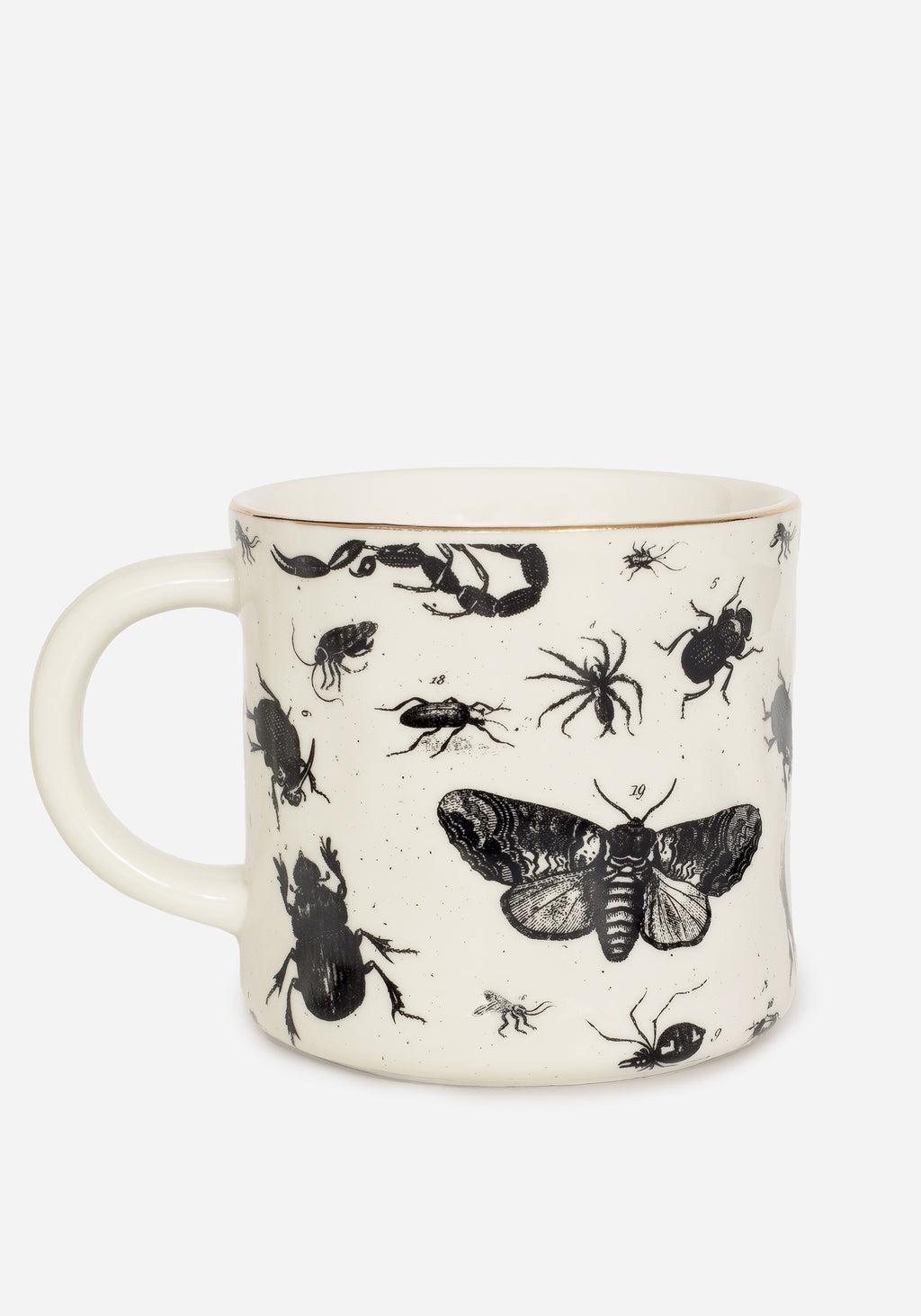 - White ceramic bugs print mug - Black Parasite bug print with gold foil rim - 'Hand-wrought' finish gives an organic feel & worn-in vibe - Slightly flared lip for sipping - Comfortable handle for gripping - Cue the, “There’s a fly in my drink!” jokes Hand wash onlyDo not microwaveDue to the nature of the glazing process, each item is unique and results may vary. Dimensions:10cm x 9.5cm