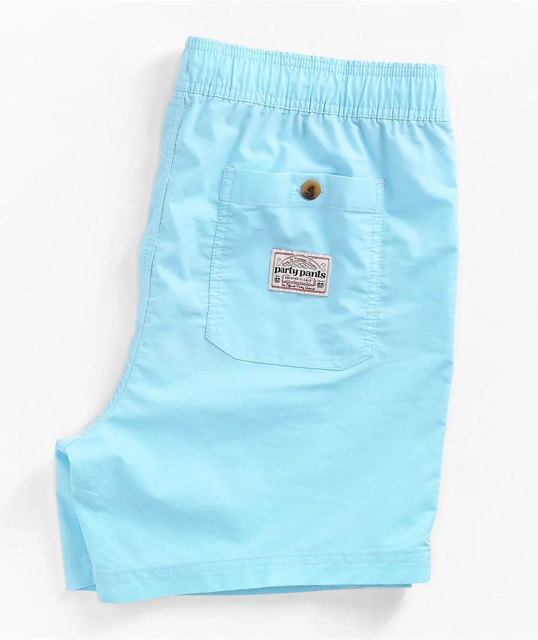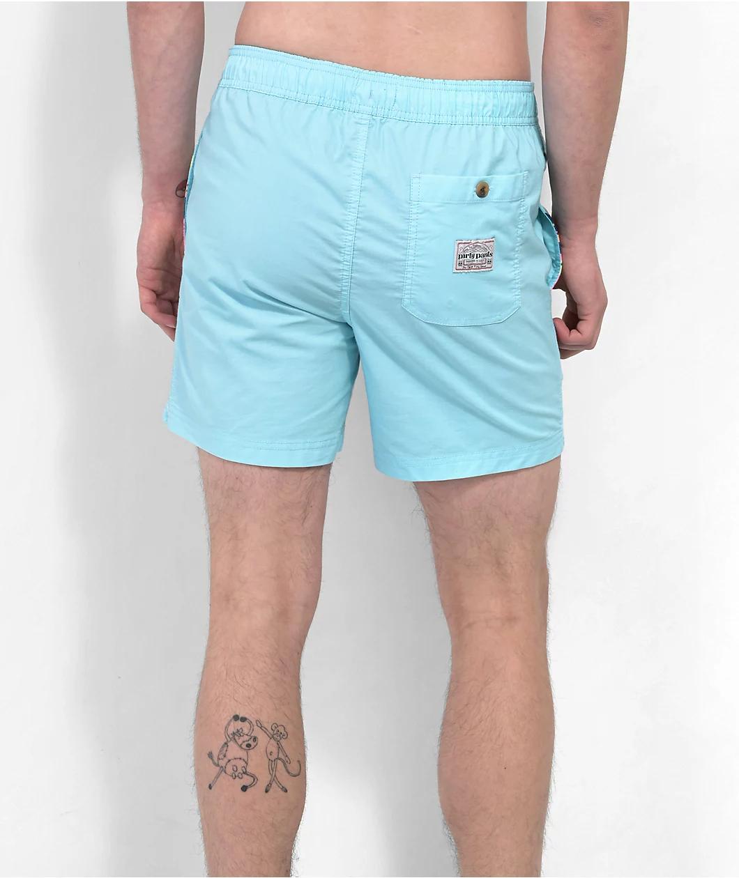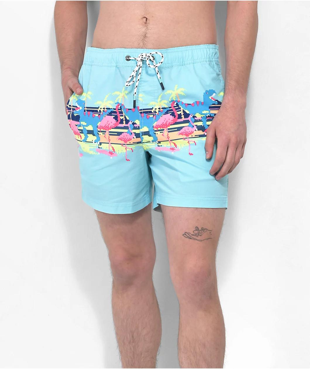 From Party Pants, the Pixel Paradise board shorts come in a light blue colorway, featuring 8-bit images of flamingos and dinosaurs sublimated throughout. The hybrid shorts are made from moisture-wicking material, and are complete with a liner-less deign,
