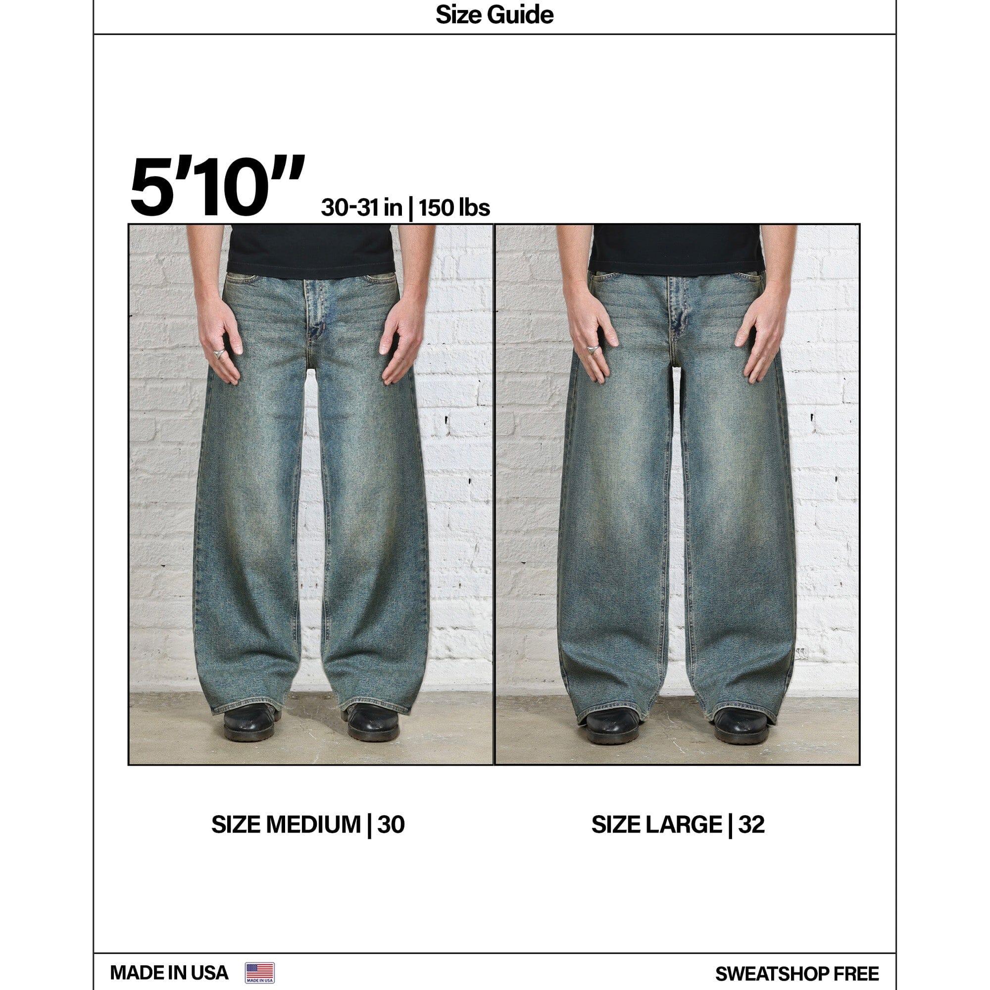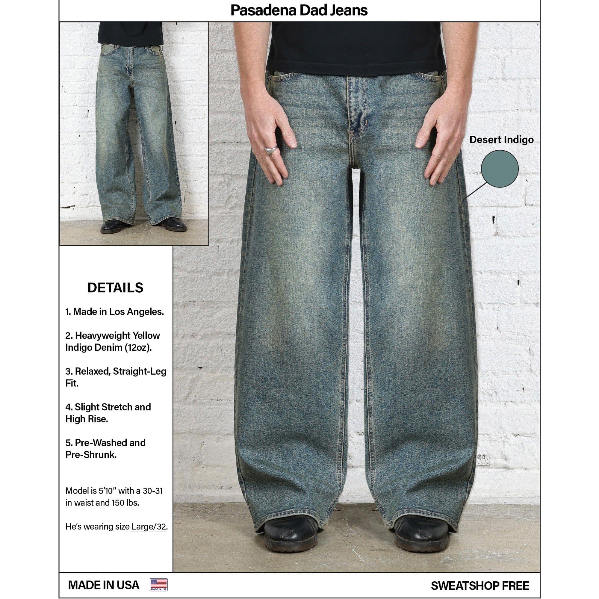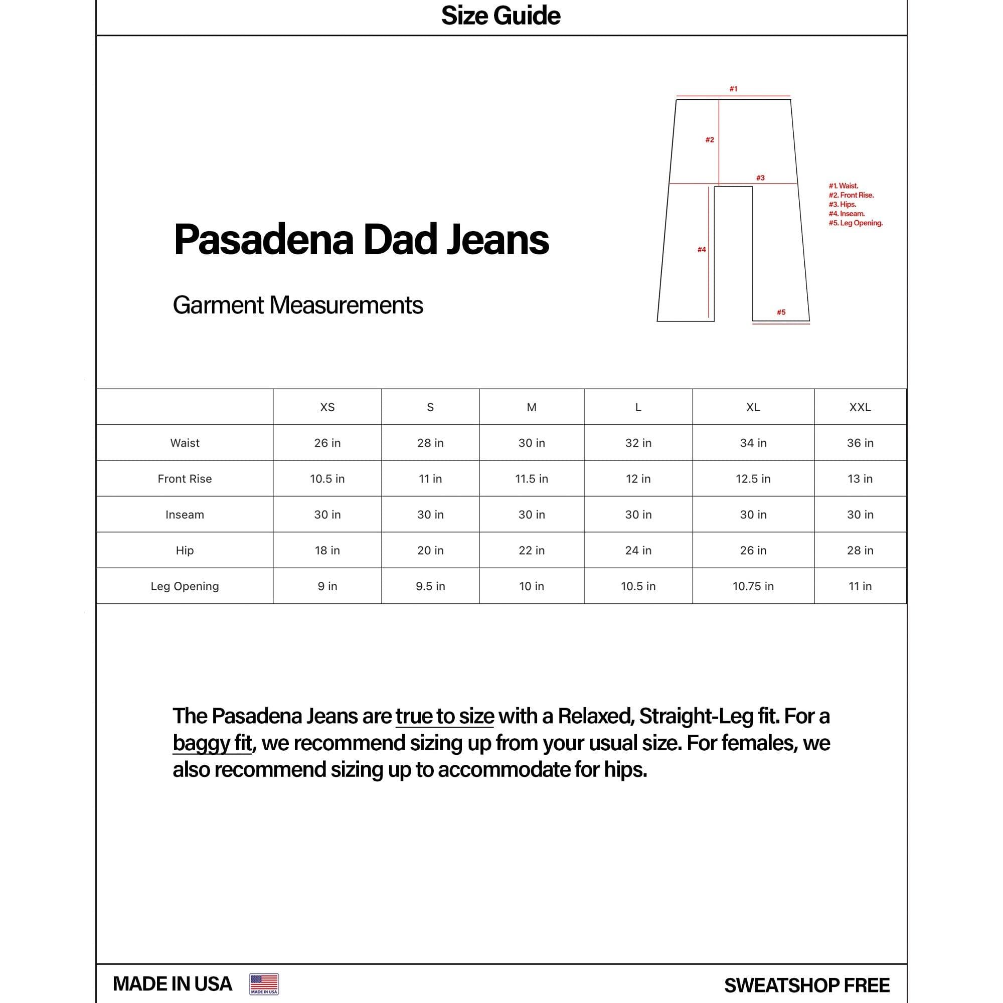 Introducing our most popular American-made garment: the Pasadena Dad Jeans. The Pasadenas are an elegant hybrid between a straight and wide-leg fit. We call it the “Dad” fit.Like all of our clothes, the Pasadenas are lovingly Made in the USA in a sweatshop-free, fair-wage facility. Details: Made in the USA. Relaxed, Straight-Wide Leg Fit. Pre-Washed and Pre-Shrunk. 12 oz denim (97% Cotton, 3% Elastane). True to size. For a baggy, relaxed look, we recommend sizing up.