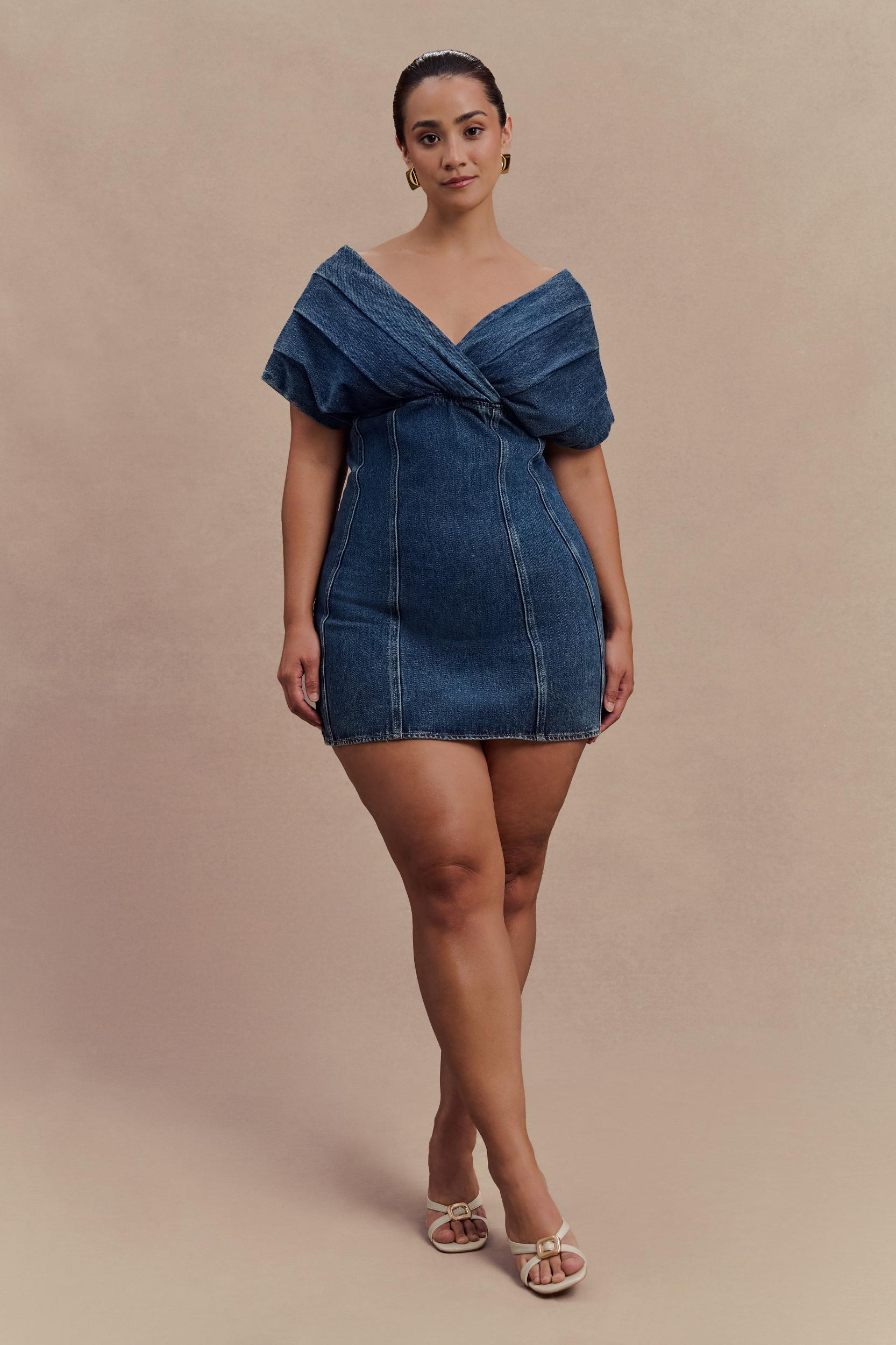 Your fresh take on event dressing. The PASCALE Off Shoulder Denim White Dress brings a fresh take to feminine tailoring. Designed with a Bardot neckline and crossover detail at the front and back, this mini silhouette combines sculptural shape with flattering pleat accents through the bodice. A fitted waist enhances the form, while the mini length keeps it modern and playful. Finished with a back zip for a seamless fit, this dress is your go-to for elevated denim with a romantic twist.