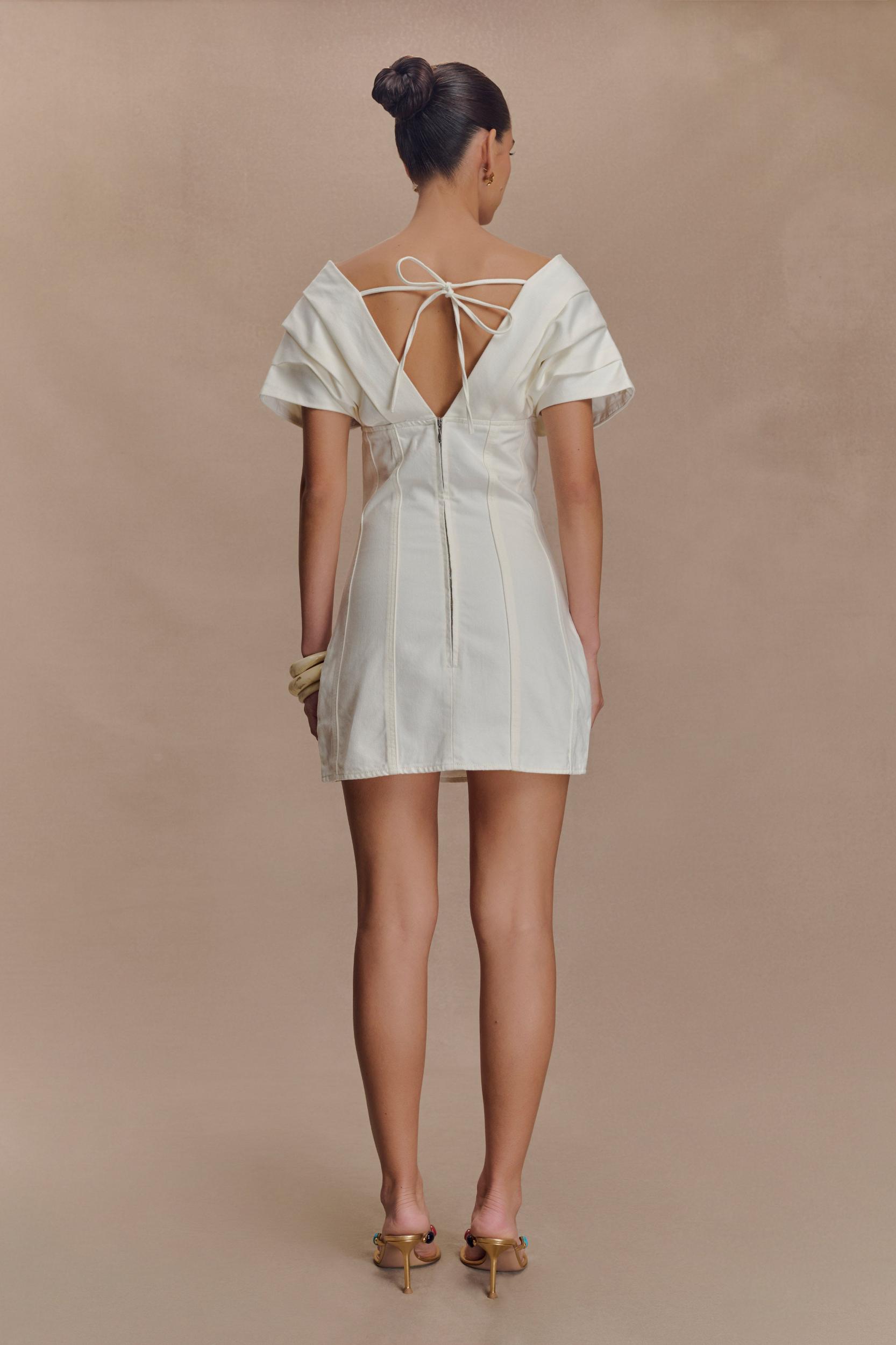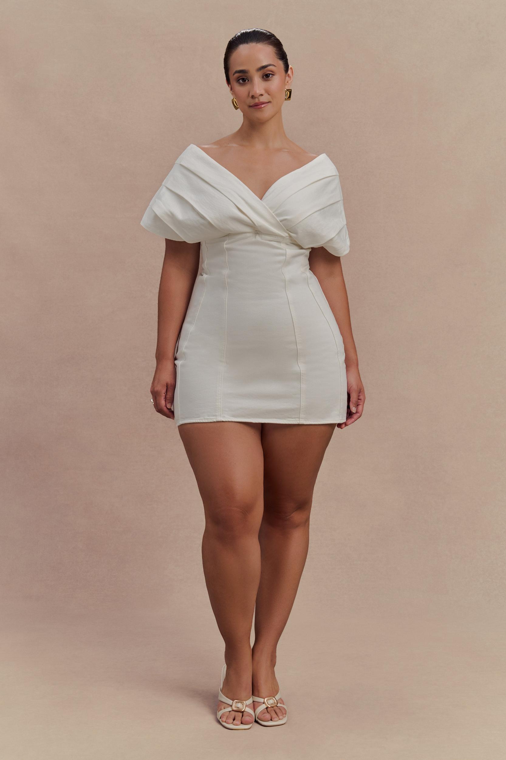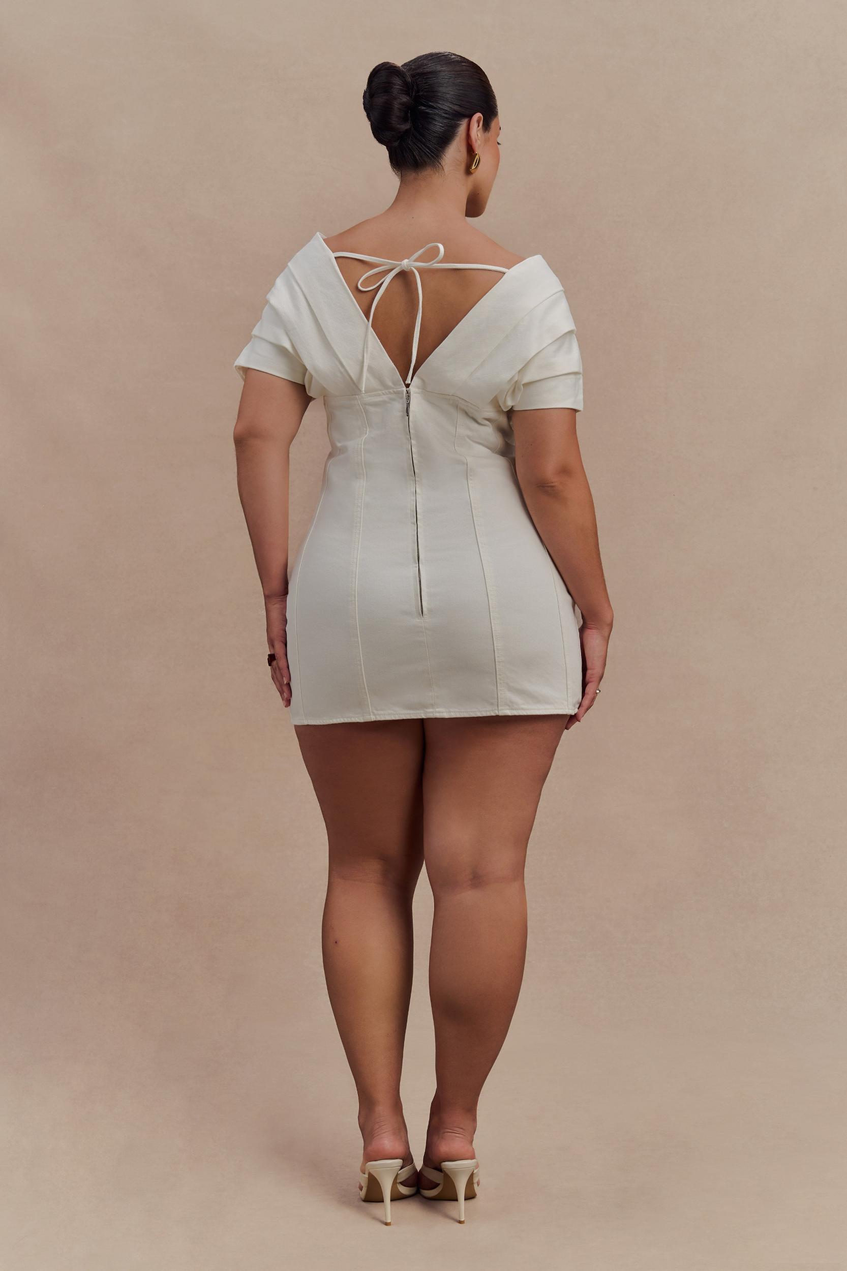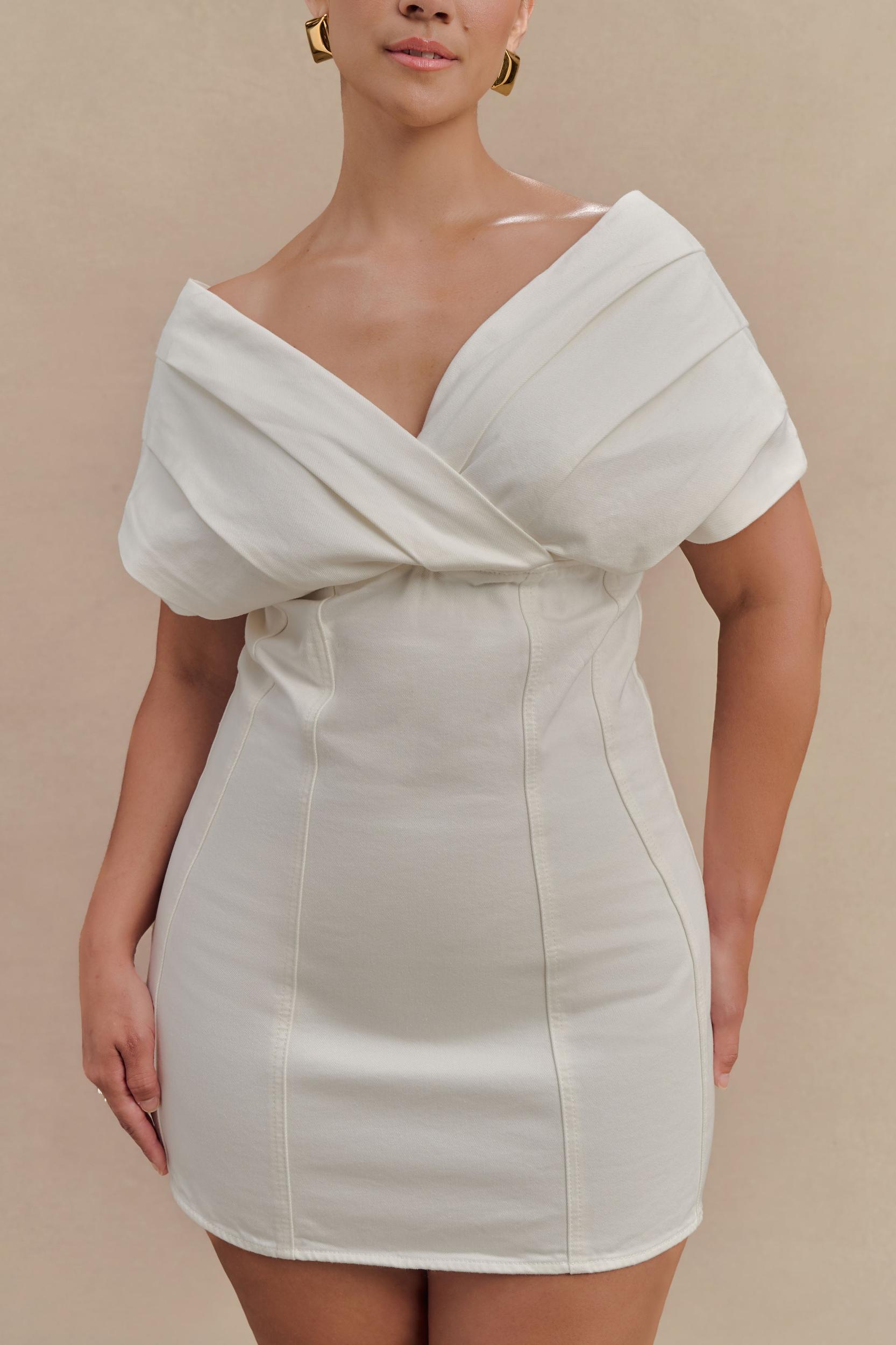 Your fresh take on event dressing. The PASCALE Off Shoulder Denim White Dress brings a fresh take to feminine tailoring. Designed with a Bardot neckline and crossover detail at the front and back, this mini silhouette combines sculptural shape with flattering pleat accents through the bodice. A fitted waist enhances the form, while the mini length keeps it modern and playful. Finished with a back zip for a seamless fit, this dress is your go-to for elevated denim with a romantic twist.