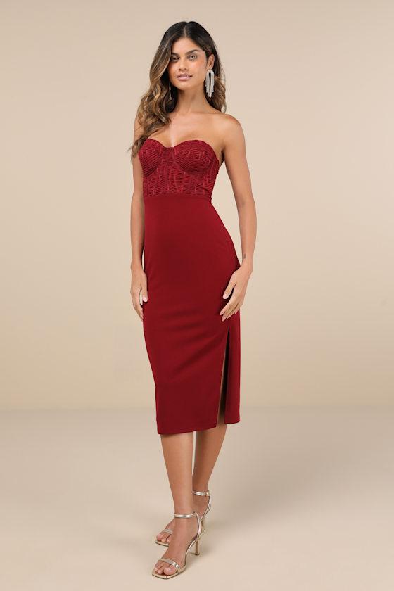 You'll draw in new admirers left and right when you step out in the Lulus Passionate Aura Wine Red Textured Strapless Bustier Midi Dress! Slightly stretchy crepe knit shapes this alluring dress that has a strapless sweetheart neckline (with hidden no-slip strips) and a bustier-style bodice with a textured, smocked-effect and supportive boning. High, fitted waist sits atop a figure-flattering bodycon skirt that ends at a midi hem with a sultry side slit. Hidden back zipper/clasp.