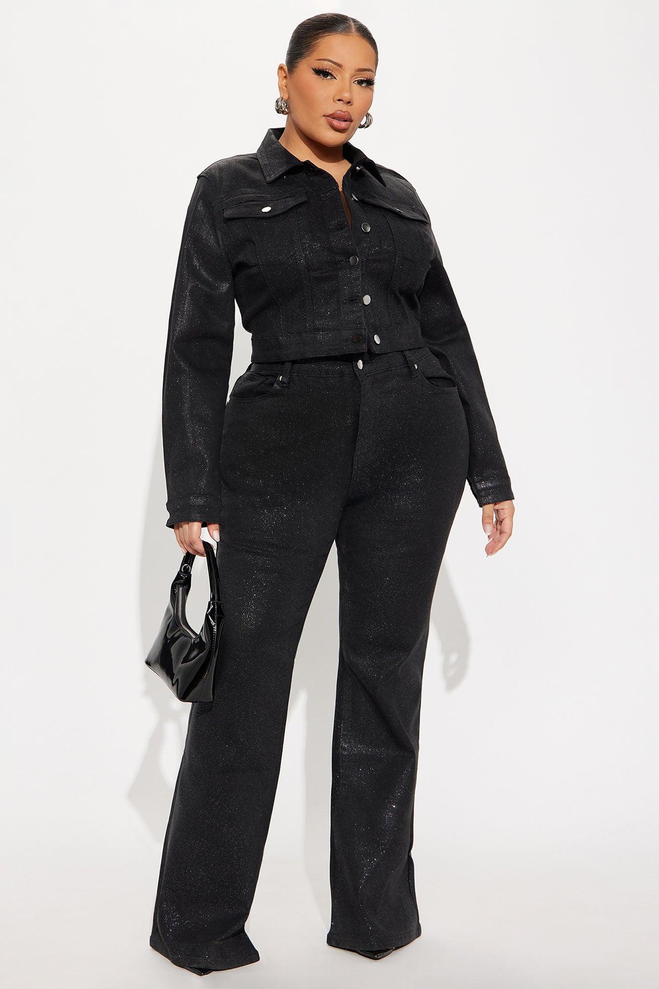 Available In Black. Denim Trucker Jacket Pair With Past Midnight Glitter Foil Flare Jeans To Complete The Look! Glitter Foil Collar Button Up Closure Front Chest Pockets Medium Stretch 68% Cotton 27% Polyester 3% Rayon 2% Spandex Imported California Proposition 65WARNING: Cancer and Reproductive Harm - www.P65Warnings.ca.gov.