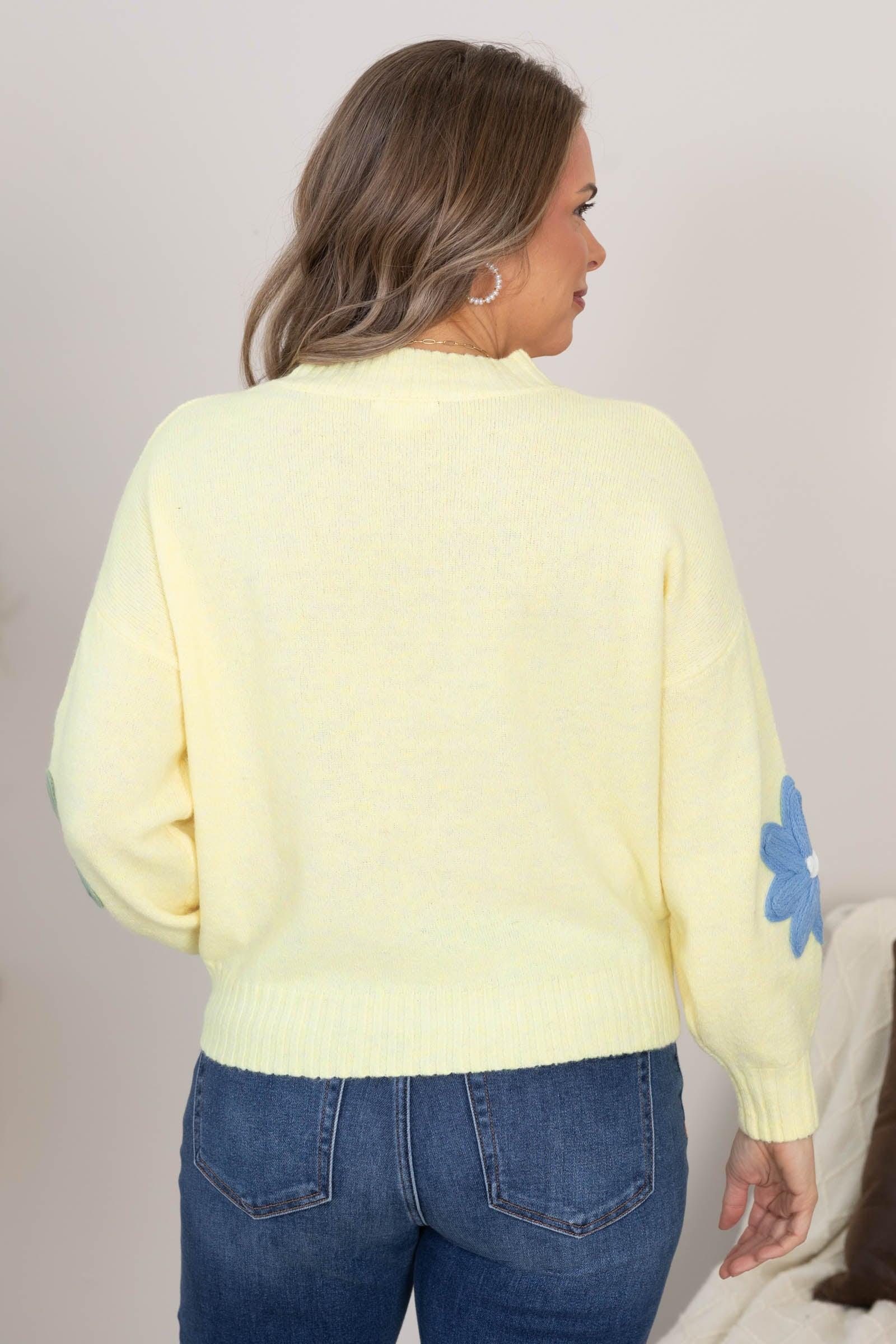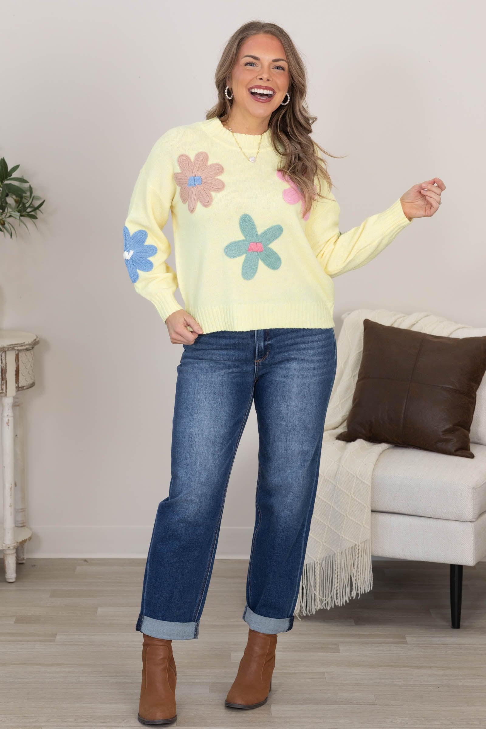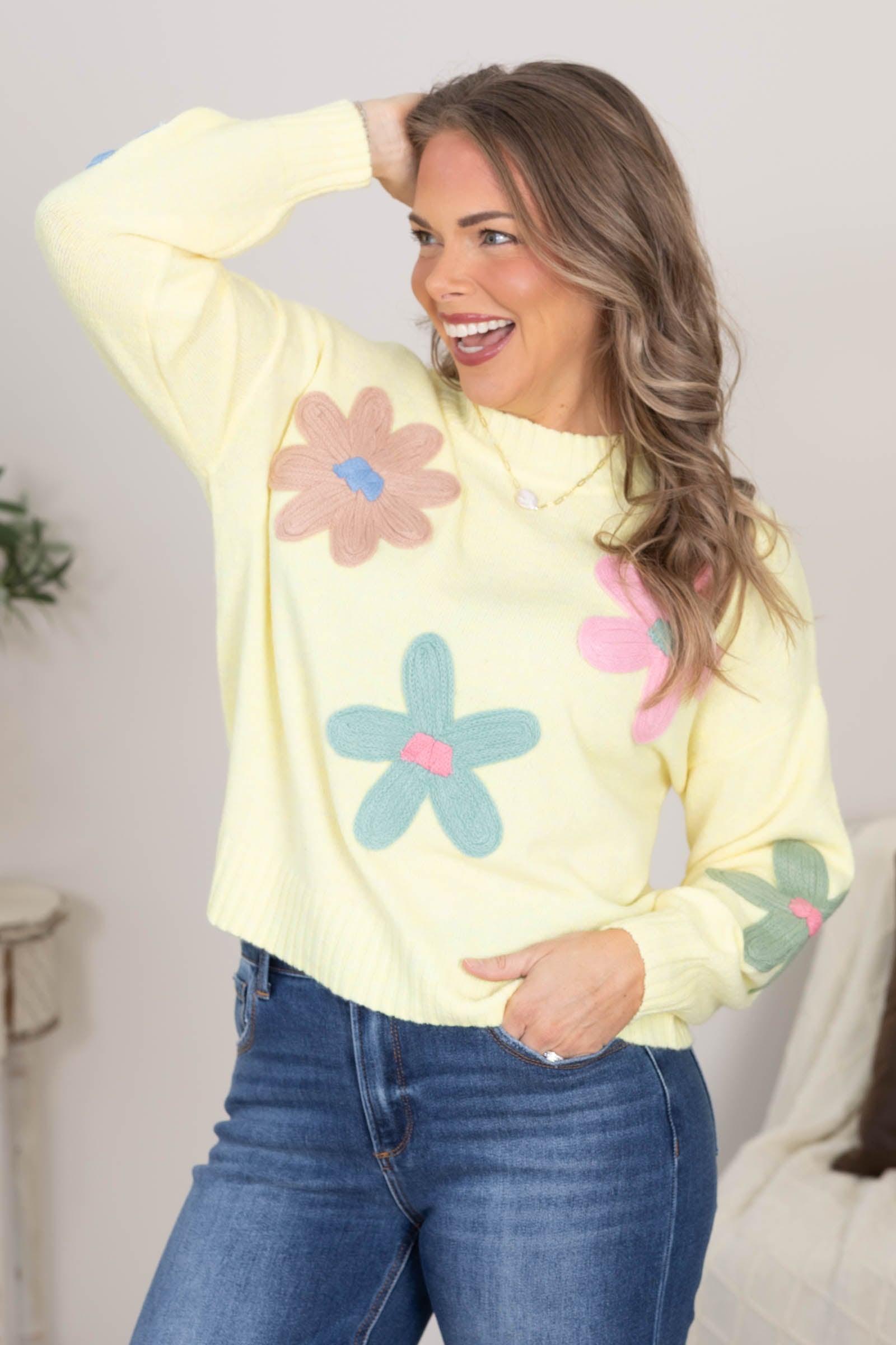 Product Details Colors: Pastel Yellow, Light Pink, Mint, Dusty Blue, Mauve, White, Cornflower Print: Floral Neckline: Round Sleeve: Long Sleeve Hemline: Straight Brand: Blu Pepper Material and Care 50% Recycled Polyester 15% Polyester 13% Acrylic 13% Nylon 6% Wool 3% Spandex Hand Wash Cold Hang/Line Dry Size and Fit Small: Bust 46" Waist 44" Length 21" Medium: Bust 48" Waist 46" Length 21.5" Large: Bust 50" Waist 48" Length 22" Erica is a photo model and wearing a size small