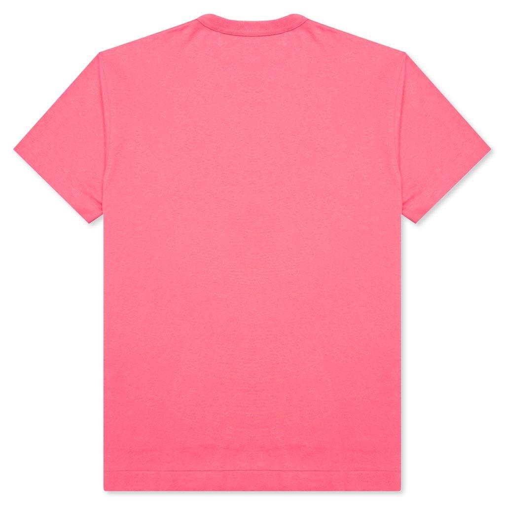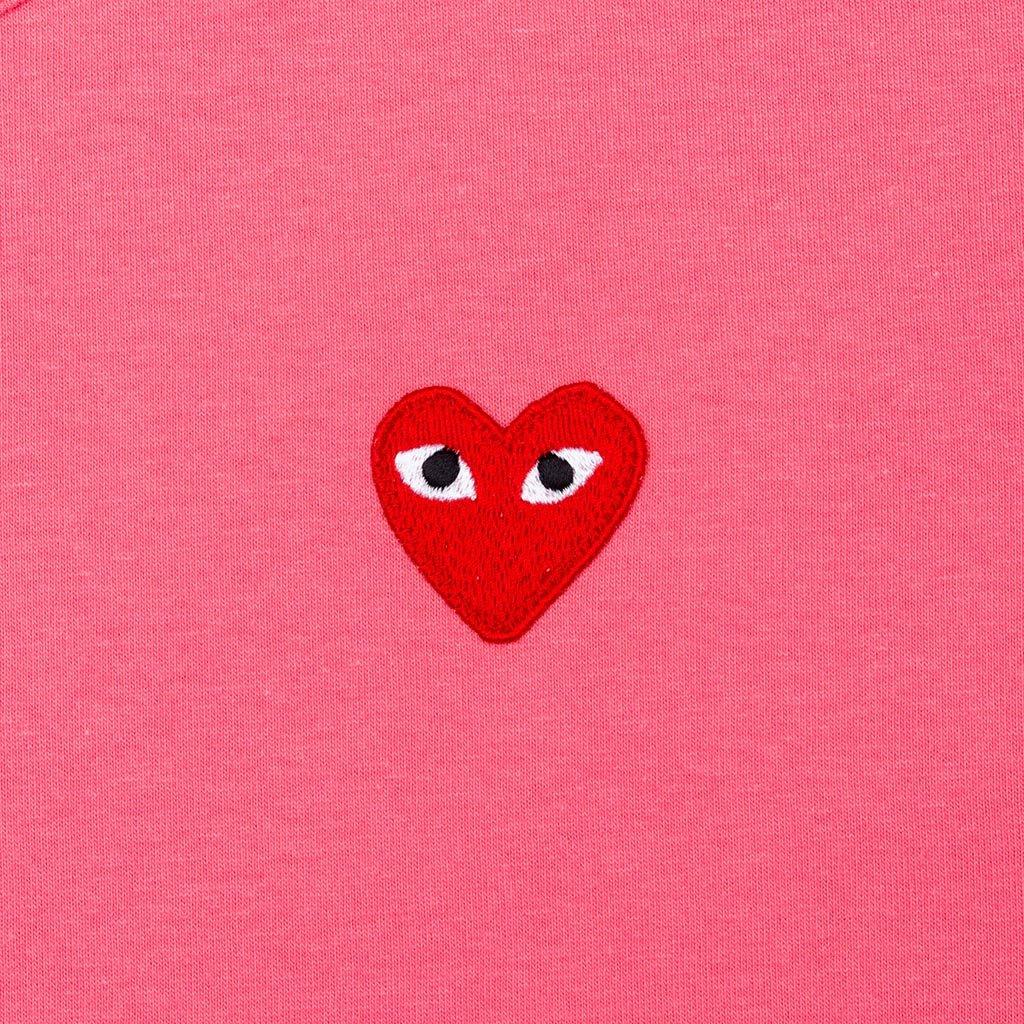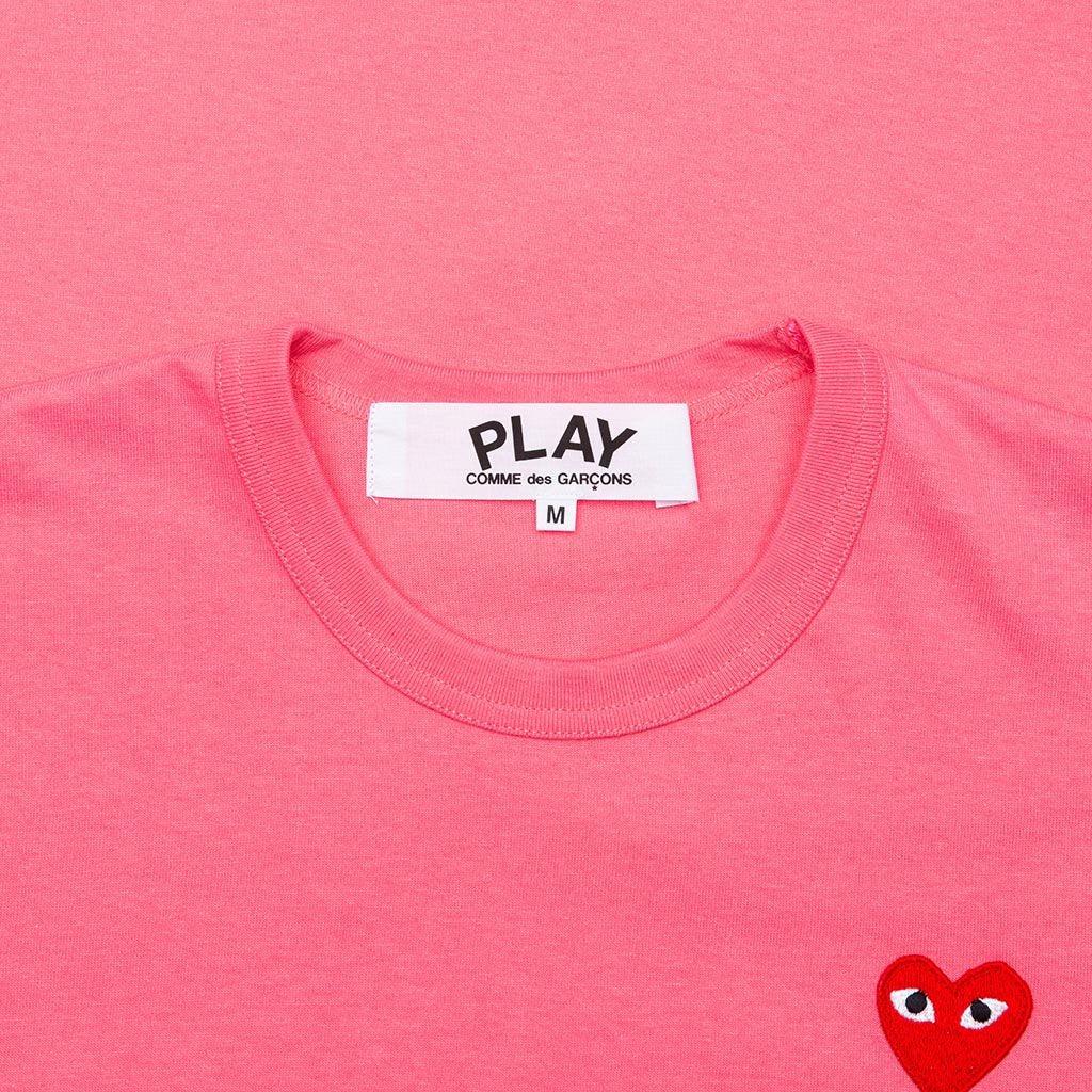 The concept of the Comme des Garcons PLAY line is design by not designing. Characterized by the iconic red heart logo designed by artist Filip Pagowski, the line is a collection of unisex basics, fragrances, and footwear. Pictured is the Comme des Garcons PLAY Pastelle Red Emblem T-Shirt in Pink. AZ T272 051 3 COMME DES GARCONS PLAY APPAREL HAS A SMALLER FIT, WE RECOMMEND SIZING UP. 100% Cotton Printed branding Ribbed trims Made in Japan Style no: AZ-T272-051-3 condition: new