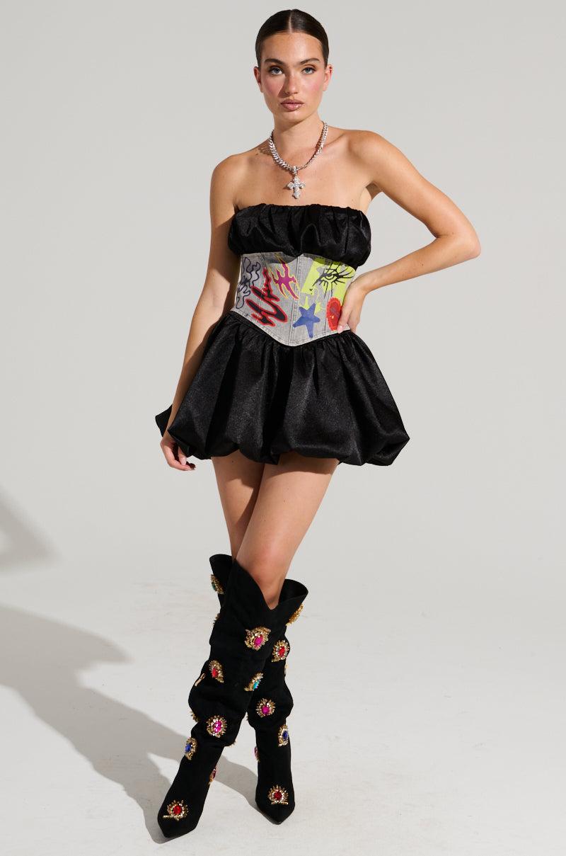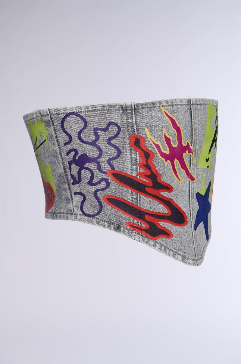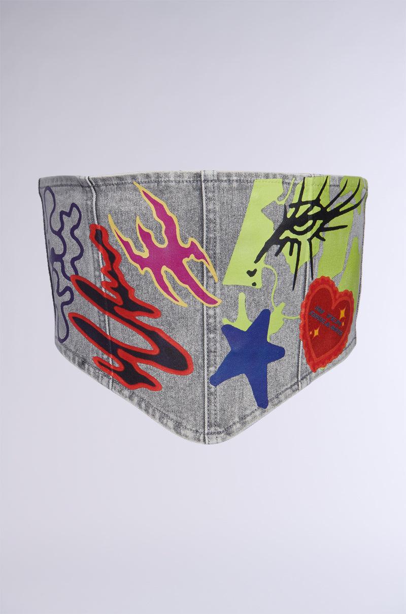 The AKIRA Label Patched Up Stretch Denim Belt is a streetwear-inspired, waist-cinching accessory crafted from soft, semi-stretchy, grey wash denim. It features contour seaming, a pointed hem, a metallic zip back closure, and colorful, graffiti-inspired graphics throughout. - 70% Cotton, 28% Polyester, 2% Spandex- Slightly Stretchy - Imported (all measurements approximate from size small) - 26” Total Length- 8” Chest to HemProduct ID: 434753