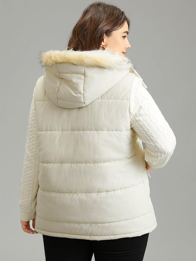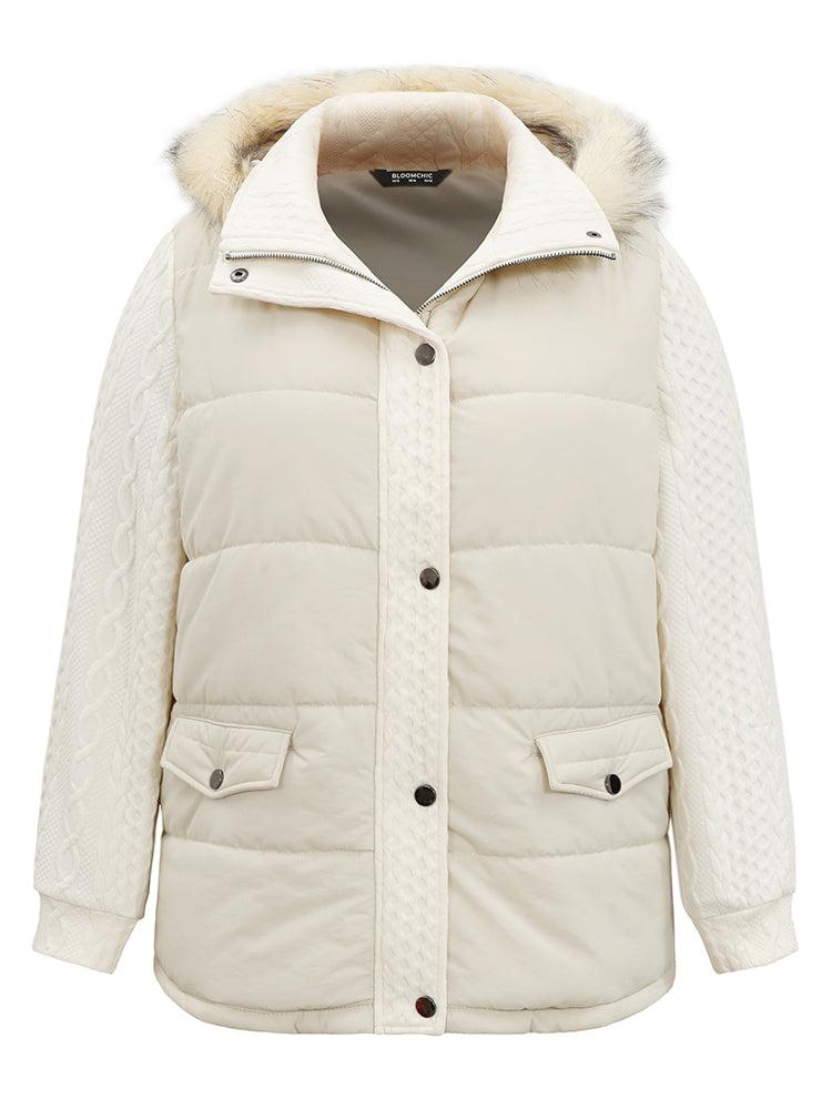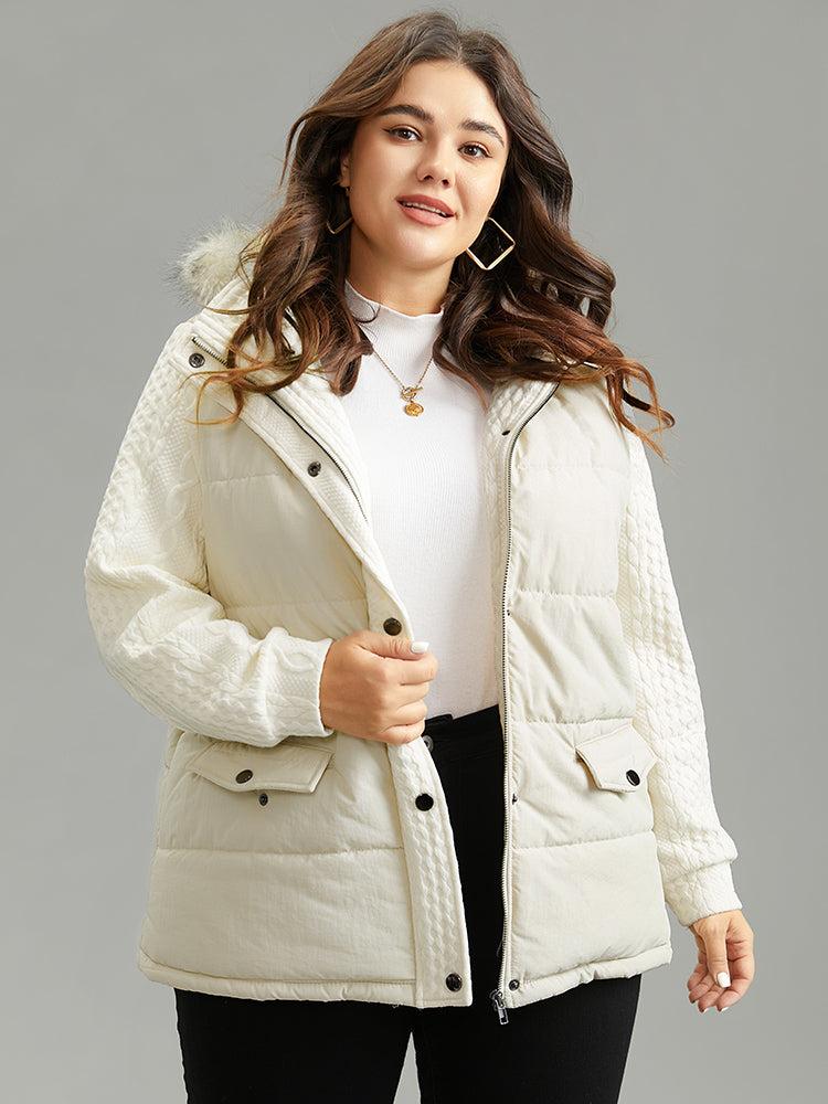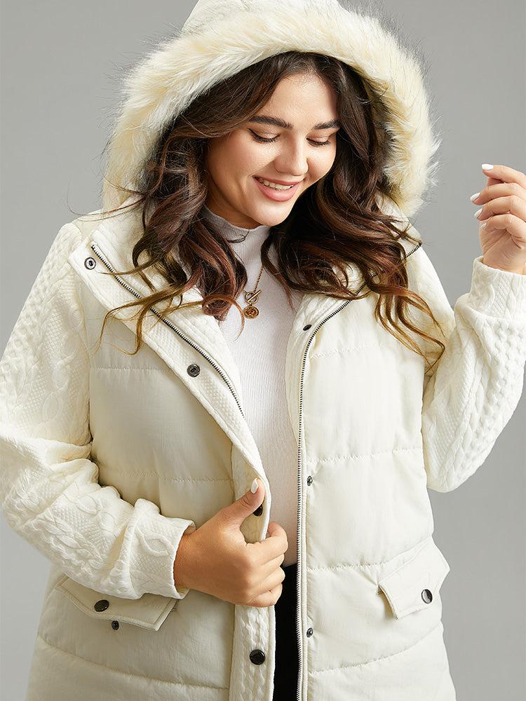 Shop Patchwork Jacquard Fuzzy Trim Hooded Coat now and redefine your style with confidence at BloomChic. Tailored for mid and plus-size women. This trendy Outerwear Women, sizes 10-30. Season:Winter;Color:Beige;Style:Casual;Pattern Type:Plain;Details:Pocket, Button, Patchwork, Zipper, Plain, Lined;Pocket:It is perfectly sized to carry a phone.;Belt:No-belt;Closure Type:Zipper;Lining:Lining