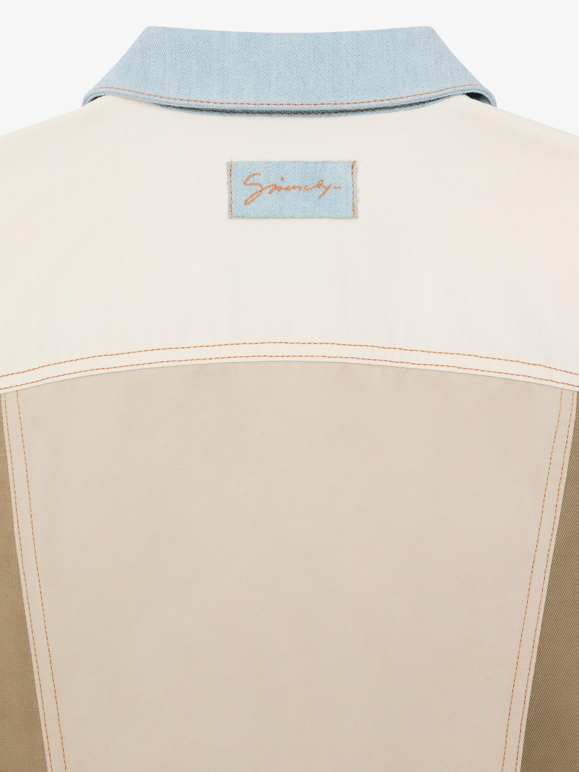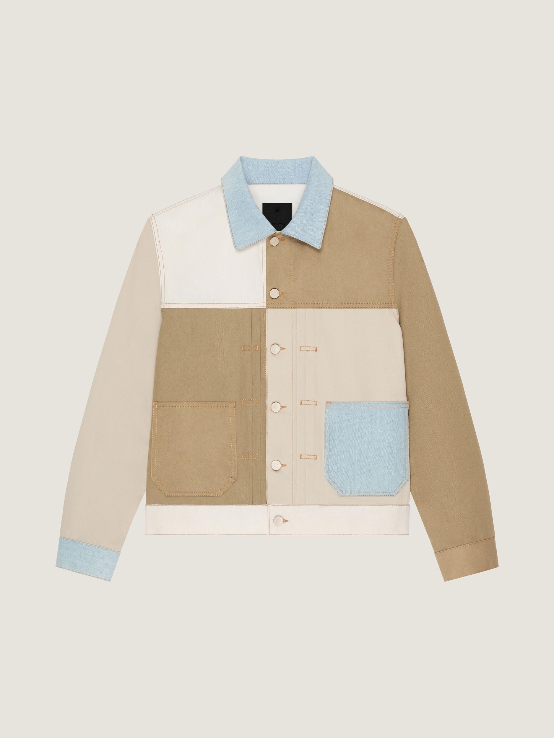 Crafted from leftover fabrics, this unique patchwork denim jacket features a bright and harmonious color combination. Patchwork jacket in denim. Classic collar. Patchwork made from fabric leftover. GIVENCHY patch in denim stitched on the upper back. Button closure. Buttoned cuffs. Mother-of-pearl buttons. Two front pockets. Tightening tab on the back. Contrasting stitchings. Each model is unique : patchwork may vary from one model to another. Model measures 6.1 Feet and wears a size M.