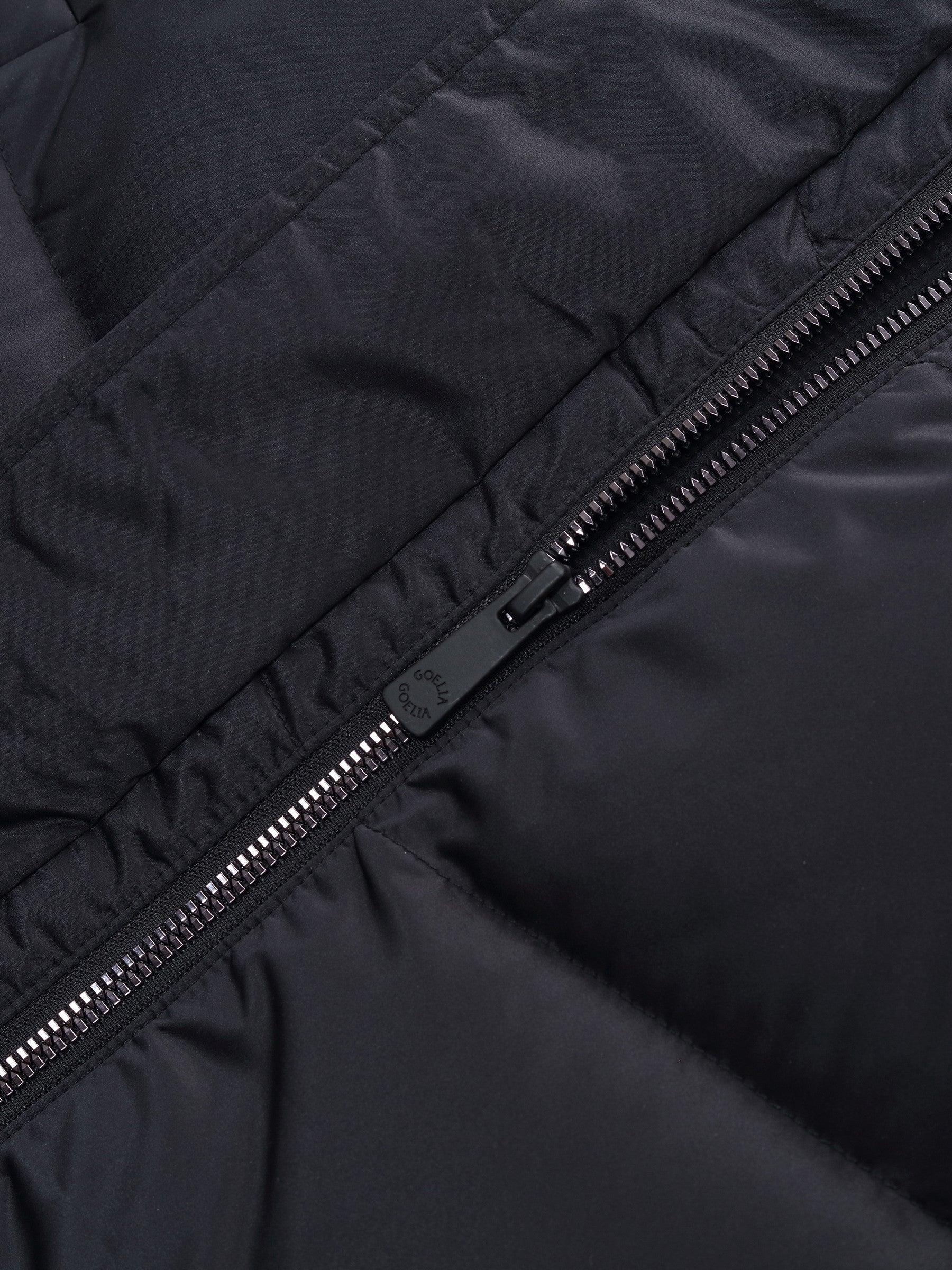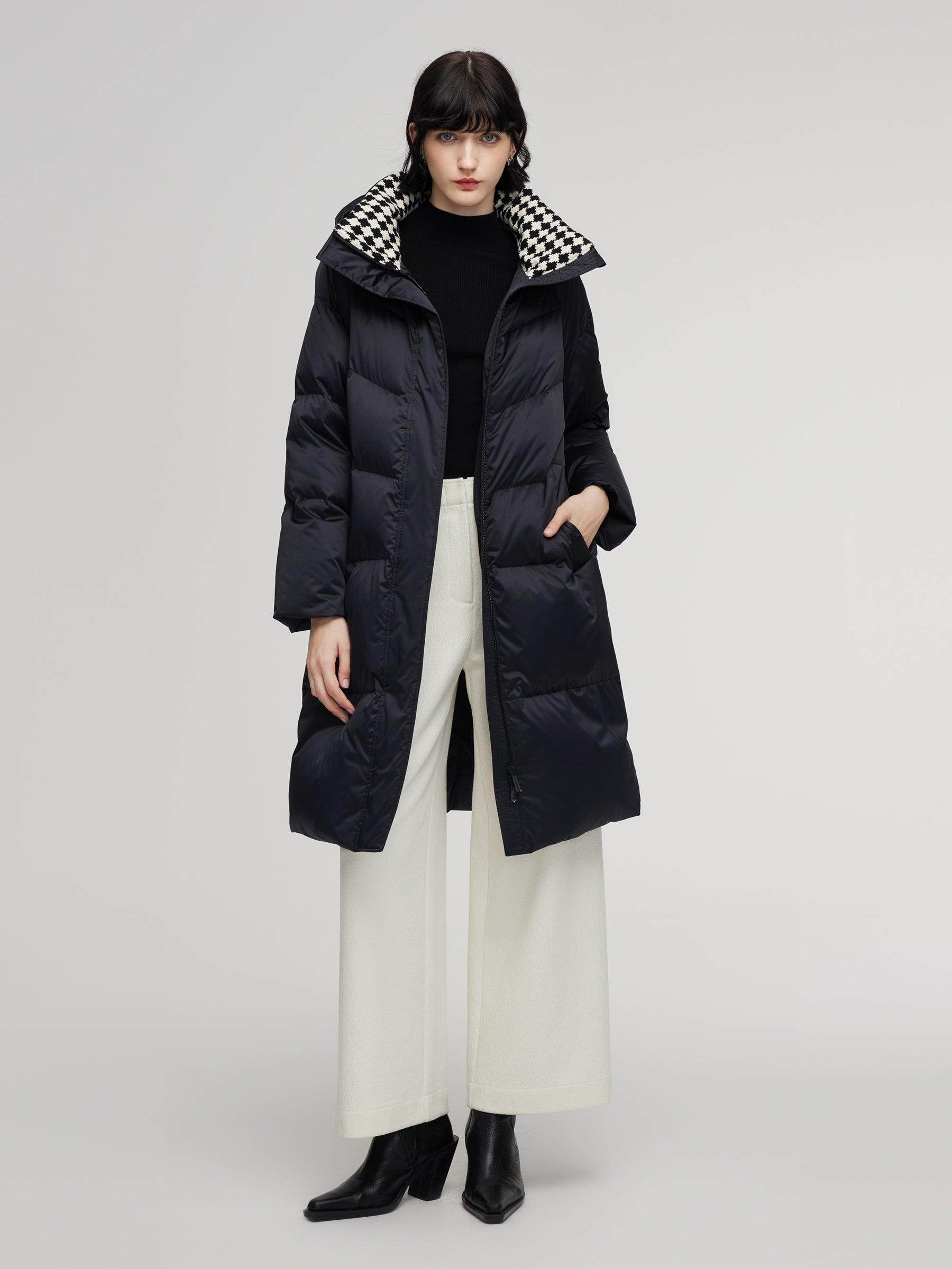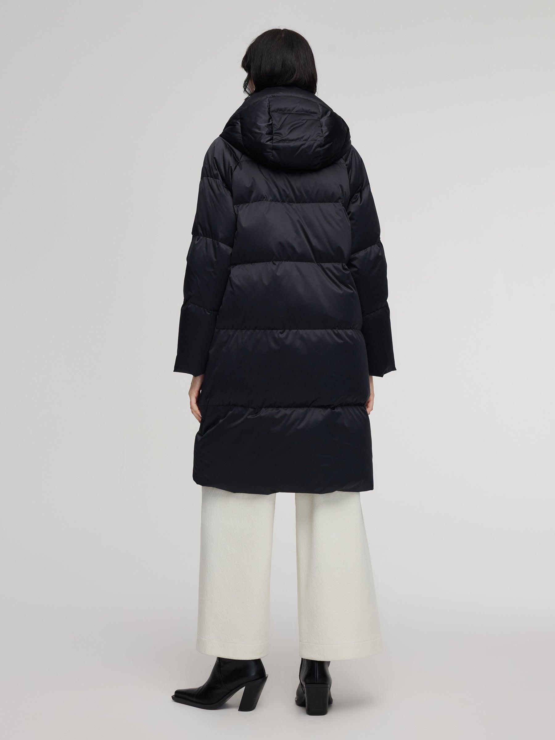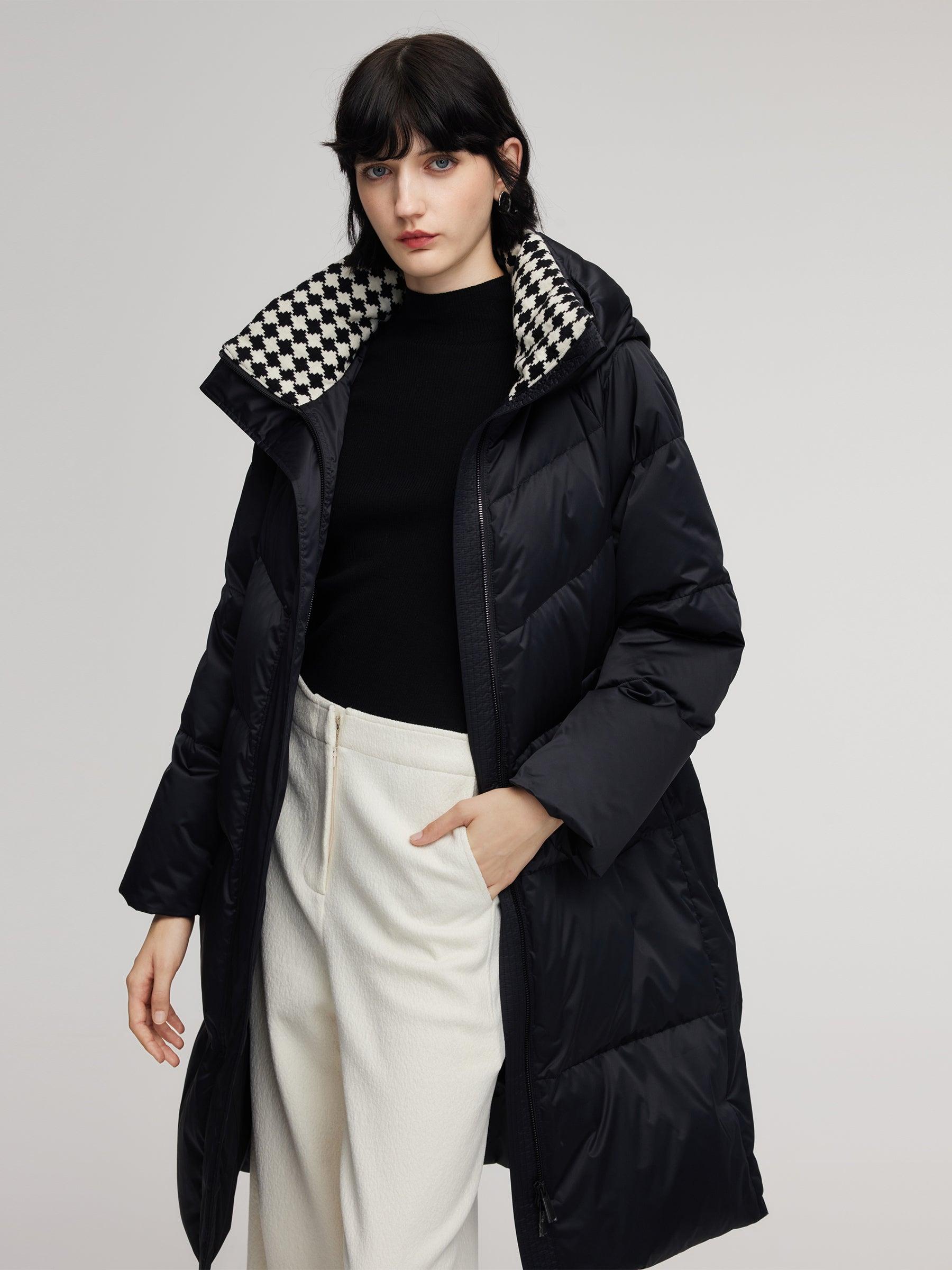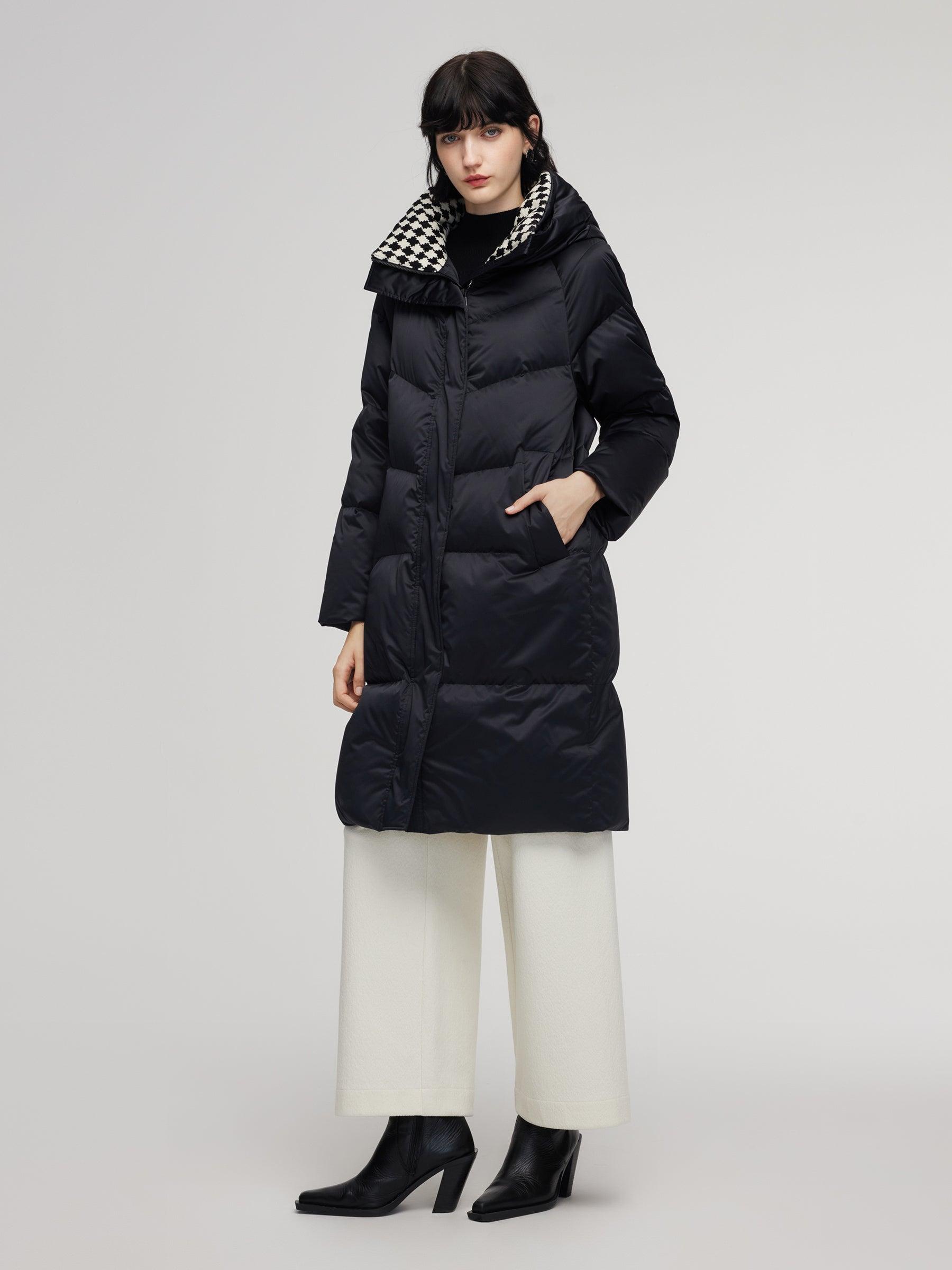 -95% down content and 90% down cluster content -H-line fit -With pockets Filled with 95% Polish white goose down, this hooded coat delivers exceptional warmth. The diamond-quilted knit collar, crafted with high-cotton blend, adds softness, comfort, and a stylish focal point to the upper body. Its relaxed H-lined silhou