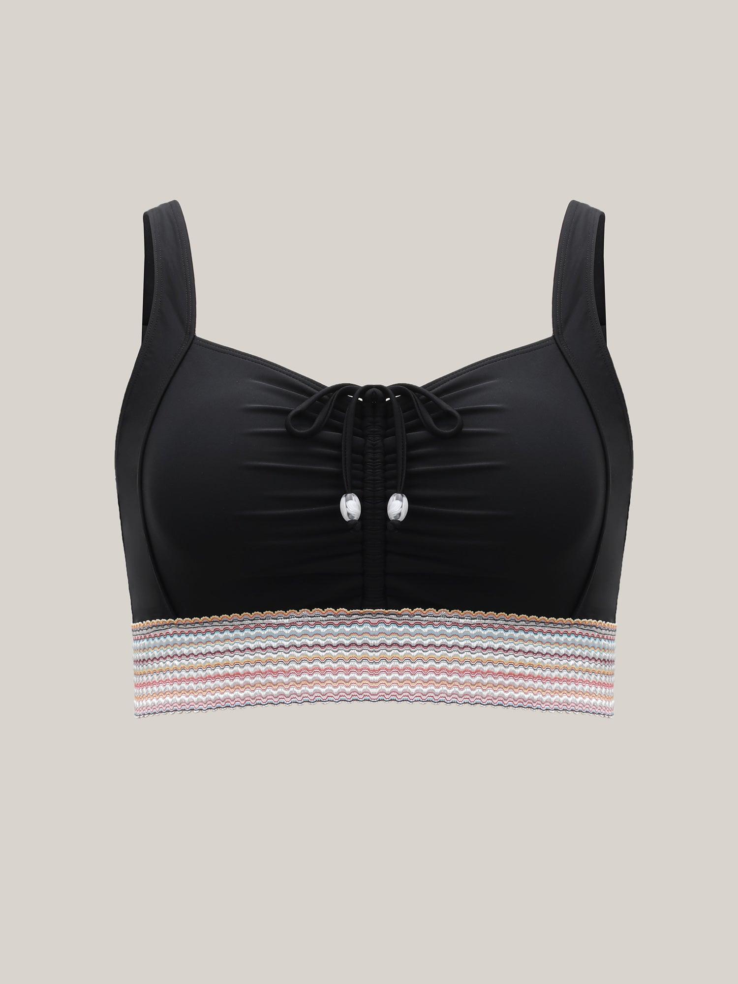 Plus Size Patchwork Ruched Drawstring Swim Top Women's Swimwear Black Resort Patchwork High stretch Skinny Non Curve Swim Tops BloomChic 22-24/3X