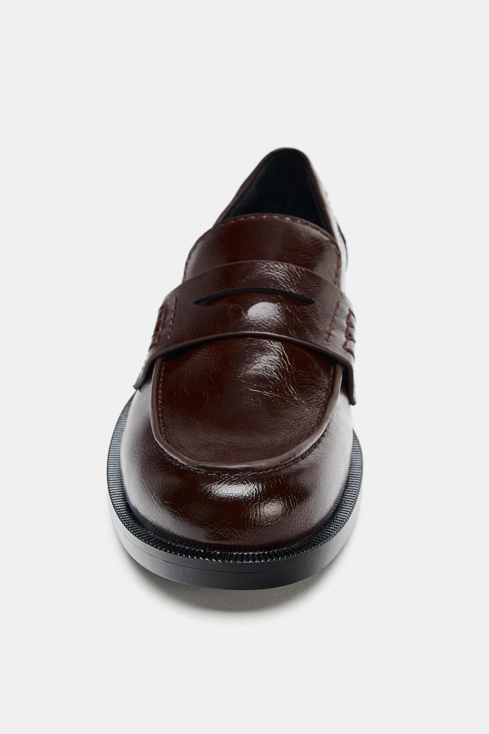 Loafer style shoes. Patent finish. Raised vamp and penny strap on the front. Round toe. Sole height: 1 inch (2.5 cm)