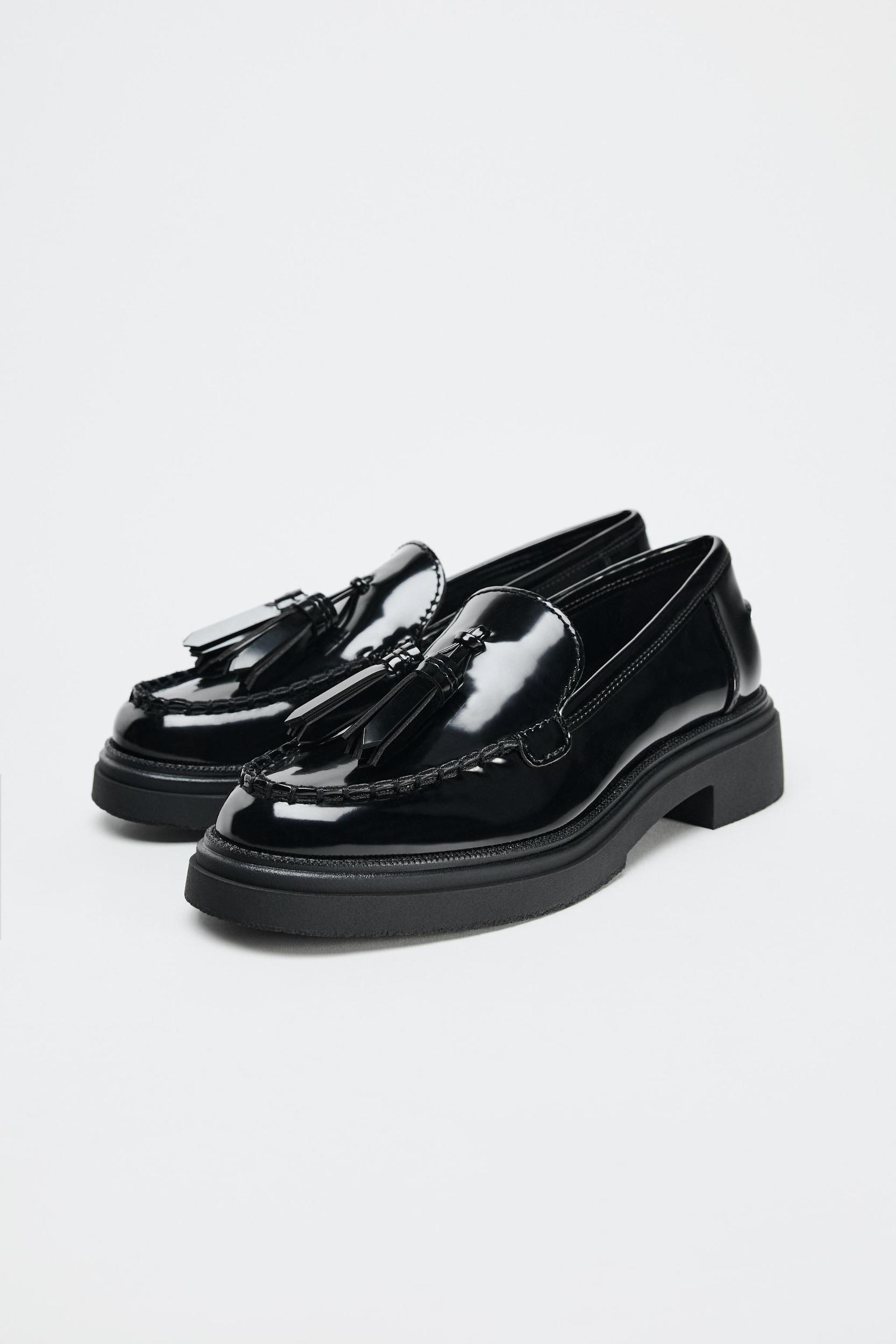 Faux patent leather loafers. High vamp and front tassels. Exterior topstitching. Rounded toe. Sole height: 1.6 inches (4 cm)