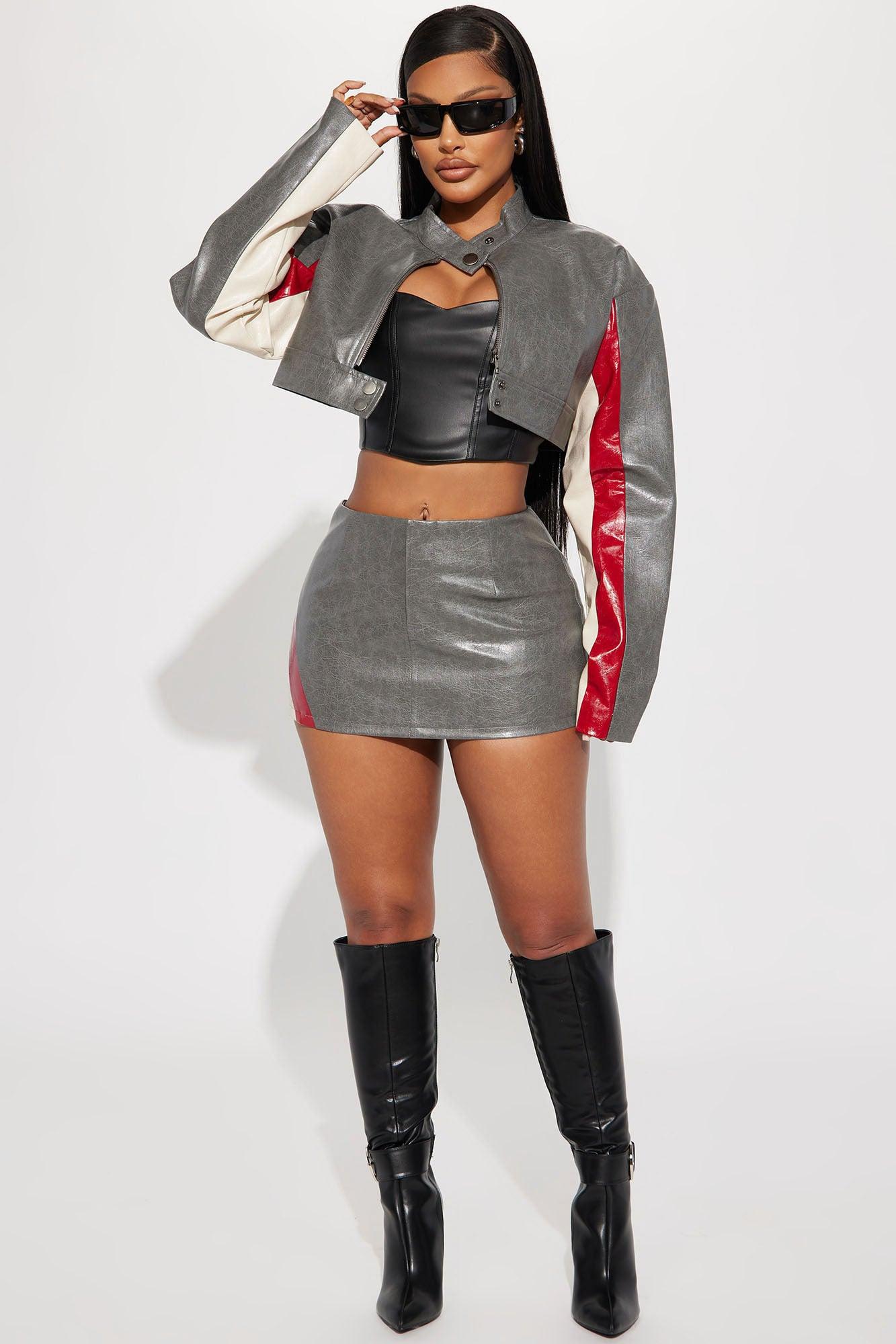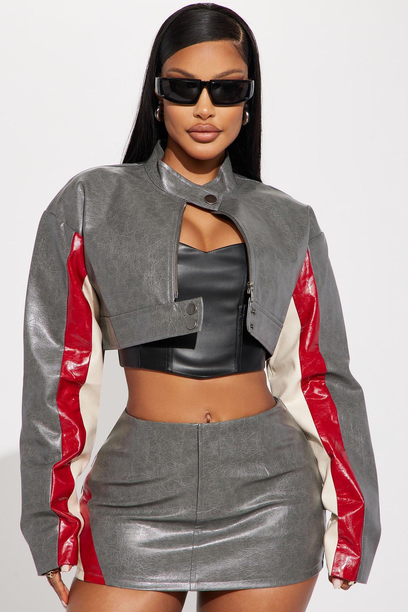 Available In Grey. Moto Jacket Long Sleeve High Neck Full Zip Contrast Stripe Detail Faux Leather Cropped Non Stretch Pair With "Paths Of Victory Micro Mini Skirt" Shell: 55% PU 45% Polyester Contrast1: 55% PU 45% Polyester Contrast2: 55% PU 45% Polyester Lining: 100% Polyester Imported California Proposition 65 WARNING: Cancer and Reproductive Harm - www.P65Warnings.ca.gov.