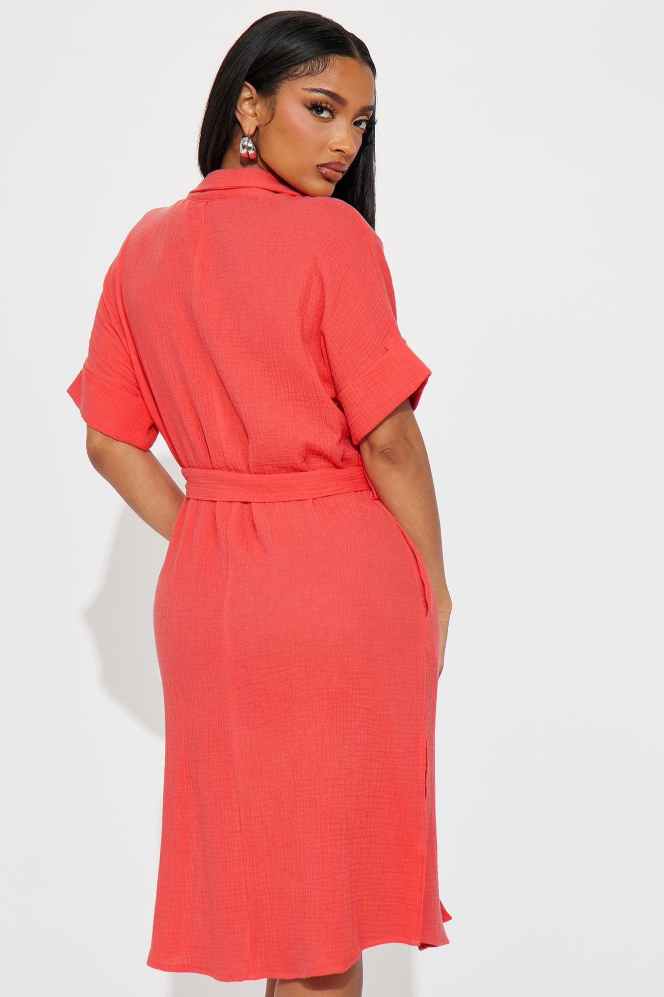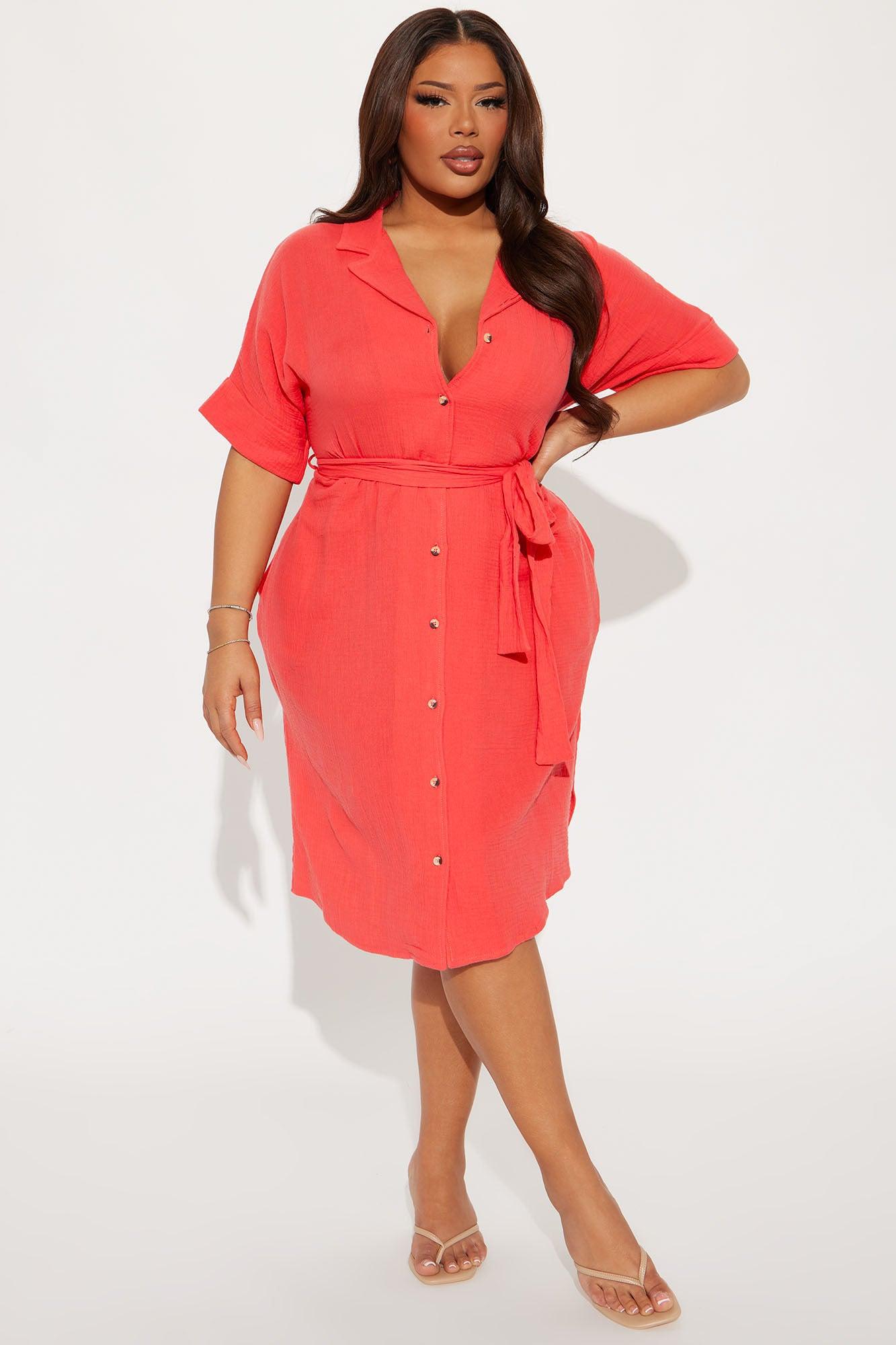 Available In White, Black, Coral, And Purple. Shirt Midi Dress Collar Dolman Sleeve Button Front Stretch 100% Cotton Imported