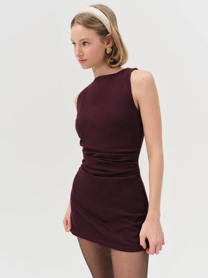 Exude a timeless aesthetic with the Pauline burgundy mini dress—a sleeveless boat neck dress spotlighting a ruched waist and flattering bodycon fit.