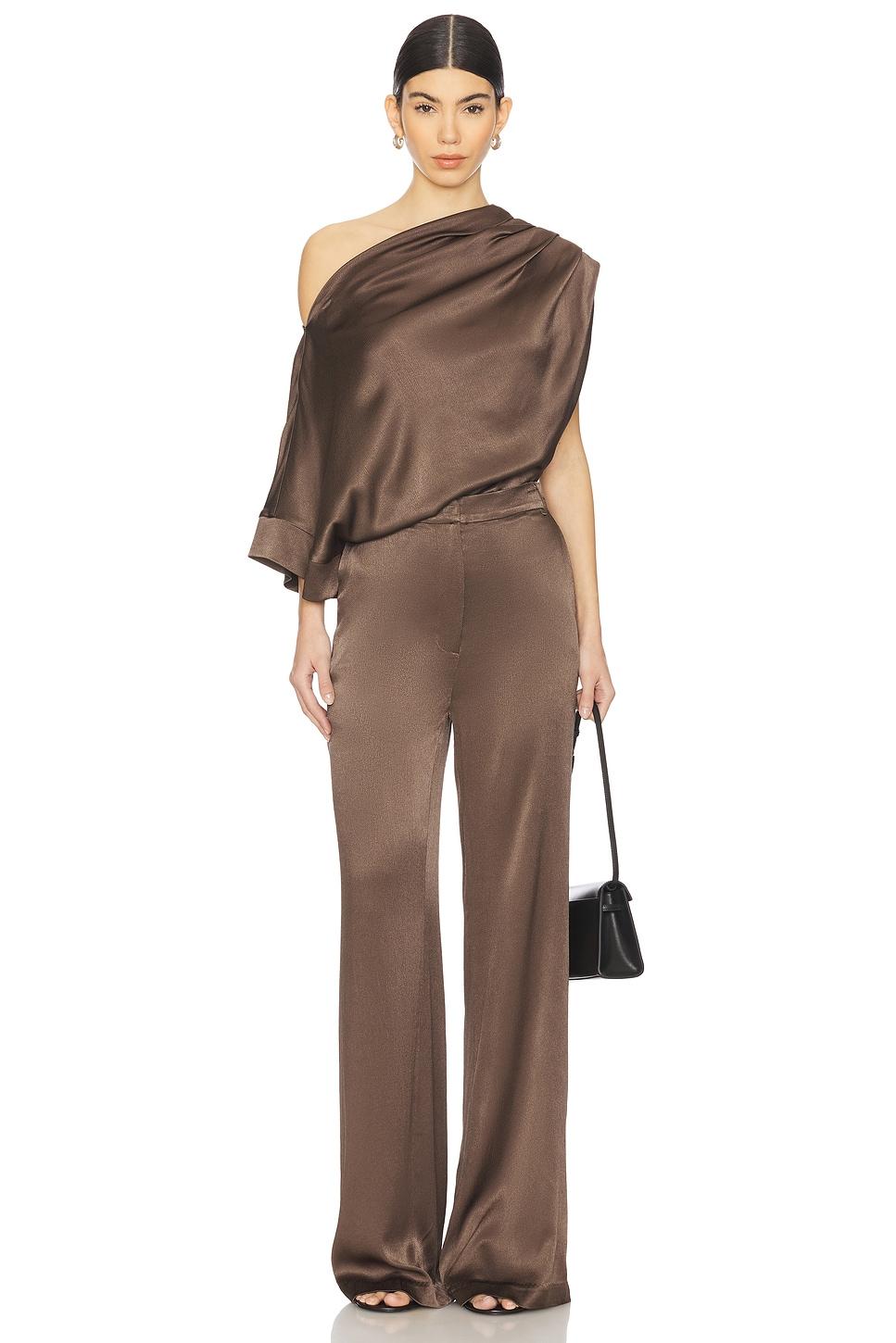 56% viscose, 41% rayon, 3% spandex. Made in China. Dry clean only. Zip fly with hook and bar closure. Side seam pockets. Midweight crepe de chine fabric. Item not sold as a set. 21" at the knee breaks to 22" at the leg opening. Revolve Style No. NOCH-WP83. Manufacturer Style No. 25SPP21.