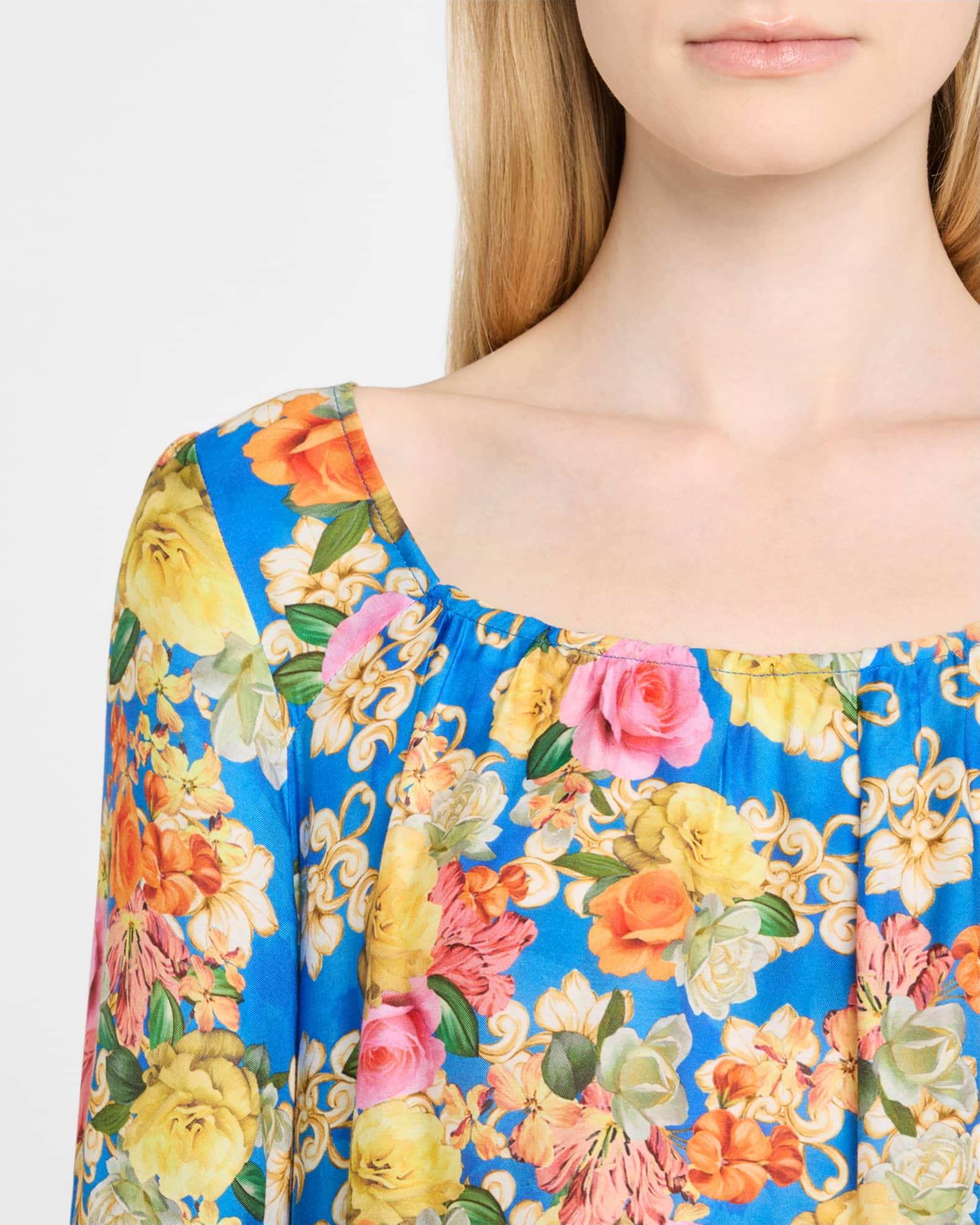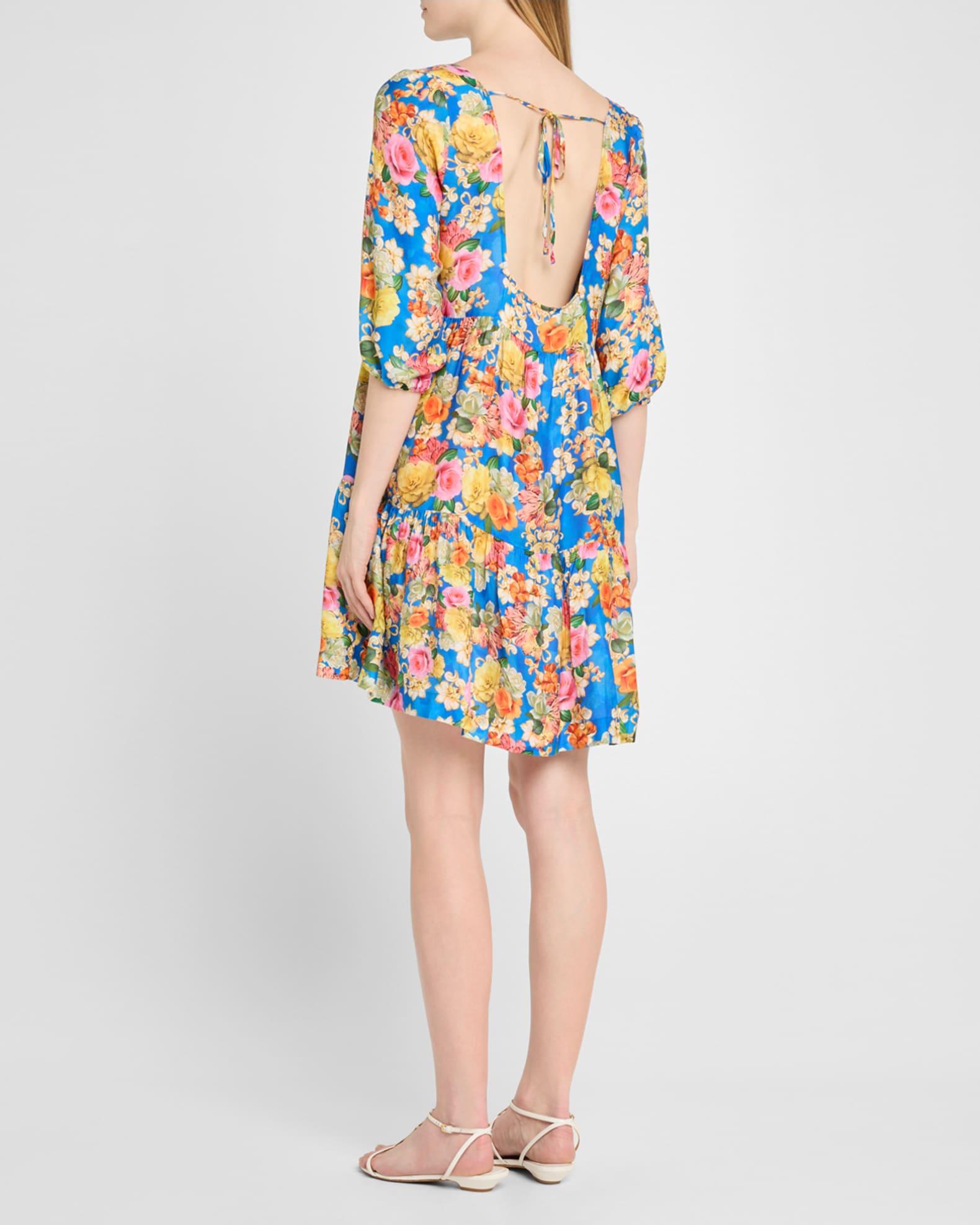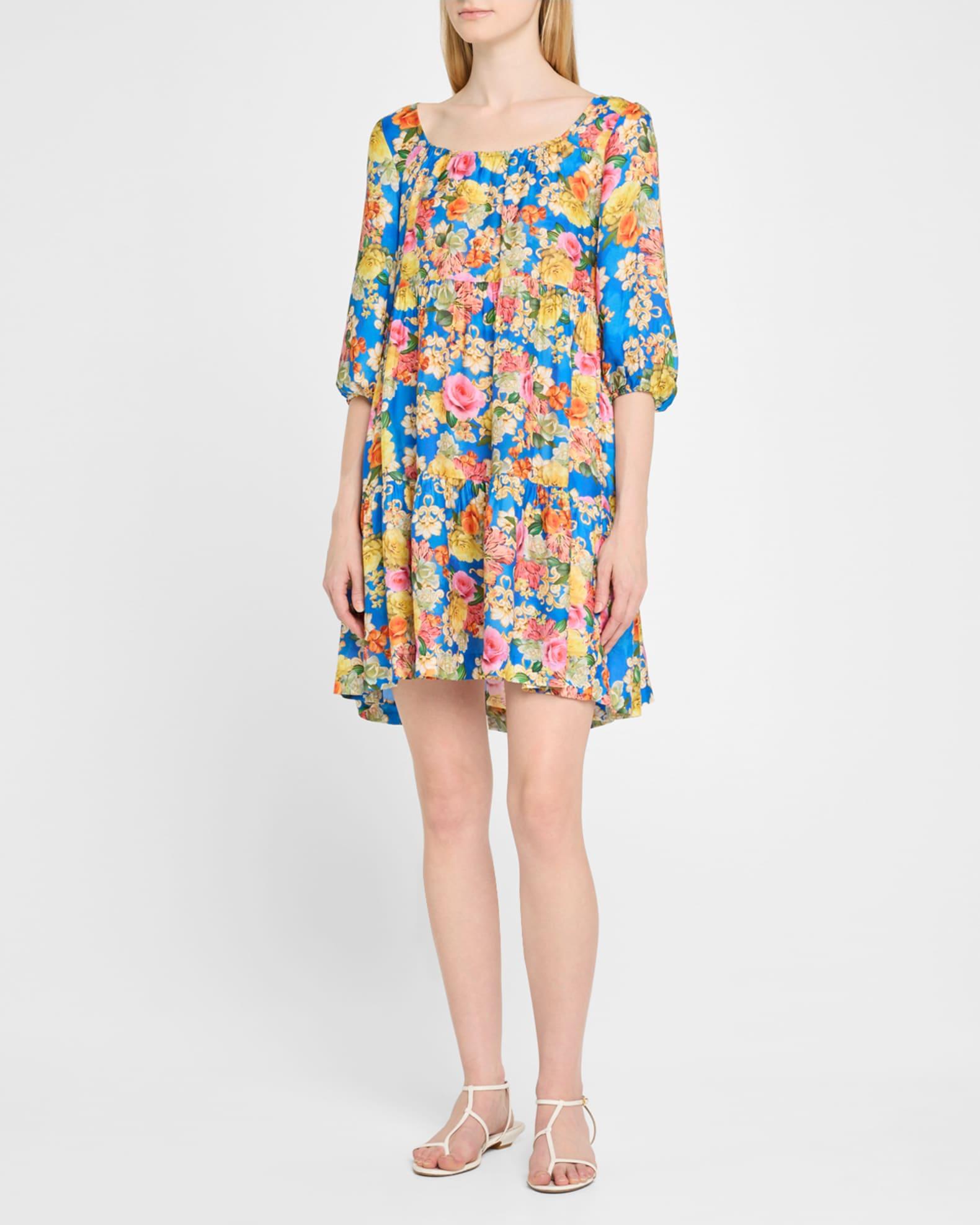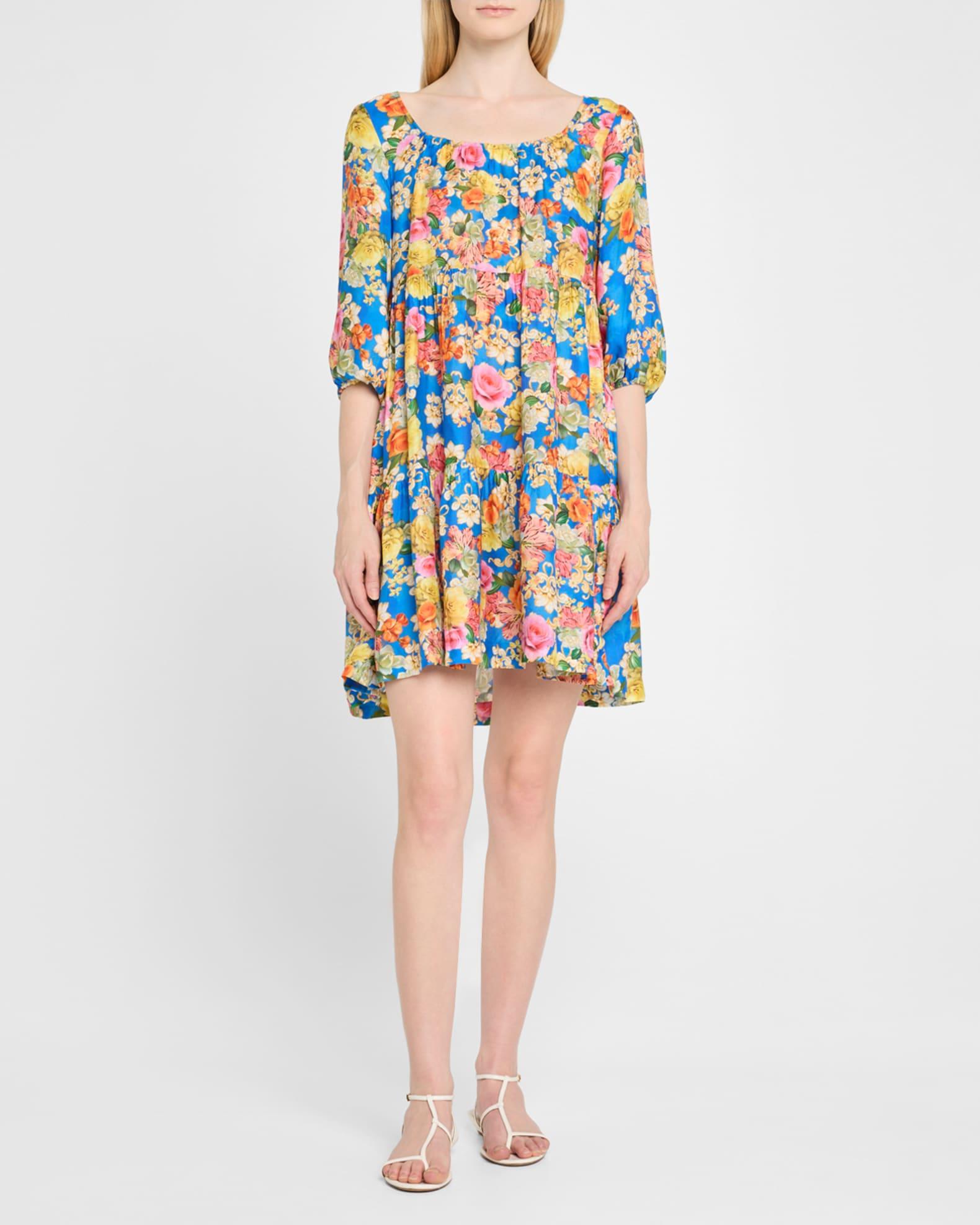 Johnny Was "Pauline" tiered dress offered in a vibrant print of blooming florals Approx. 37"L from shoulder to hem Scoop neckline Elbow-length blouson sleeves; elastic cuffs Open back with a self-tie closure Hem falls above the knee A-line silhouette Rayon/cellulose acetate/silk Hand wash Imported Please note: This merchandise may have a distressed effect. It is a unique feature that enhances the product and is not considered a defect. Proposition 65 warning for California residents