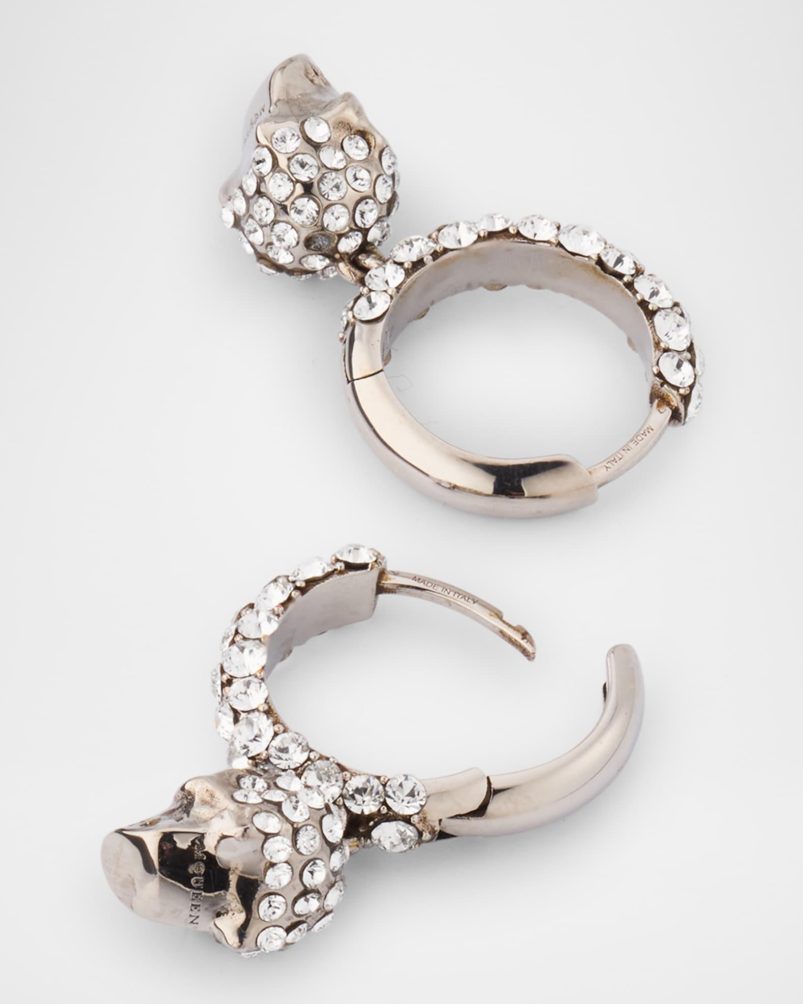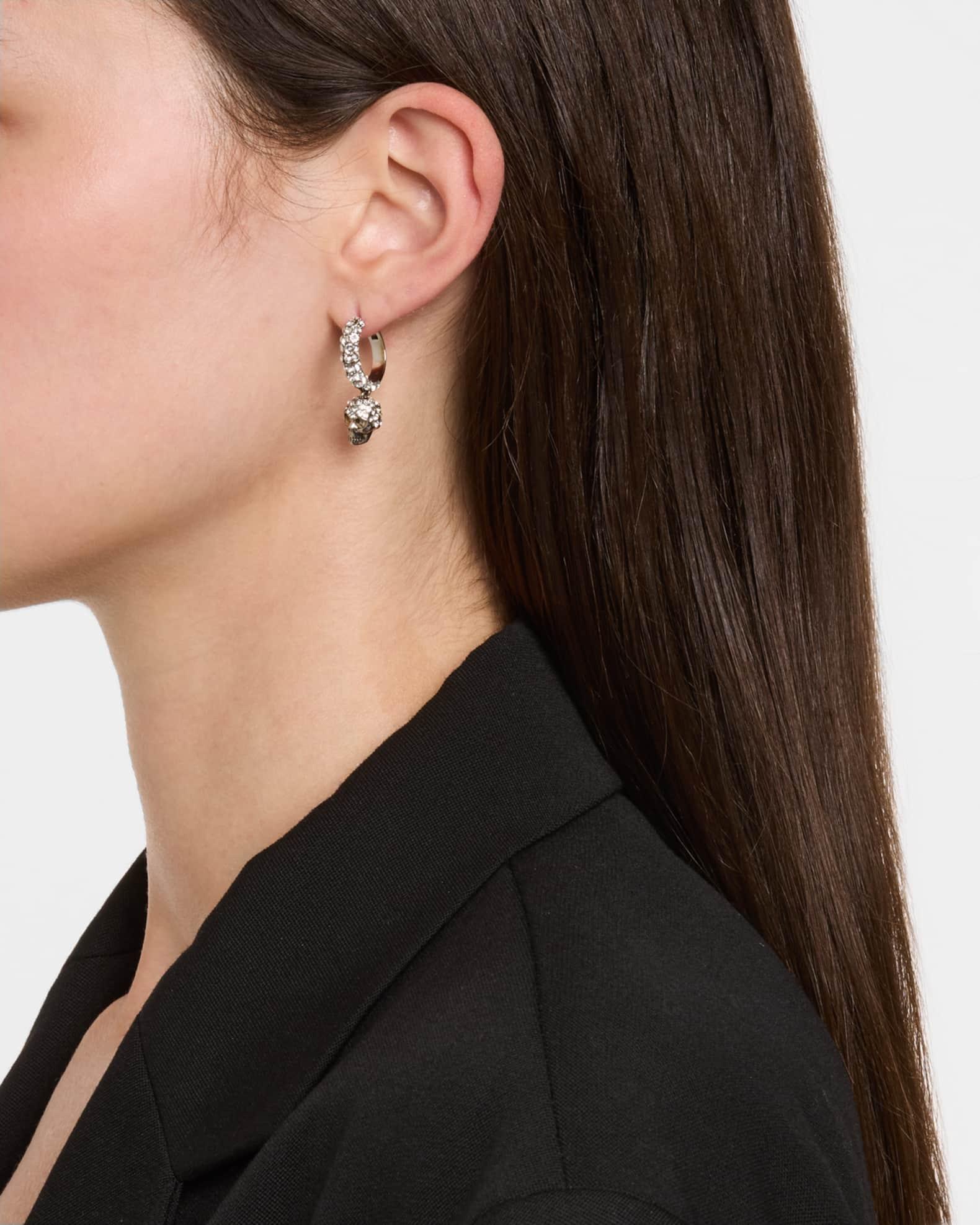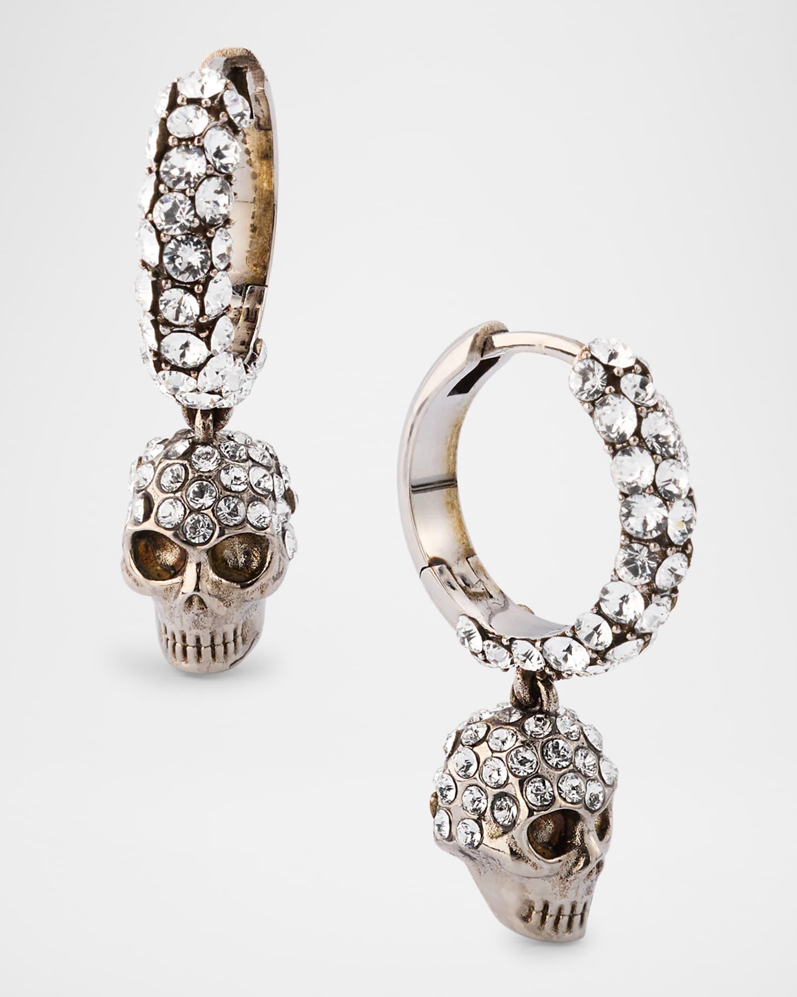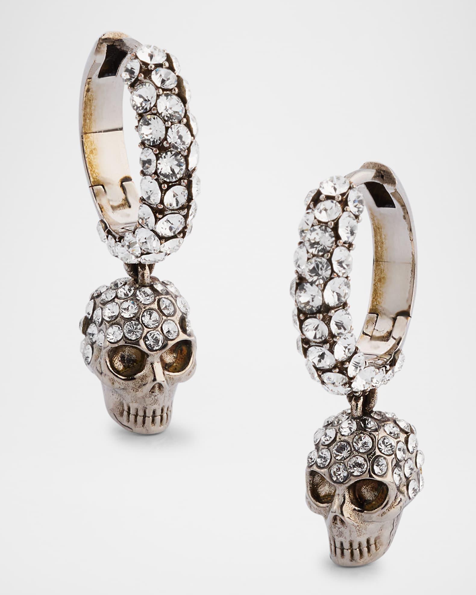 The brand's signature skull hangs from these McQueen huggie earrings. Crystals cover huggie hoops and skulls. Brass with a silvertone finish Round glass crystals Lever-back closure For pierced ears Made in Italy