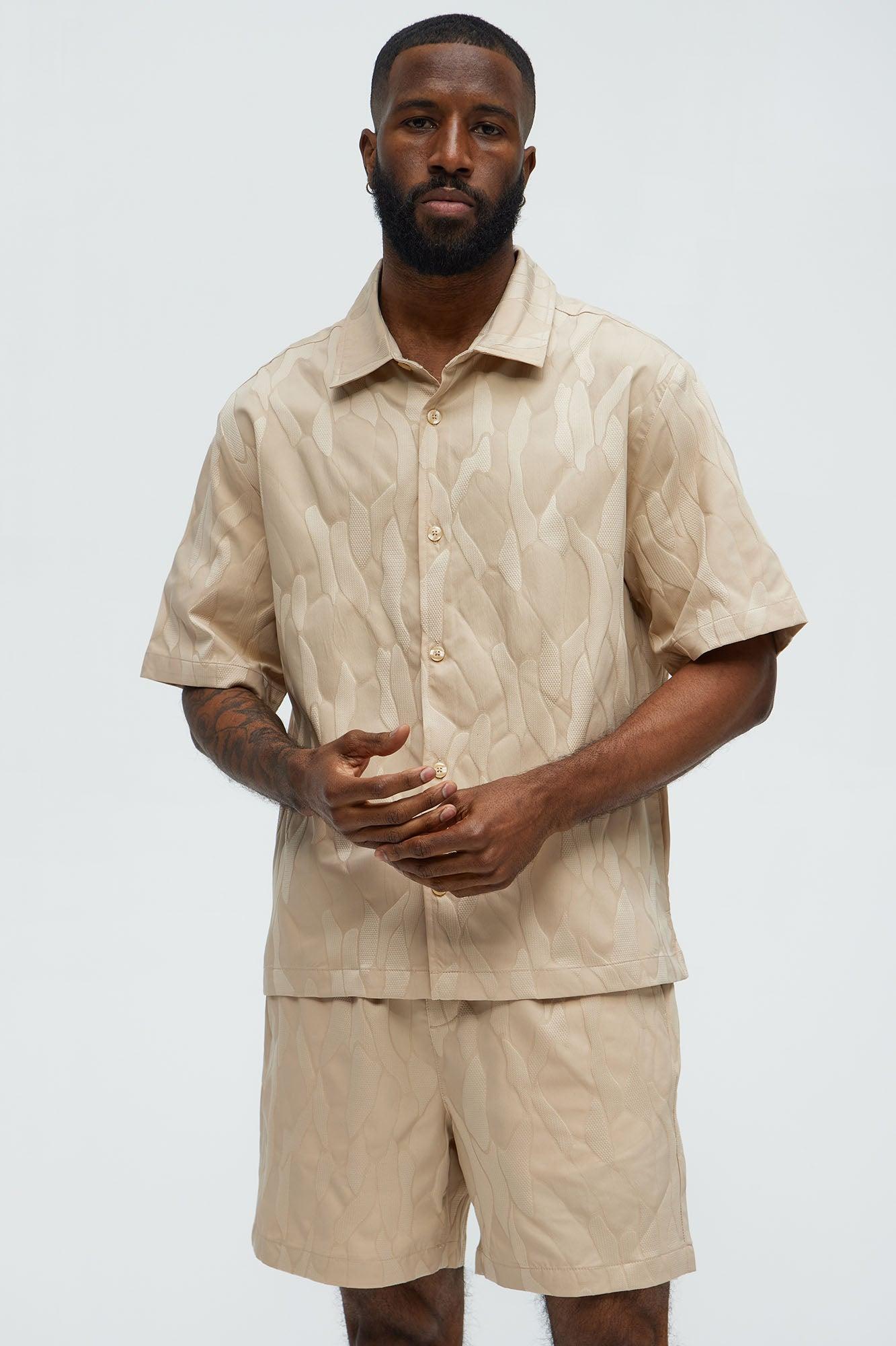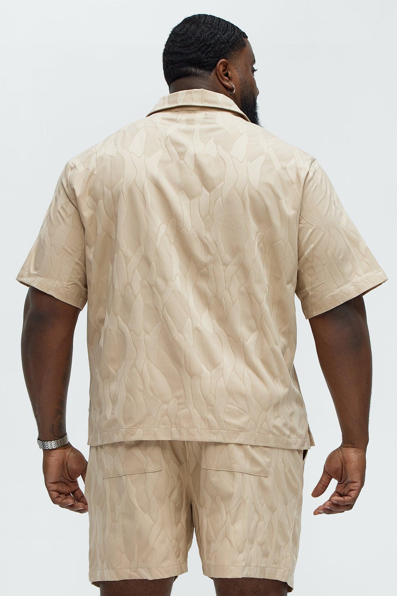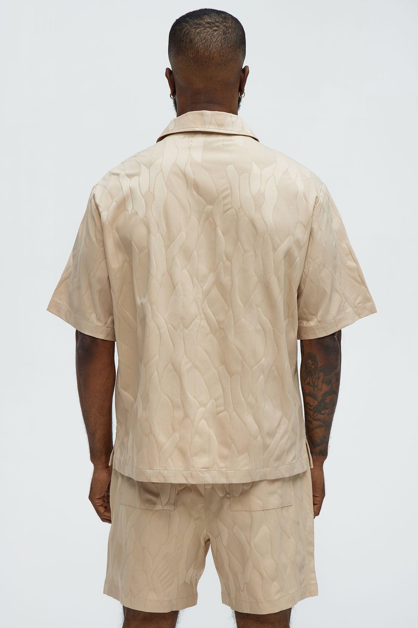 Available In Tan. Fold down Collar Front Button Closure Short Sleeve Jacquard Small Side Slit Pair With "Paving Stone Jacquard Shorts" 100% Polyester Imported California Proposition 65WARNING: Cancer and Reproductive Harm - www.P65Warnings.ca.gov.