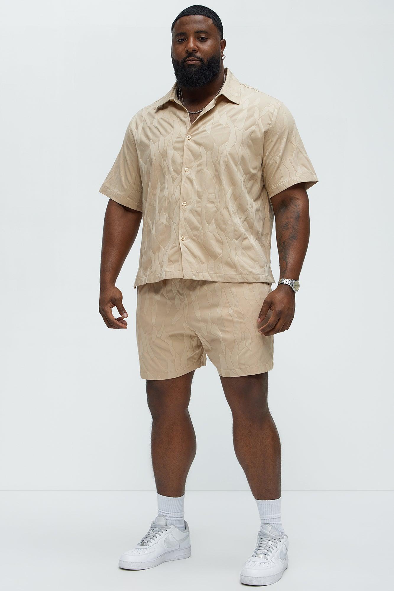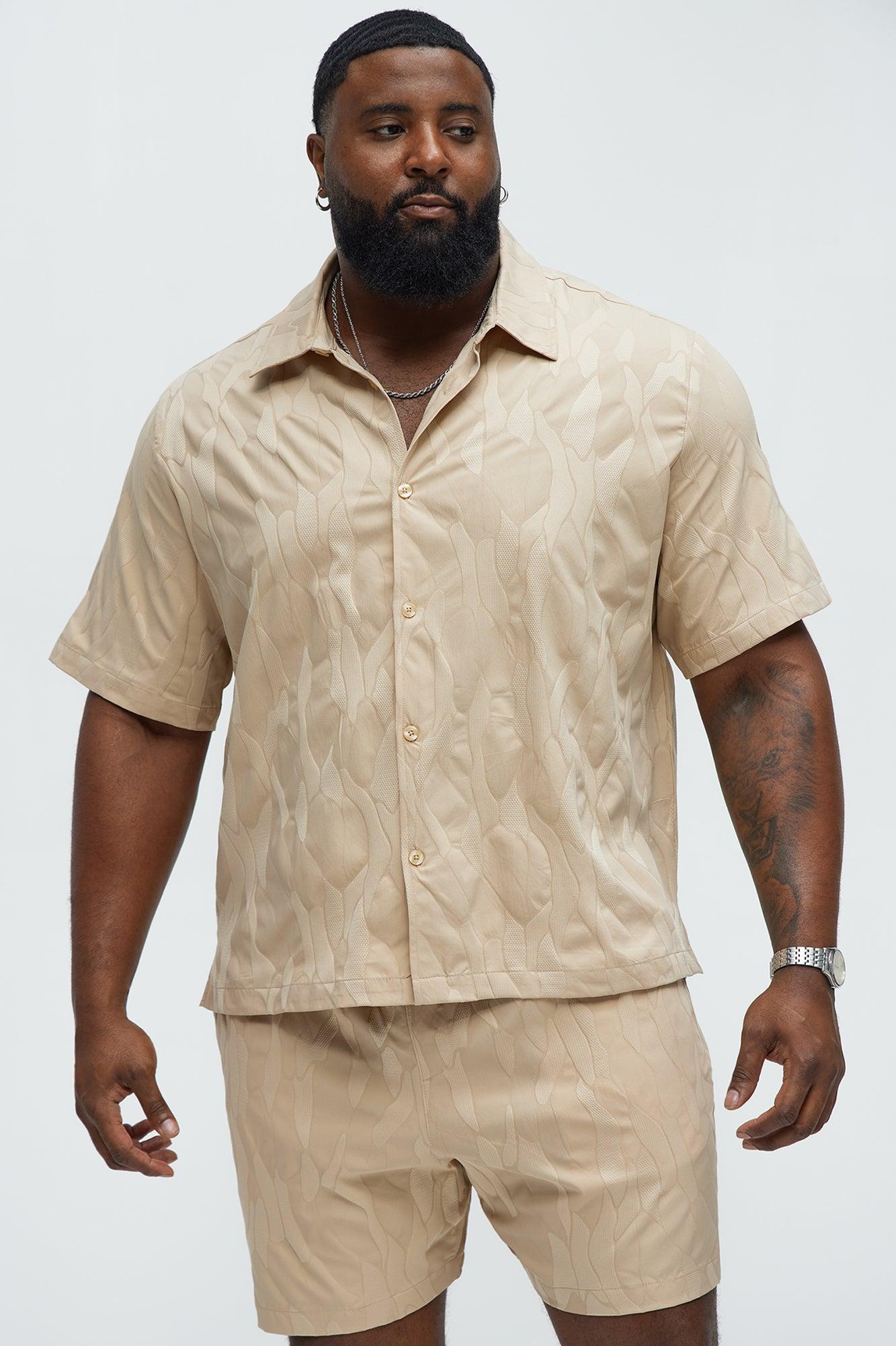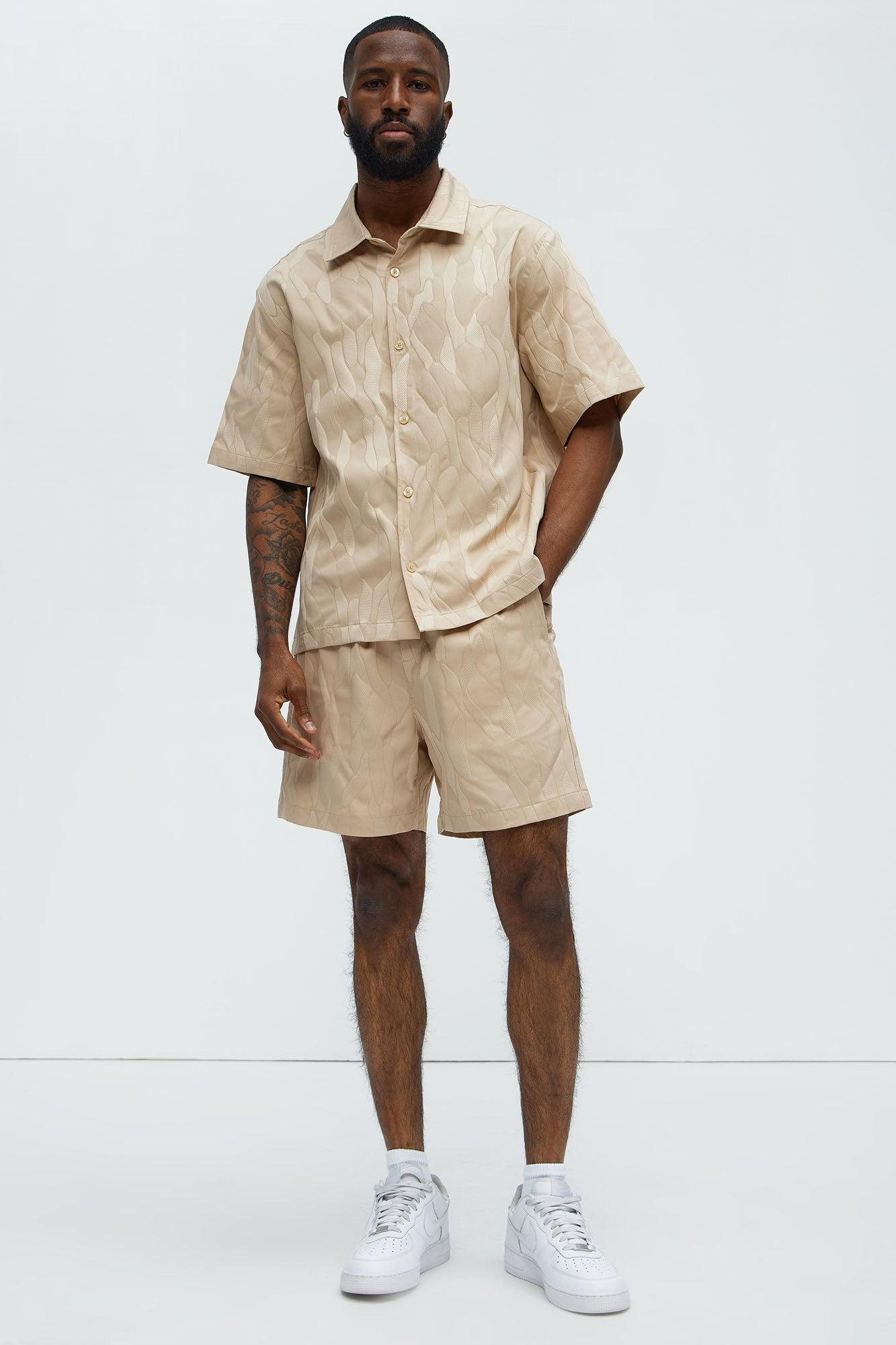 Available In Tan. Fold down Collar Front Button Closure Short Sleeve Jacquard Small Side Slit Pair With "Paving Stone Jacquard Shorts" 100% Polyester Imported California Proposition 65WARNING: Cancer and Reproductive Harm - www.P65Warnings.ca.gov.