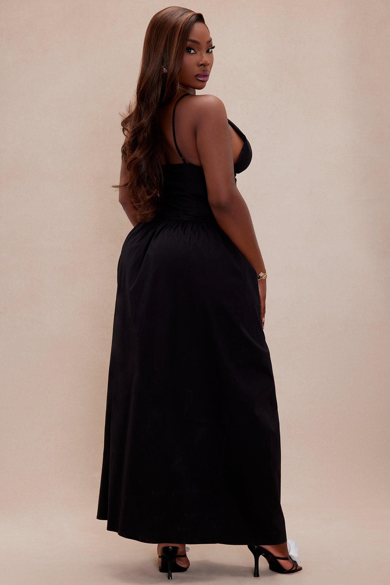 Available In Black And White. Maxi Drtess Spaghetti Straps Deep V-Neck Slit Back Zipper Closure Lined Non Stretch Shell: 97% Cotton 3% Spandex Lining: 100% Polyester Imported California Proposition 65WARNING: Cancer and Reproductive Harm - www.P65Warnings.ca.gov.