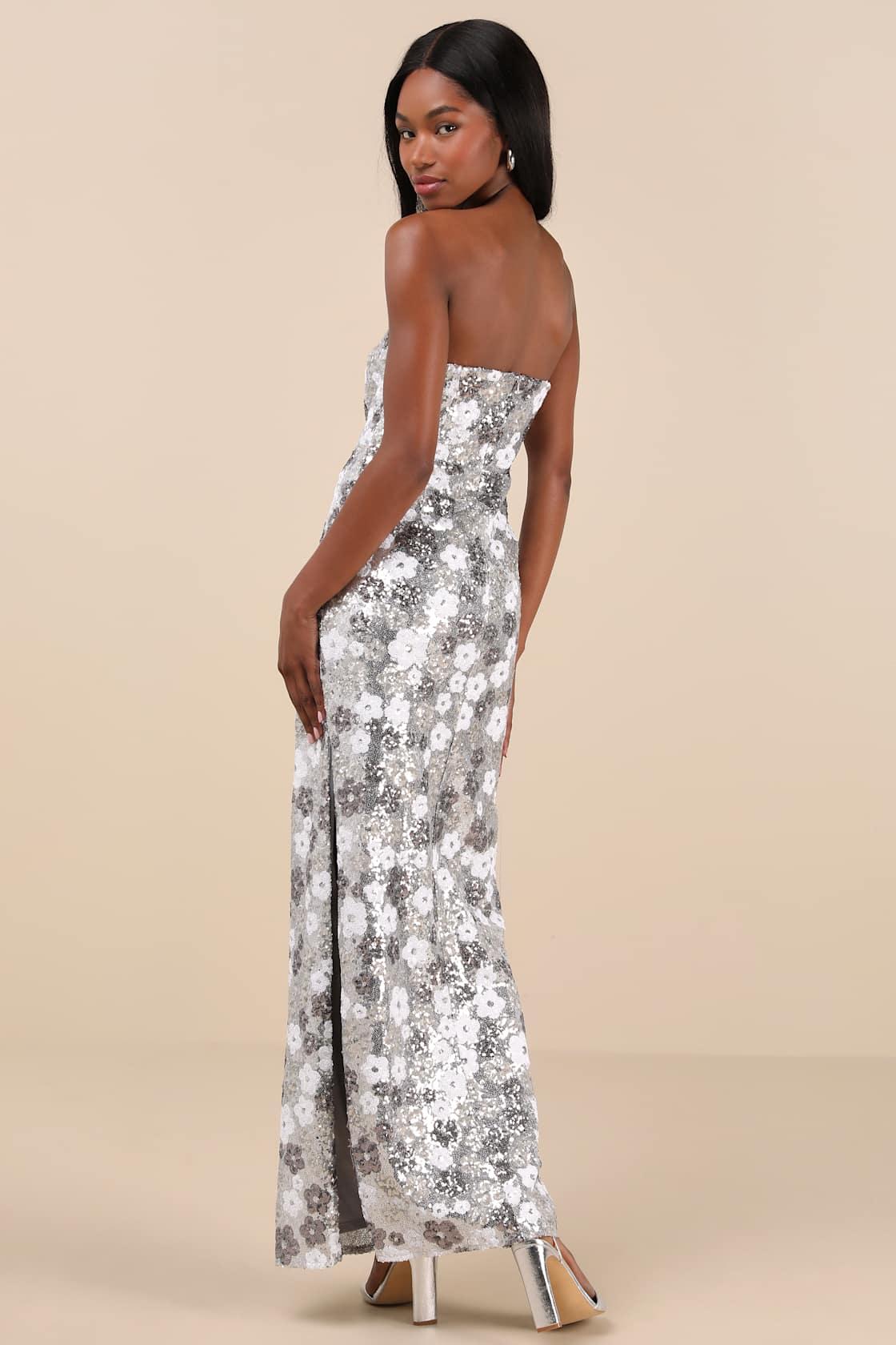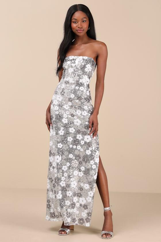 Effortlessly strut into the spotlight wearing the Lulus Pazzi Silver Floral Sequin Strapless Column Maxi Dress! Sparkling silver and white sequins create a floral-like design across this eye-catching dress with a straight neckline and a seamed, strapless bodice. The high, fitted waist sits atop a figure-skimming column skirt, complete with a flirty thigh-high side slit. Hidden no-slip strips and zipper/clasp at back.