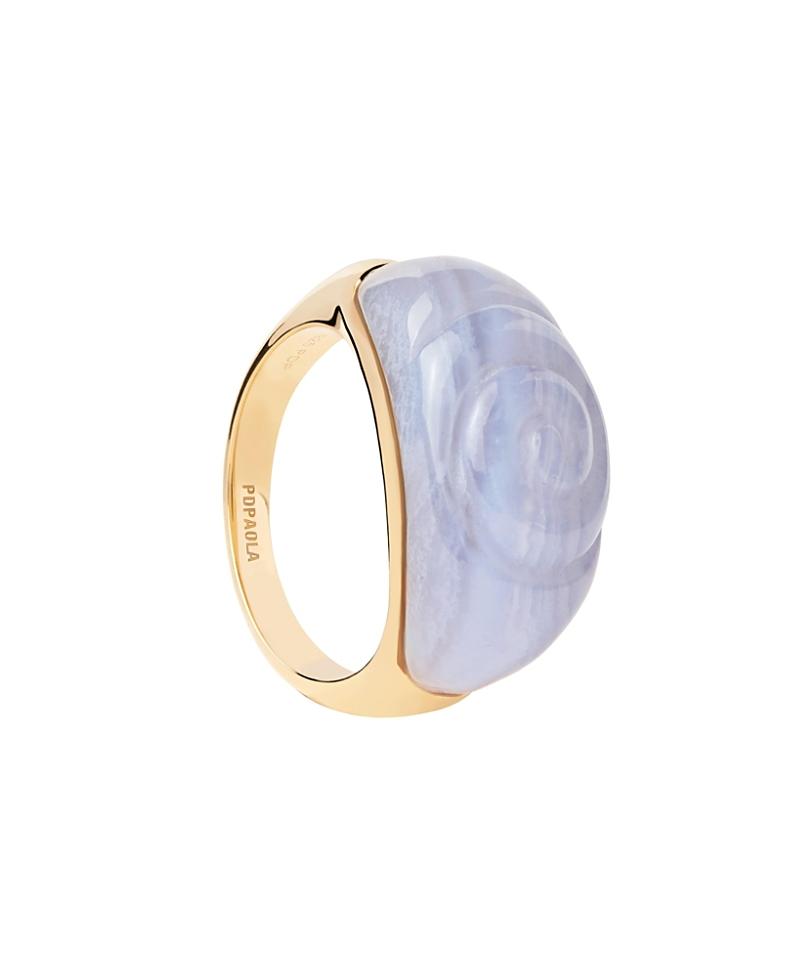 This enchanting blue gemstone sea snail ring features a striking blue agate stone set on a gold-plated band, making it a unique and captivating piece. Crafted from 925 Sterling Silver, made from 100% recycled silver, the ring is elegantly finished with 18K gold plating for a luxurious touch. With a width of 10.20 mm, this ring beautifully combines a playful design with sustainable craftsmanship, adding a touch of charm and sophistication to any jewelry collection.