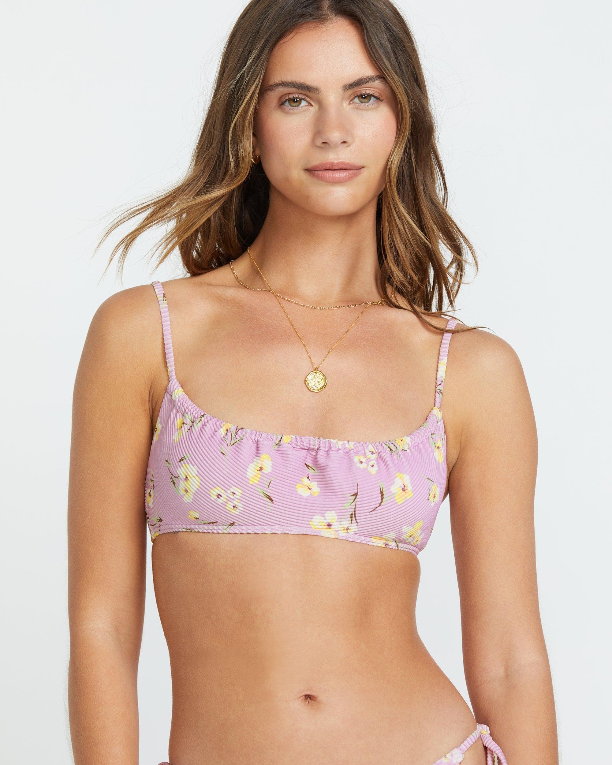 Crafted from partially recycled polyester blended with stretchy elastane, this bralette bikini top offers adjustable straps and shirring detail to ensure a flattering fit. Removable cups provide customized support for your poolside and seaside adventures. Featured here in the Amethyst Smoke colorway. Features Mila Bralette 91% Recycled Polyester / 9% Elastane Tanlines Rib O rings and sliders for adjustable straps with center back hook for closure Shirring detail at bust Removable cups Logo embroidery at wearers left back side seam