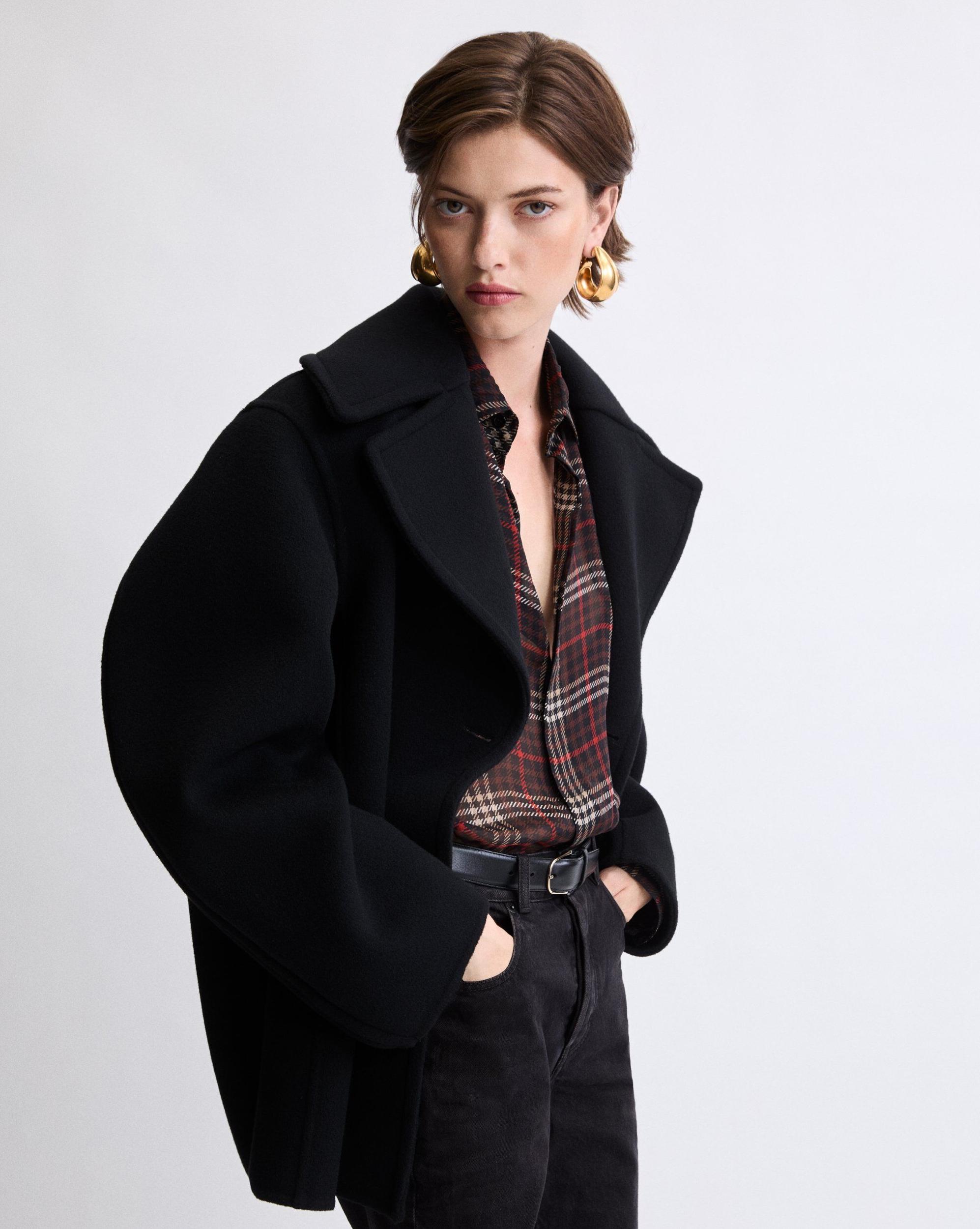 double-breasted, six-button peacoat made with double-faced certified wool, featuring an ulster collar.