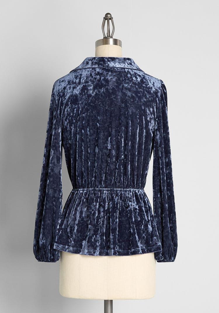 Thanks to its super soft, crushed velvet fabrication, you’ll be embodying effortless chic style in this winter blue top from our ModCloth namesake label. Luxe and vintage-inspired, this velvet shirt will have you smitten with its navy blue hue, 1970s-esque collar at the wrap-over surplice bodice, ruching at the long sleeve shoulders, an elasticized waist, and a subtle peplum hem. 92% Polyester, 8% SpandexHand washRuns true to sizeFabric provides stretchElasticized waist and sleeve cuffsImportedS=24 inches length1X=26 inches length
