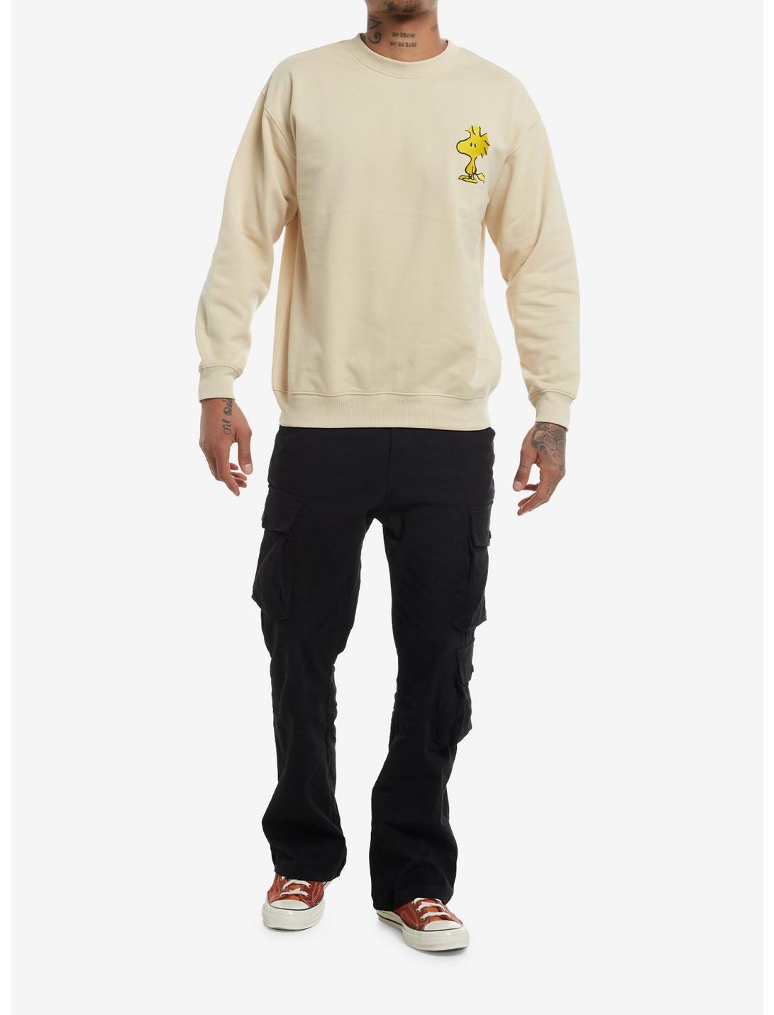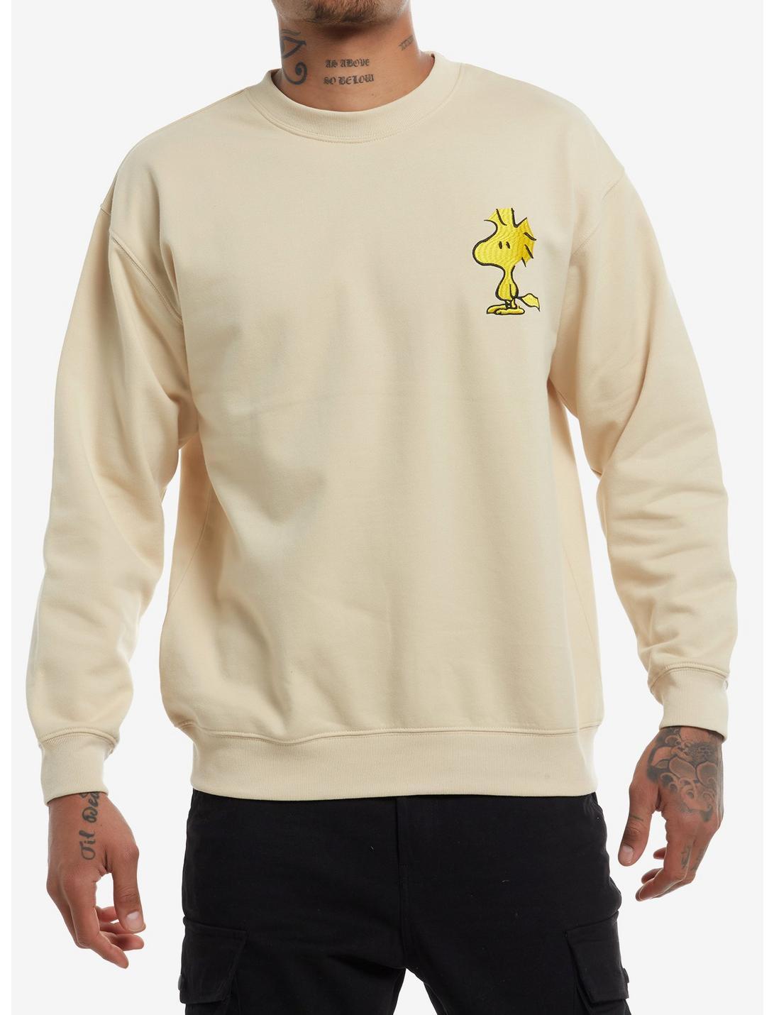 This beige crewneck sweatshirt from Peanuts has Woodstock embroidered on the front left chest and an image of Snoopy and Woodstock chilling together printed on the back.60% cotton; 40% polyesterWash cold; dry lowImportedListed in men's/unisex sizesModel is 6'1"Model wears size Medium