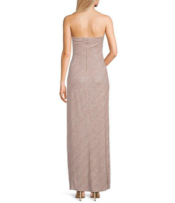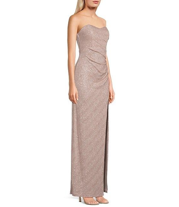 From Pear Culture, this gown features: Glitter fabrication Sweetheart strapless neckline Ruched faux wrap detail Long skirt with side slit Center back zip closure 50.5" center-back length Polyester/spandex; partially lined Hand wash/line dry Imported.