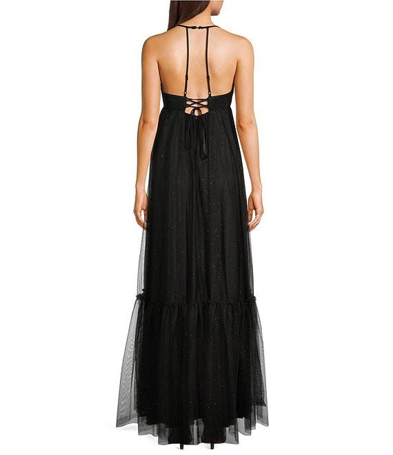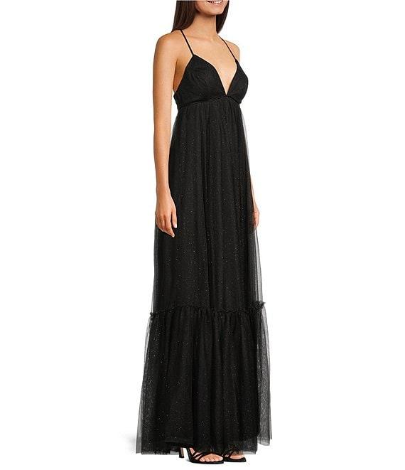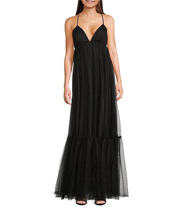 Pear Culture Mesh V-Neck Spaghetti Strap Tiered Dress