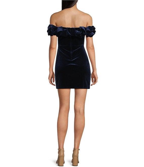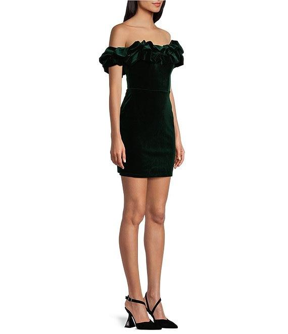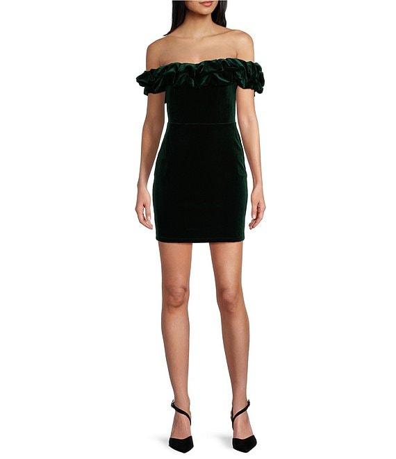 From Pear Culture, this dress features: Origami velvet fabric Ruffled off-the-shoulder neckline Sleeveless Zipper back closure Approx. 25" center back length Polyester/spandex Hand wash/dry flat Imported