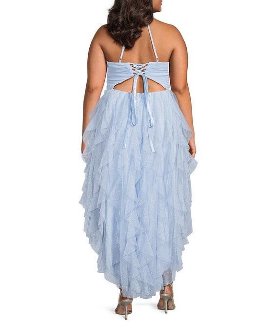 From Pear Culture Plus Size, this dress features: Glitter fabrication Scoop neckline Spaghetti straps Center back zip closure Caged back Corkscrew cascading ruffled skirt Hi-low hem 45" center-back length Polyester Hand wash/line dry Imported.