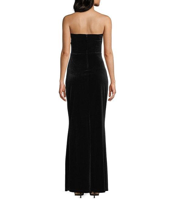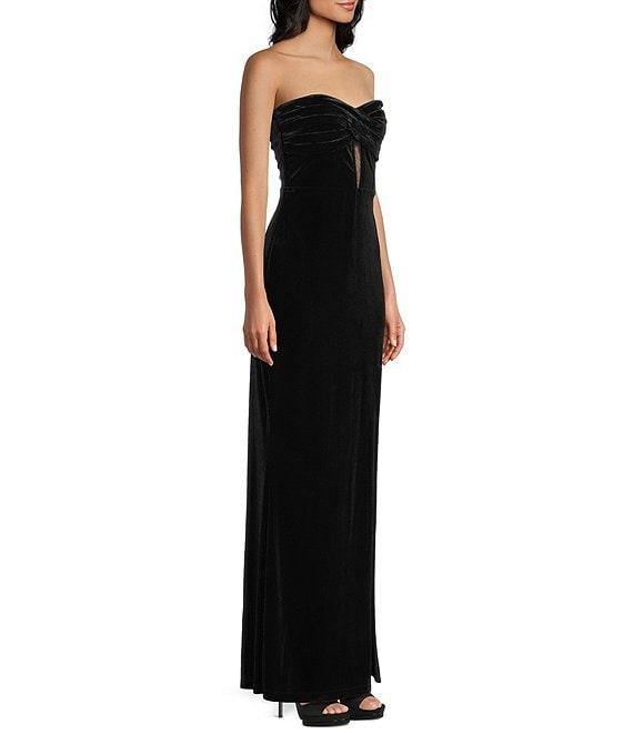 From Pear Culture, this dress features: Velvet fabric Strapless twist front neckline Illusion bodice Front slit Zip back closure 54" center back length Polyester/spandex; partially lined Hand wash; dry flat Imported.