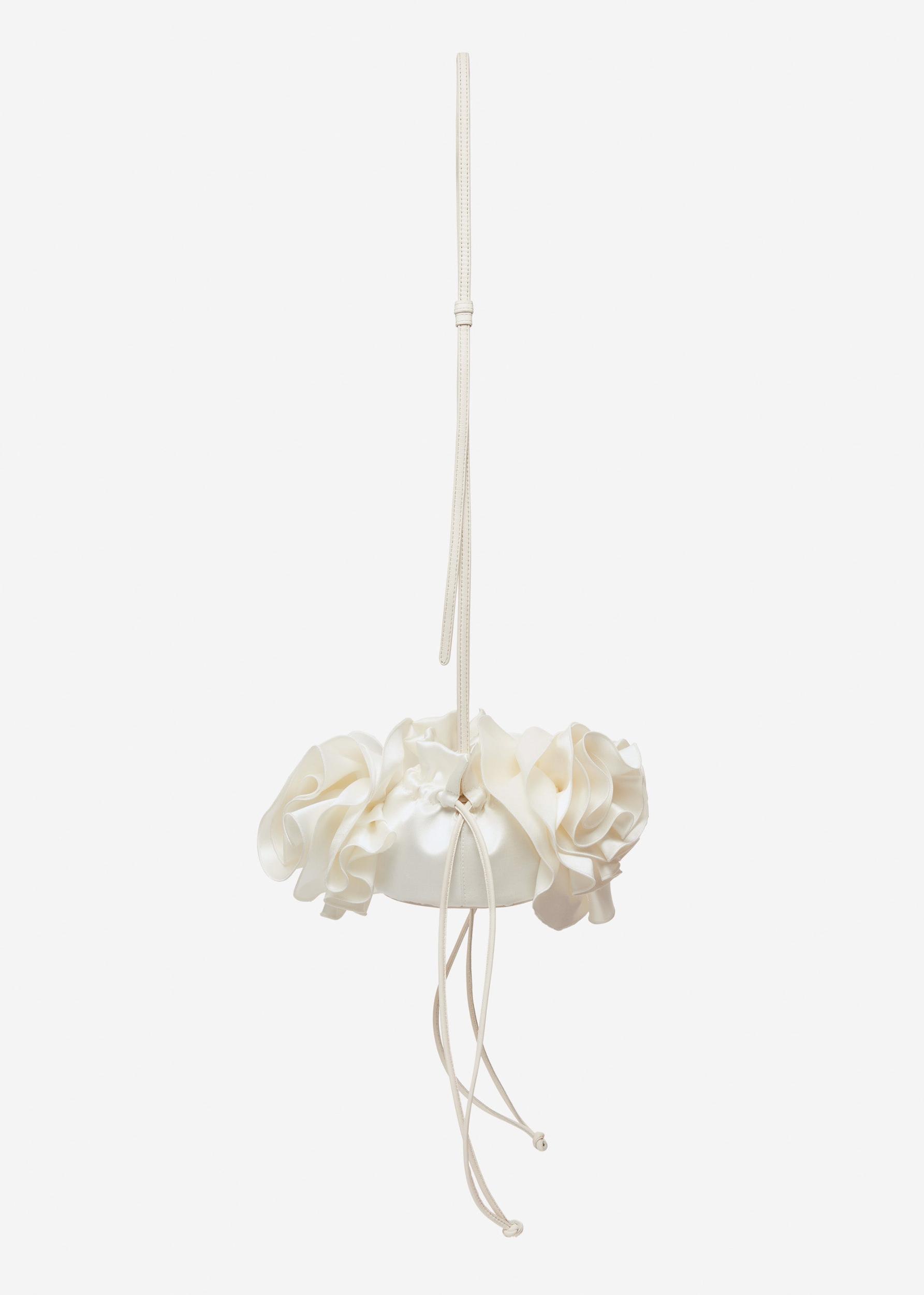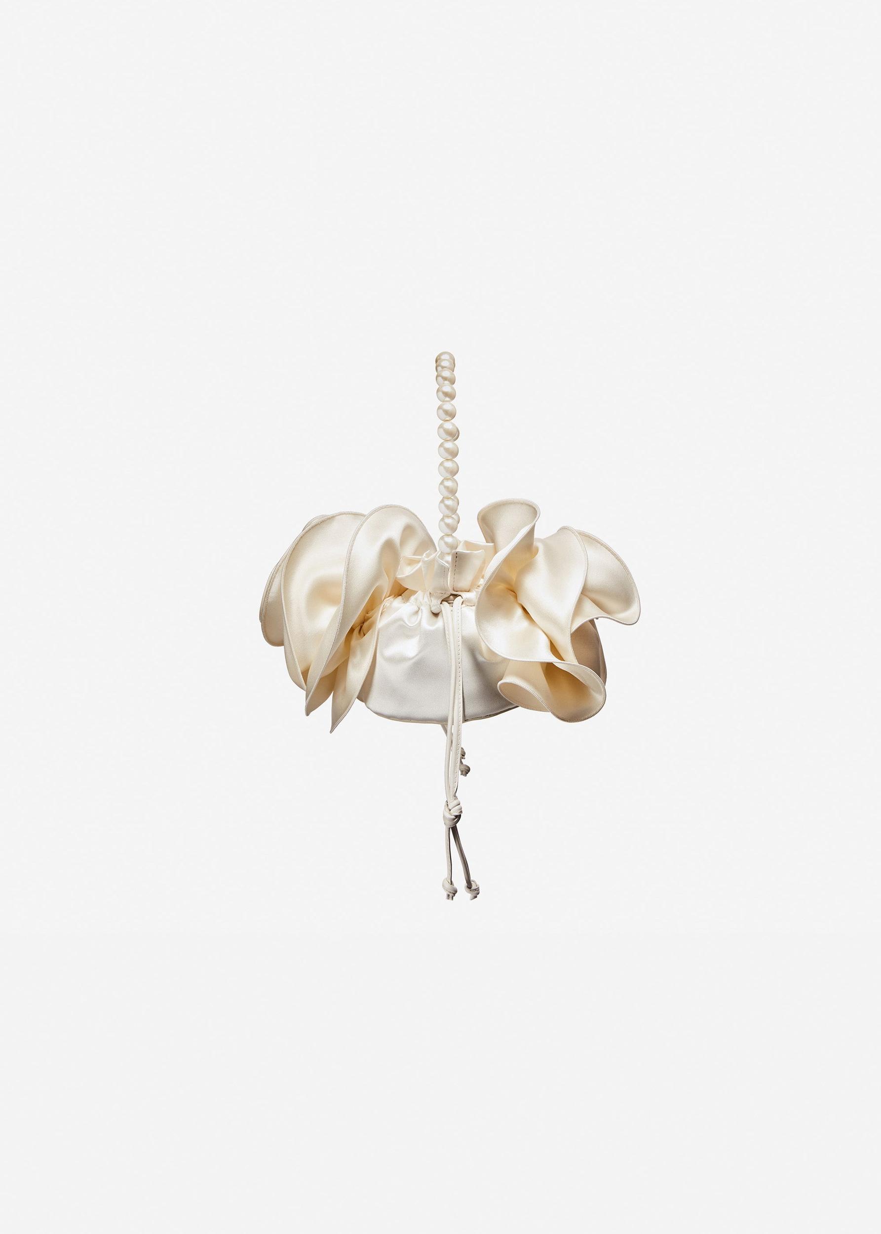 The Magda bag is Magda Butrym's iconic handbag: a bucket bag adorned with large 3D roses on either side of the body. The classic silk version has a satin body and flowers. This limited edition has an additional pearl handle, so that the wearer can choose between a pearl handle or a detachable classic leather crossbody strap.