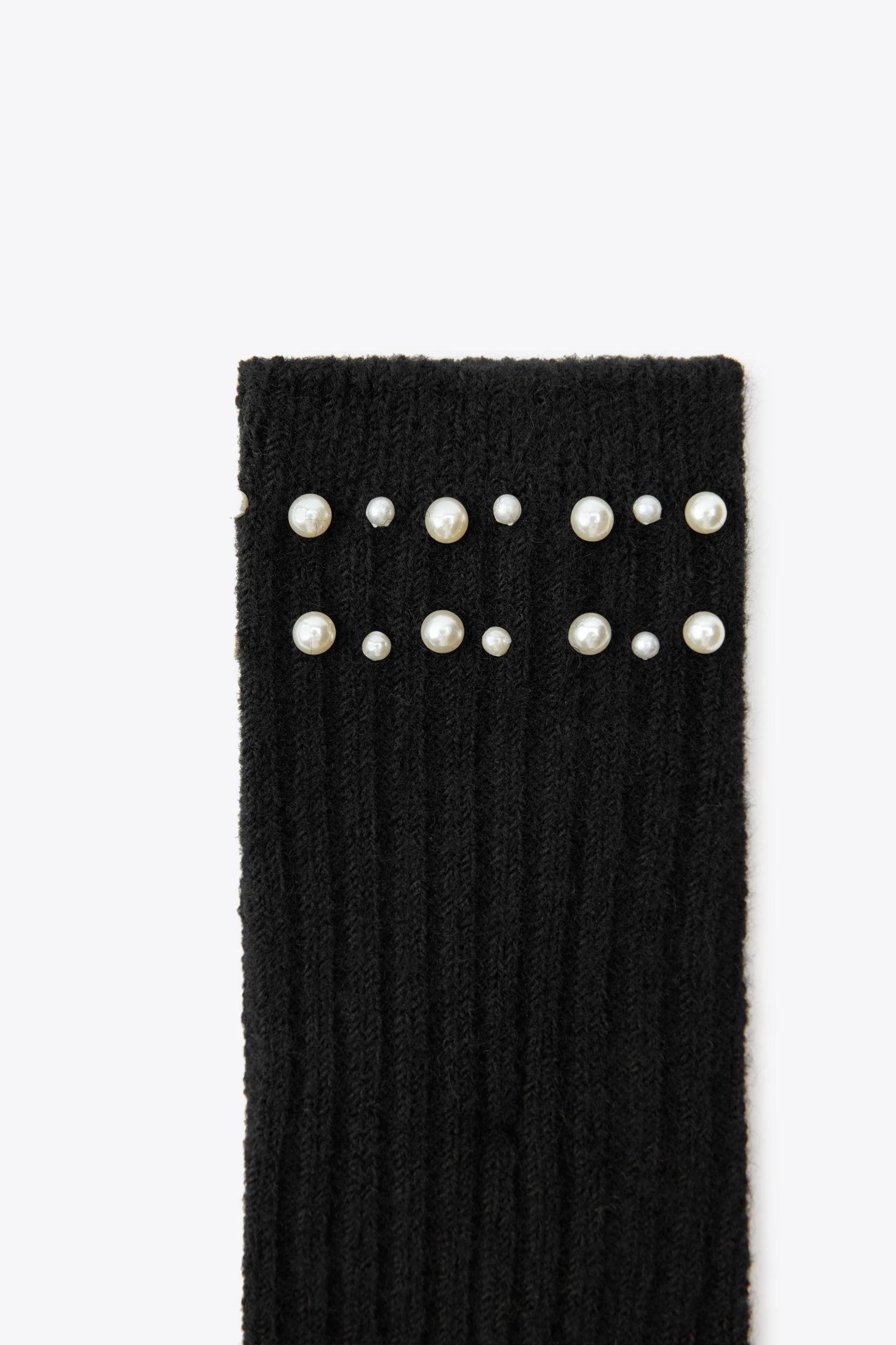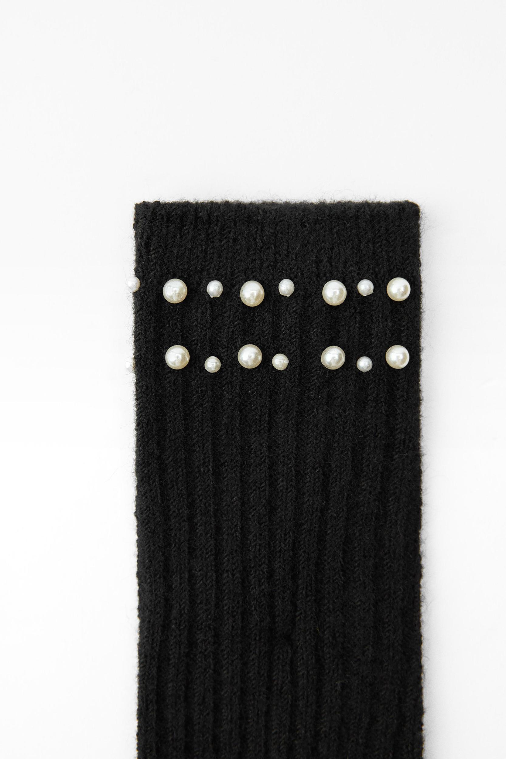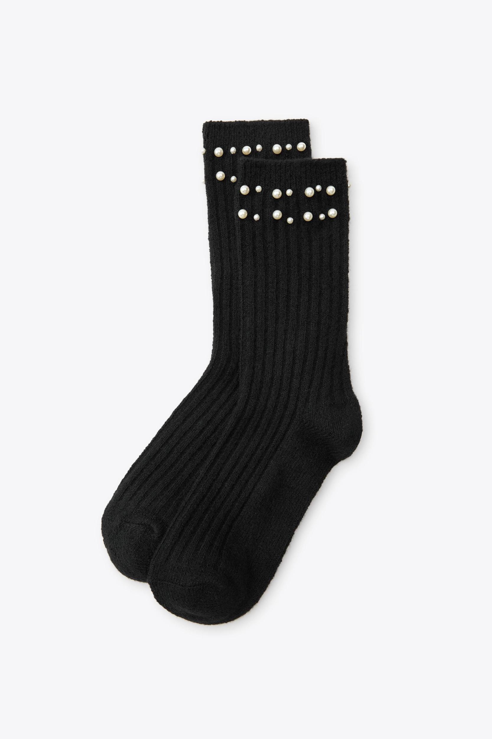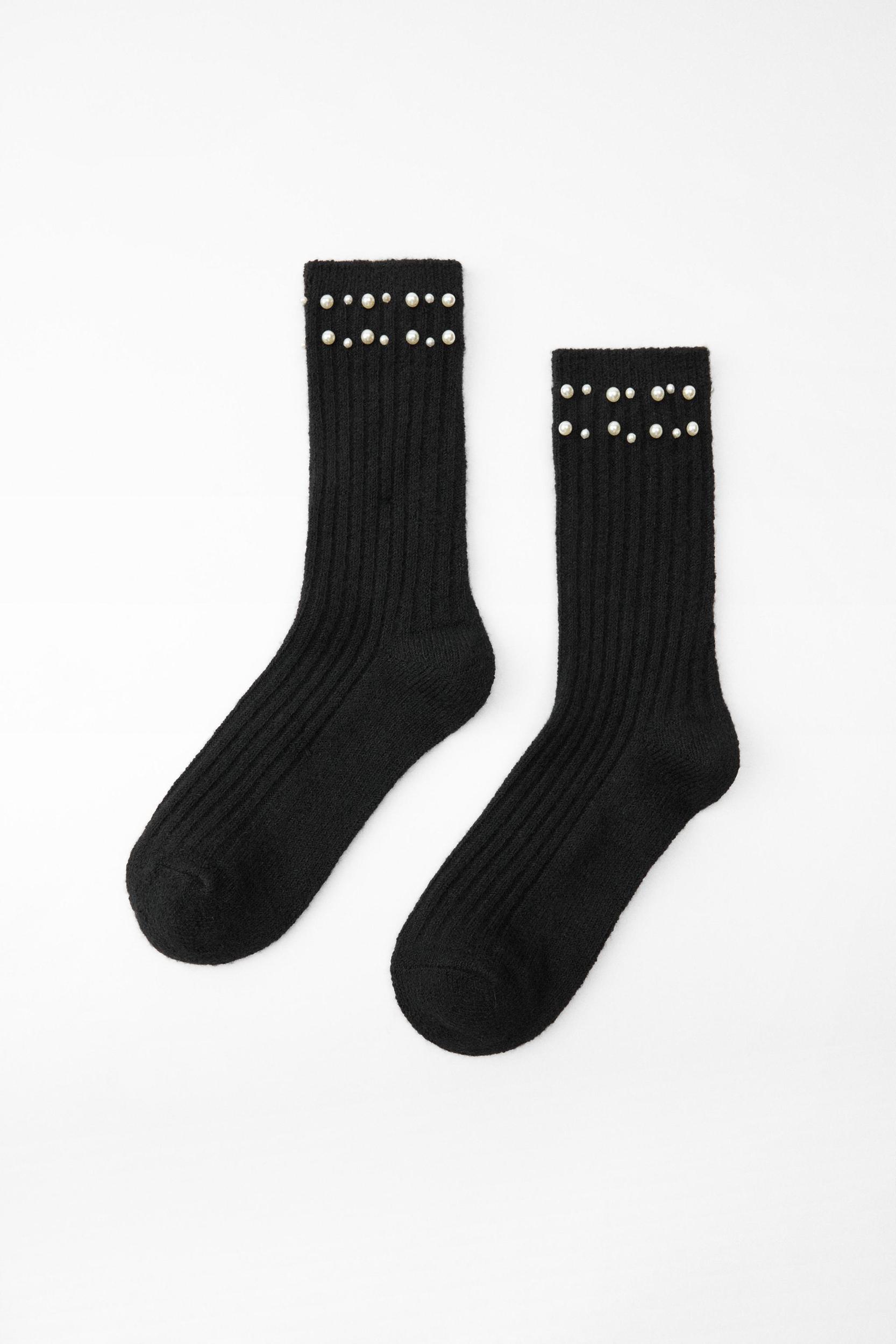 Socks made of a fabric blend with 9% wool. Faux pearl appliqué.