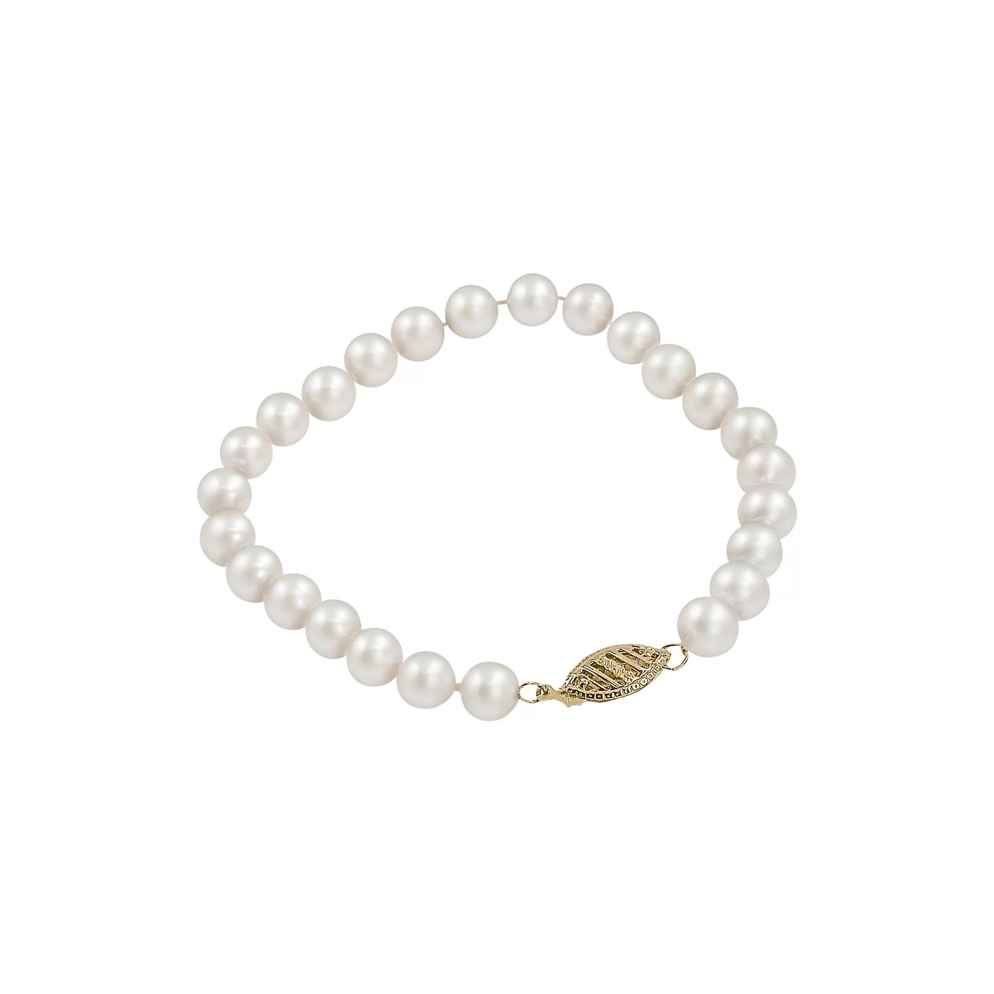 Add a timeless touch to your ensemble with this beautiful freshwater cultured pearl bracelet. Comes in a gift box.Bracelet Details: Length: 7 in. Clasp: safety Metal: 10k gold Features: filigree claspCultured Pearl Details: Type: freshwater Shape: round Size: 5-5.5 mm Color: whiteGemstones may have been treated to enhance their appearance. Special care may be required. Please visit our Gemstone Treatment & Special Care Guide for more information. Size: 7". Gender: female. Age Group: adult.