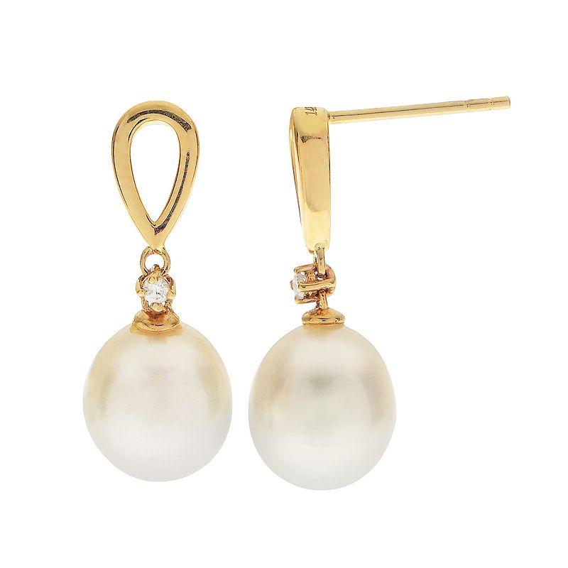 Decorated with lustrous oval-shaped freshwater cultured pearls and shimmering diamond accents, these 10k gold drop earrings offer a luxurious way to update your ensemble.EARRING DETAILSLength:.87 in. Backings: postMetal: 10k gold Finish: polishedPackaging: boxedCULTURED PEARL DETAILSType: freshwaterShape: ovalSize: 8-9 mm Color: whiteDIAMOND DETAILSTotal weight: less than 1/10 ct.Shape: roundColor grade: H-IClarity: I2-I3Gemstones may have been treated to enhance their appearance. Special care may be required. Please visit our Gemstone Treatment & Special Care Guide for more information.Image(s) may be enlarged to show detail.Diamond weights are approximate. Diamond total weights may vary between .01 and .08 ct. Some diamonds have fewer than 17 facets. Size: One Size. Gender: female. Age Group: adult.